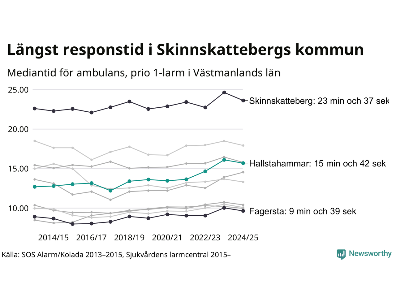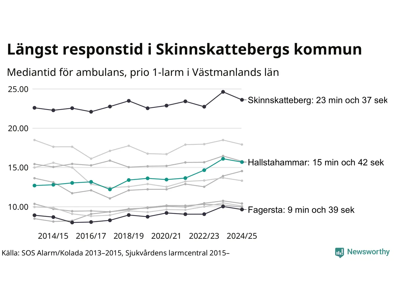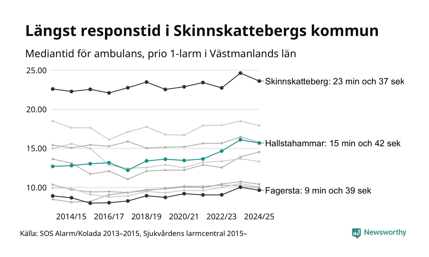 Hallstahammar tillhör inte de kommuner i Region Västmanland som får vänta längst på ambulans – men inte heller de som får snabbast hjälp. Längst är väntetiden i Skinnskattebergs kommun: 23 minuter och 37 sekunder. Snabbast var ambulansen framme i Fagersta, där det tog 9 minuter och 39 sekunder från larmsamtalet 2024/2025.
