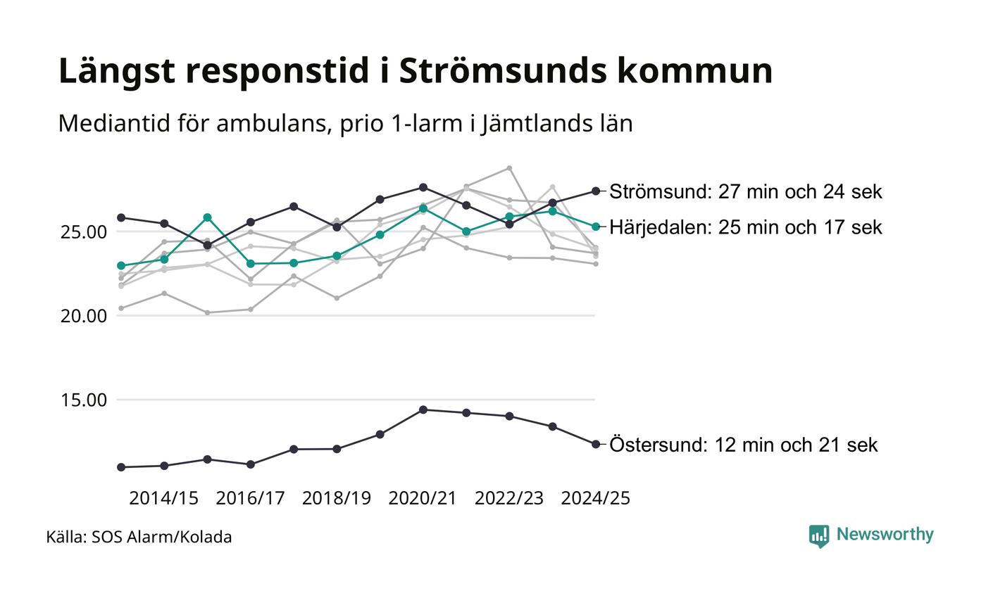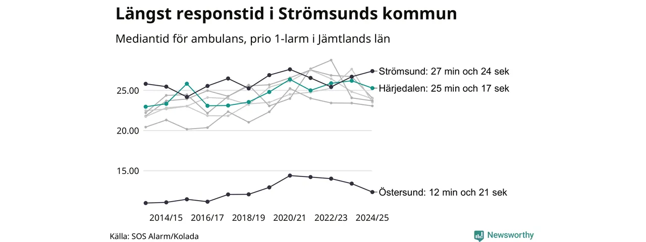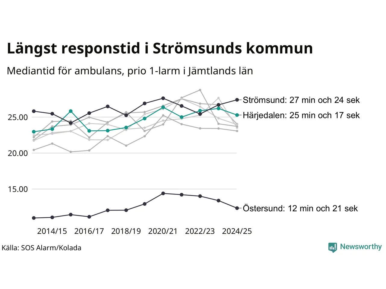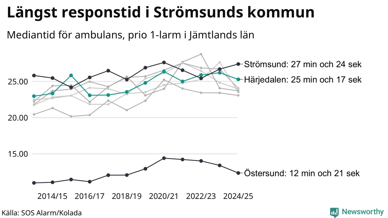 Det tar 25 minuter och 17 sekunder från att 112-samtalet når larmcentralen till att ambulansen är på plats i Härjedalens kommun. Det visar de senaste siffrorna från SOS Alarm. Tiden är en mediantid för alla prio 1-larm mellan 1 juni 2024 och 31 maj 2025 och ett nyckeltal som redovisas varje år.