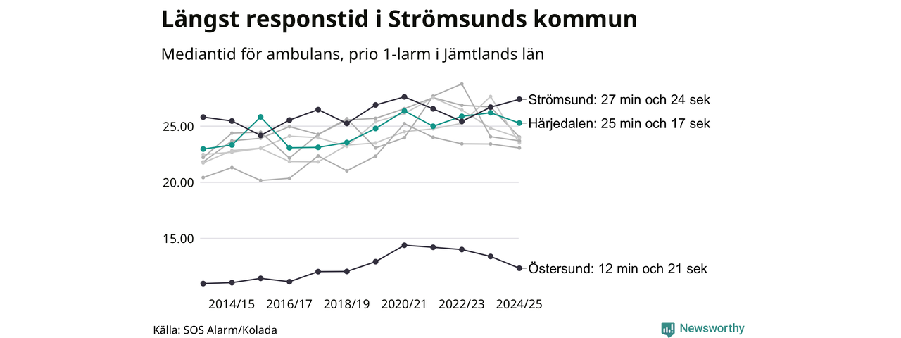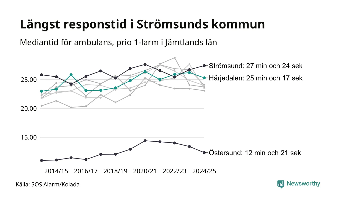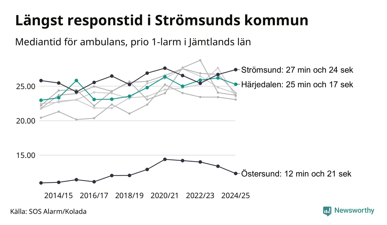 Det tar 25 minuter och 17 sekunder från att 112-samtalet når larmcentralen till att ambulansen är på plats i Härjedalens kommun. Det visar de senaste siffrorna från SOS Alarm. Tiden är en mediantid för alla prio 1-larm mellan 1 juni 2024 och 31 maj 2025 och ett nyckeltal som redovisas varje år.