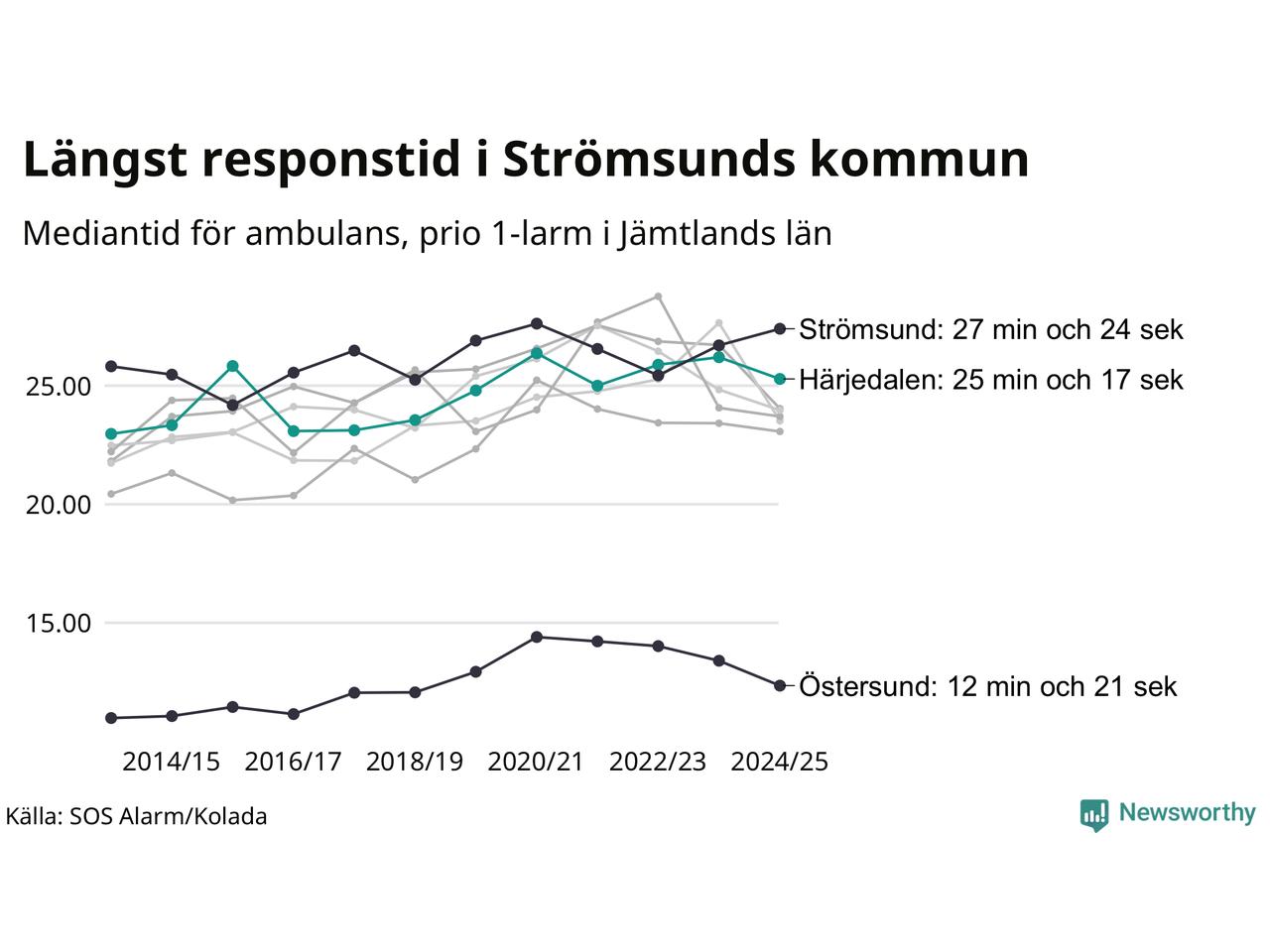 Förutom Strömsund återfinns även Härjedalen bland de tio kommuner där ambulansen dröjer längst i landet. Längst är väntan på ambulans i Pajala kommun, 37 minuter och 55 sekunder. Kommunerna med längst responstid finns i Norrlands inland eller i glesbygd.