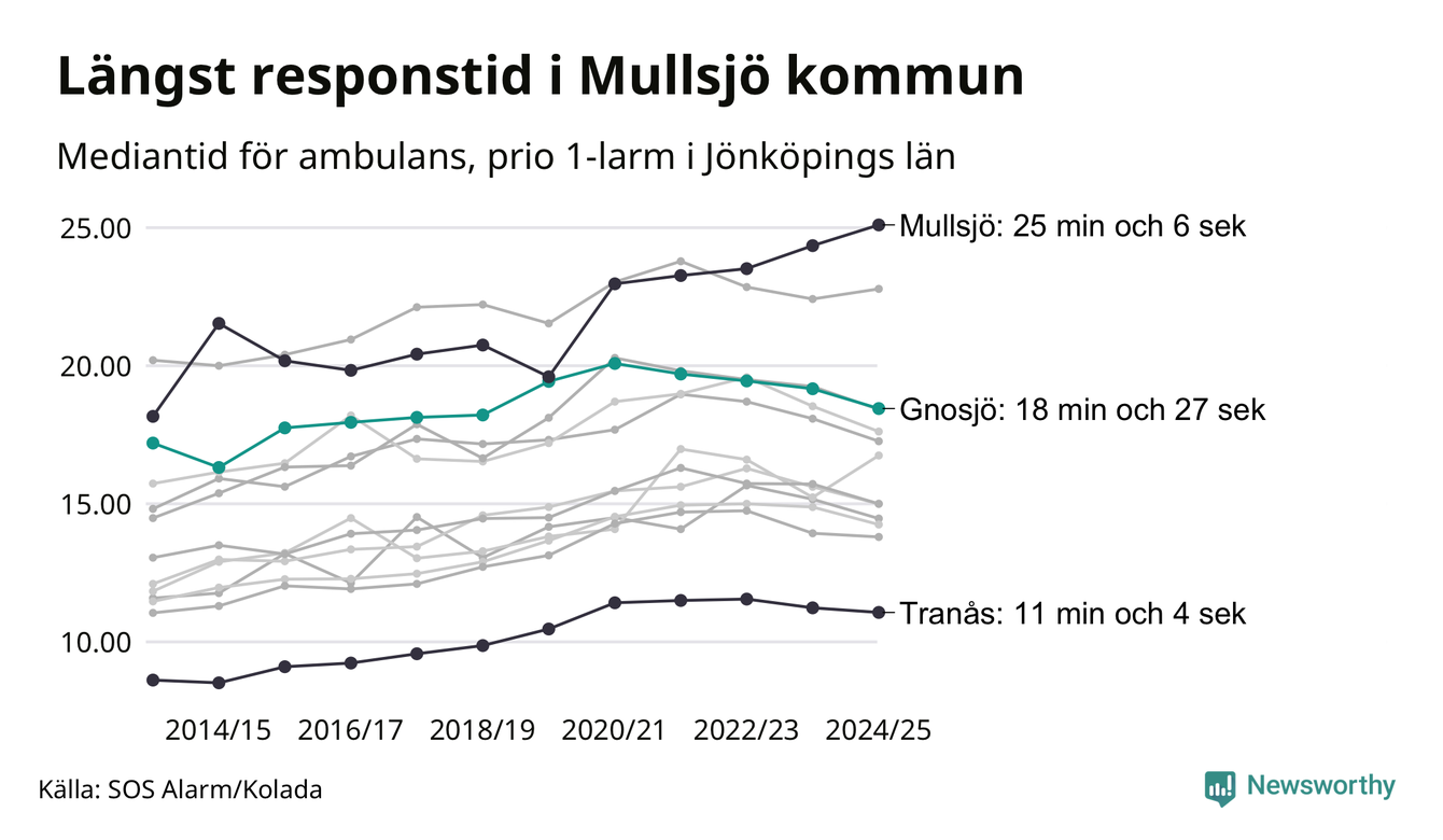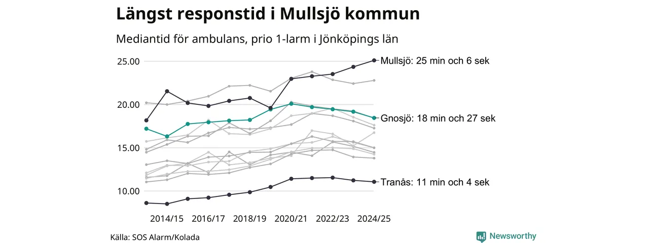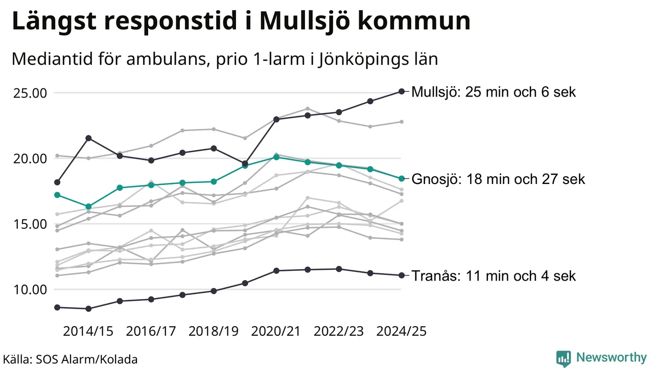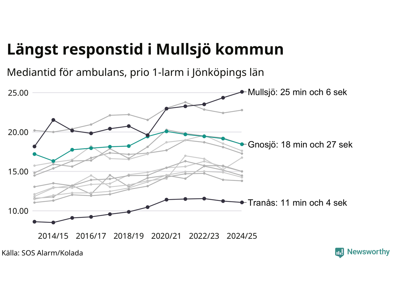 Gnosjö tillhör de kommuner i Region Jönköping som får vänta längst på ambulansen. Längst är väntetiden i Mullsjö kommun, som också tillhör de tio kommuner i landet som får vänta längst på ambulans: 25 minuter och 6 sekunder. Snabbast var ambulansen framme i Tranås, där det tog 11 minuter och 4 sekunder från larmsamtalet 2024/2025.