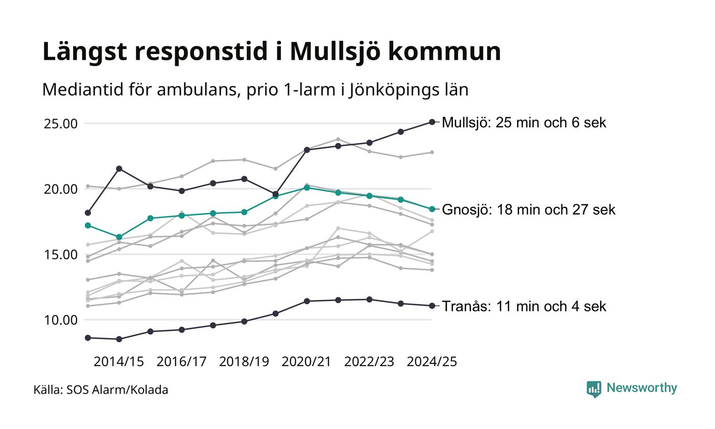 Det tar 18 minuter och 27 sekunder från att 112-samtalet når larmcentralen till att ambulansen är på plats i Gnosjö kommun. Det visar de senaste siffrorna från SOS Alarm. Tiden är en mediantid för alla prio 1-larm mellan 1 juni 2024 och 31 maj 2025 och ett nyckeltal som redovisas varje år.