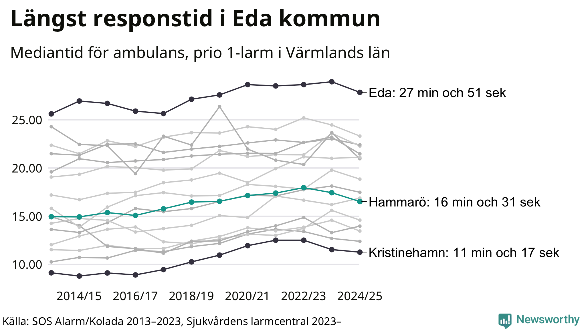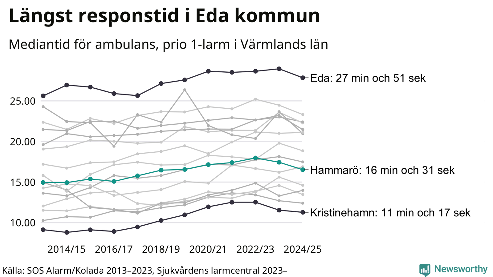 Eda är alltså en av de kommuner som får vänta längst på ambulans i landet. Längst är väntan på ambulans i Pajala kommun, 37 minuter och 55 sekunder. Kommunerna med längst responstid finns i Norrlands inland eller i glesbygd.