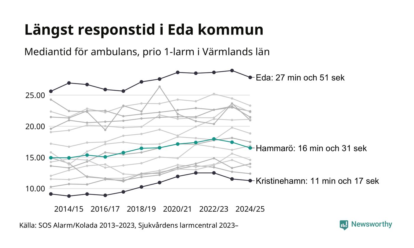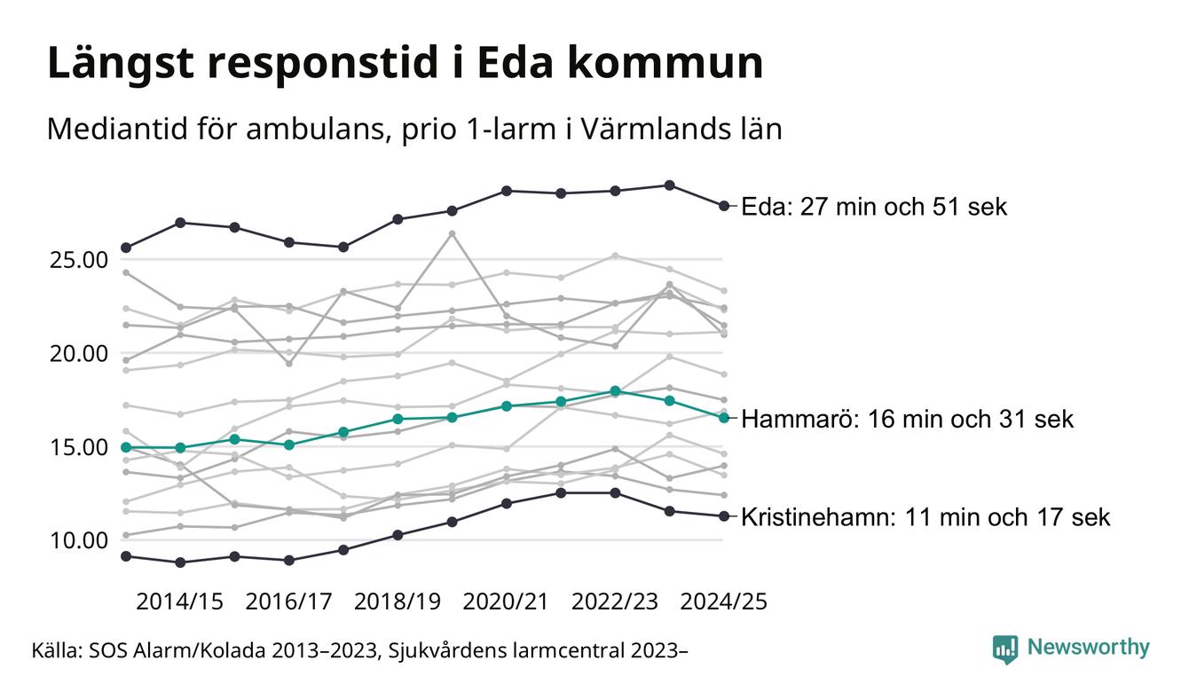 Det tar 16 minuter och 31 sekunder från att 112-samtalet når larmcentralen till att ambulansen är på plats i Hammarö kommun. Det visar de senaste siffrorna från Sjukvårdens larmcentral. Tiden är en mediantid för alla prio 1-larm mellan 1 juni 2024 och 31 maj 2025 och ett nyckeltal som redovisas varje år.