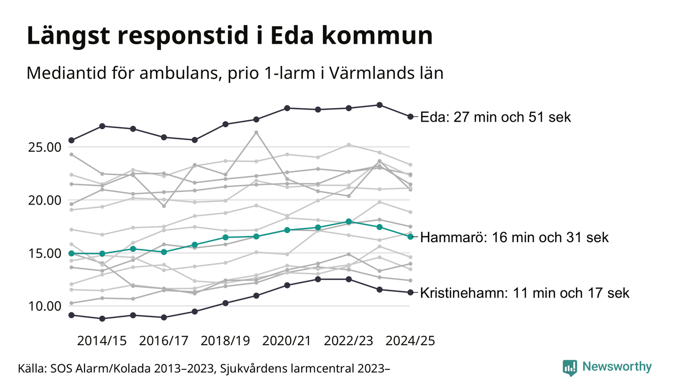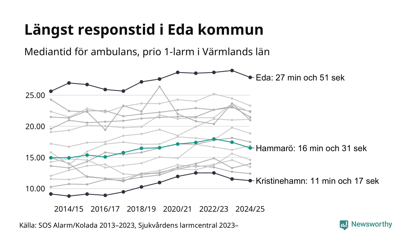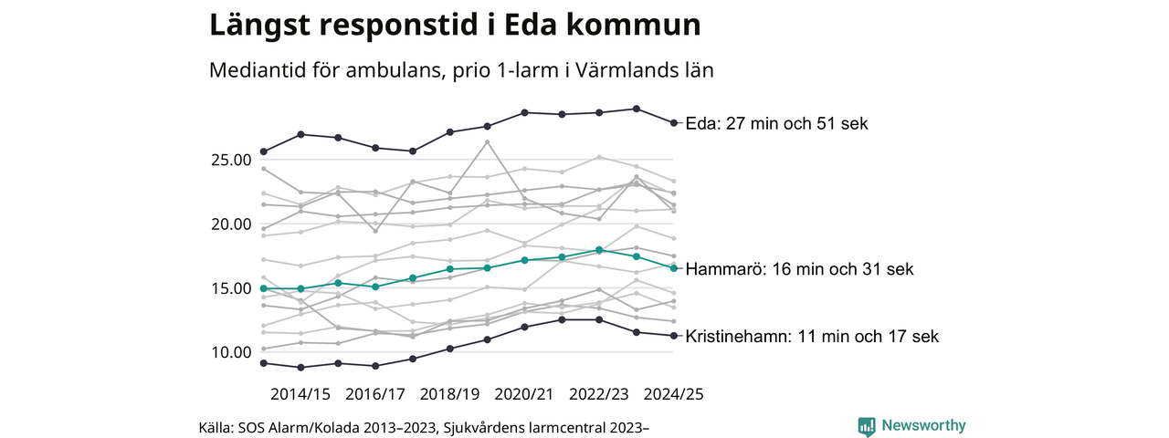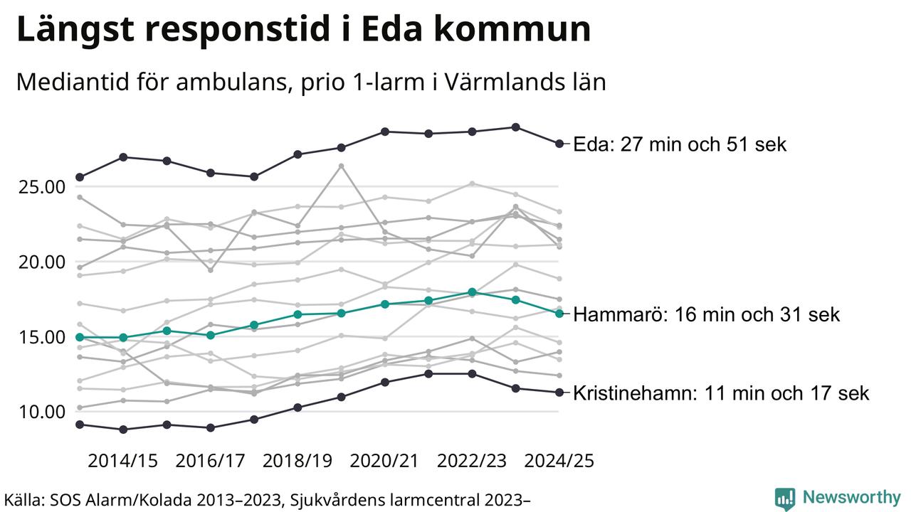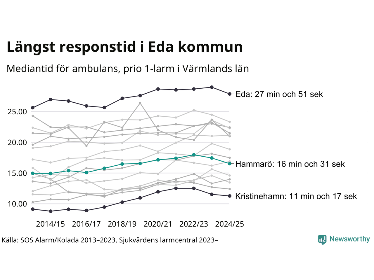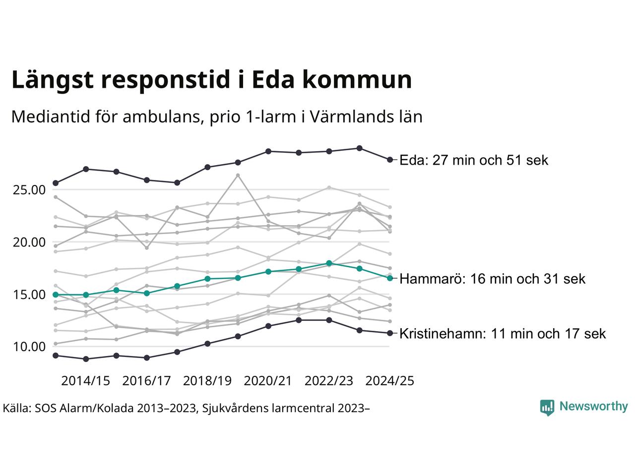 Hammarö tillhör inte de kommuner i Region Värmland som får vänta längst på ambulans – men inte heller de som får snabbast hjälp. Längst är väntetiden i Eda kommun, som också tillhör de tio kommuner i landet som får vänta längst på ambulans: 27 minuter och 51 sekunder. Snabbast var ambulansen framme i Kristinehamn, där det tog 11 minuter och 17 sekunder från larmsamtalet 2024/2025.