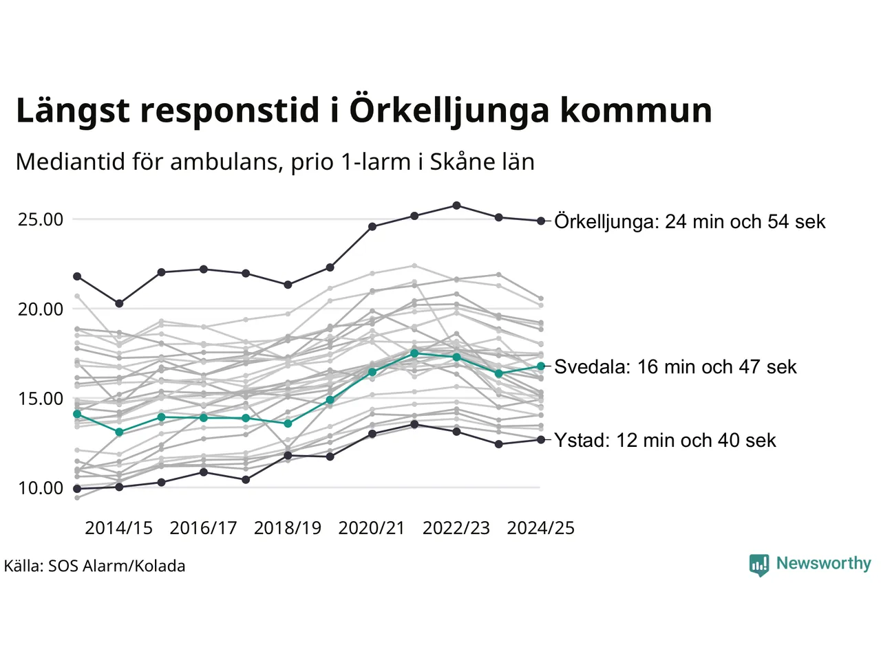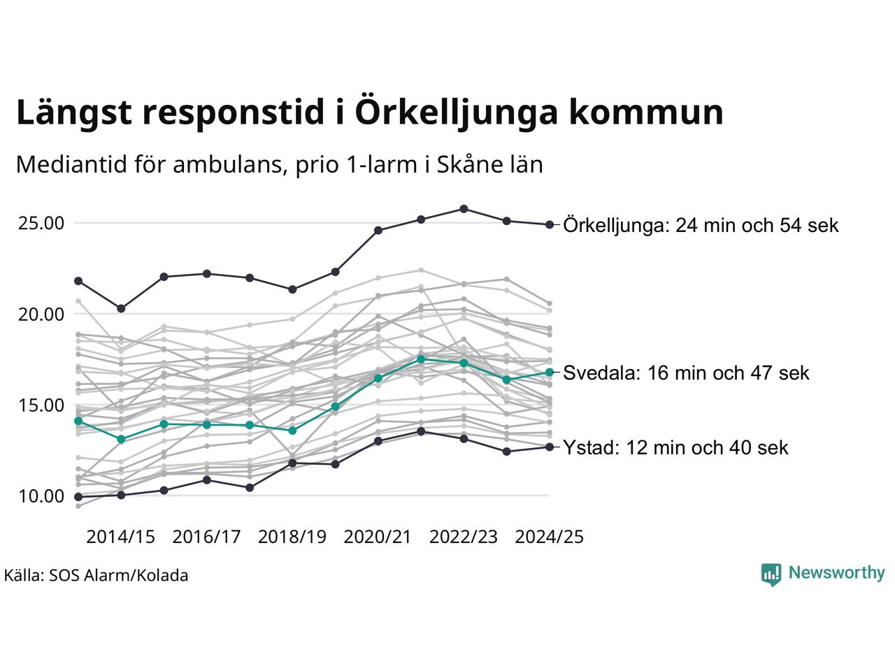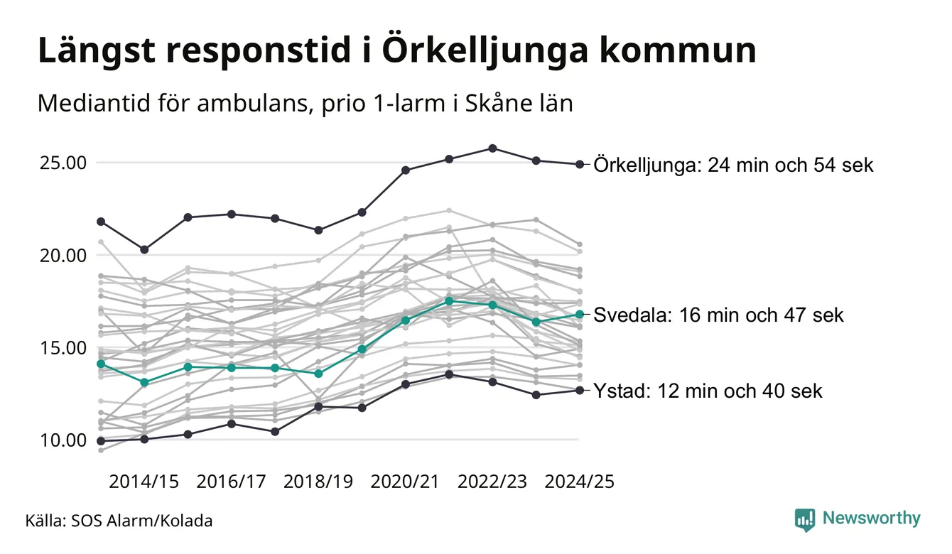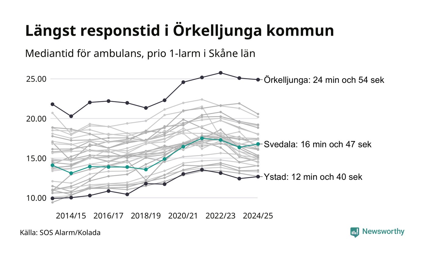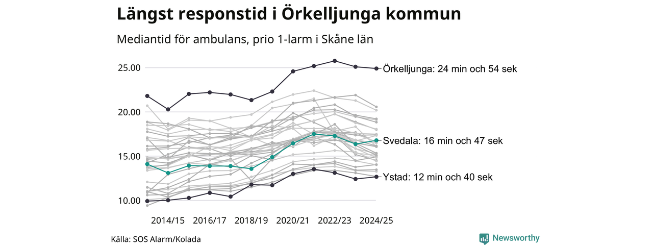 Det tar 16 minuter och 47 sekunder från att 112-samtalet når larmcentralen till att ambulansen är på plats i Svedala kommun. Det visar de senaste siffrorna från SOS Alarm. Tiden är en mediantid för alla prio 1-larm mellan 1 juni 2024 och 31 maj 2025 och ett nyckeltal som redovisas varje år.