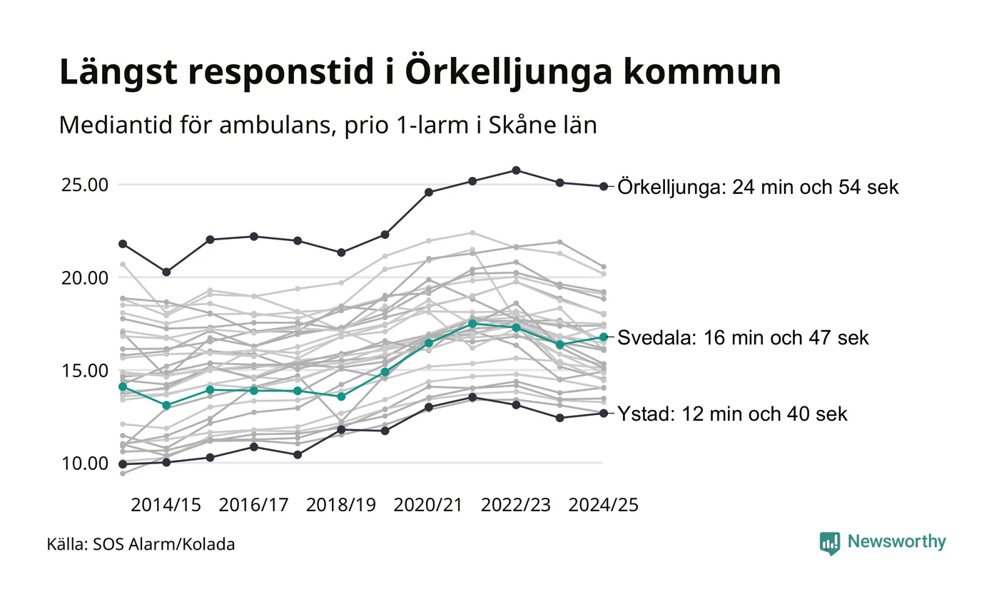 Svedala tillhör inte de kommuner i Region Skåne som får vänta längst på ambulans – men inte heller de som får snabbast hjälp. Längst är väntetiden i Örkelljunga kommun: 24 minuter och 54 sekunder. Snabbast var ambulansen framme i Ystad, där det tog 12 minuter och 40 sekunder från larmsamtalet 2024/2025.