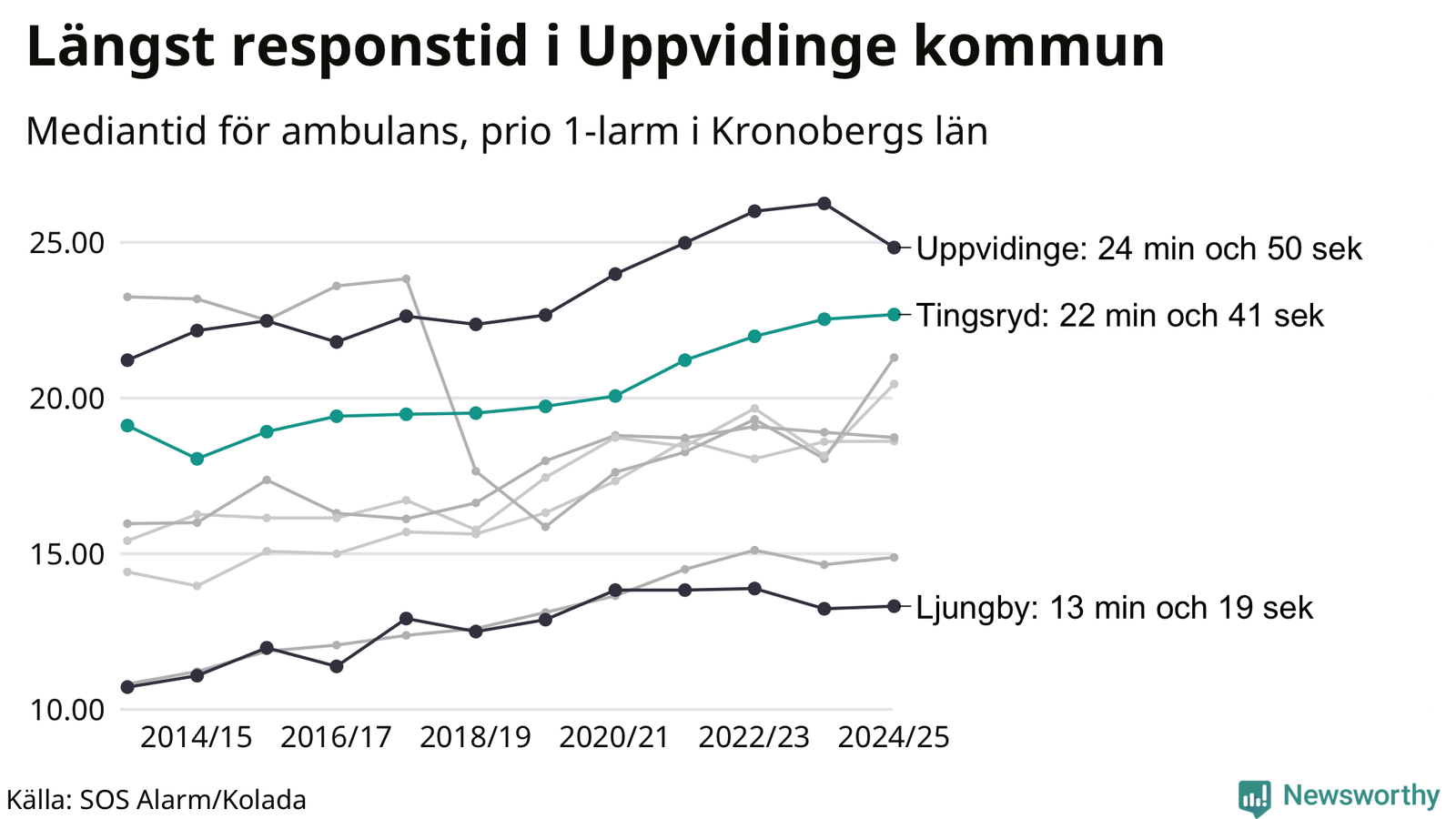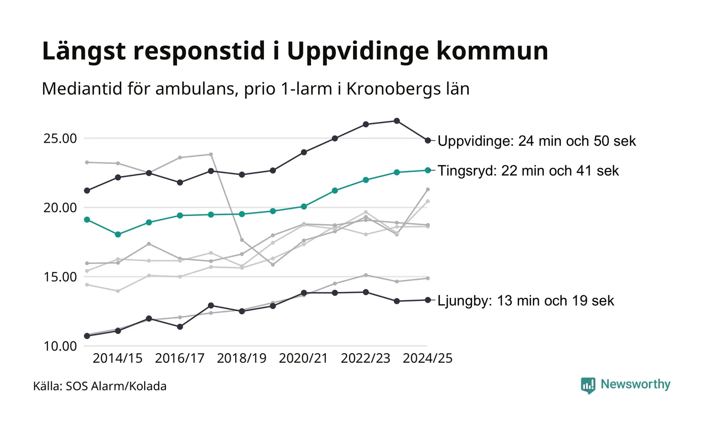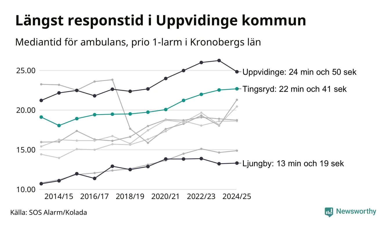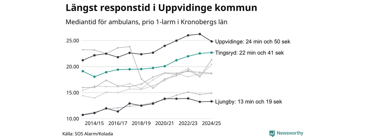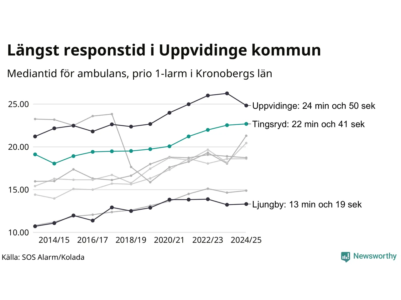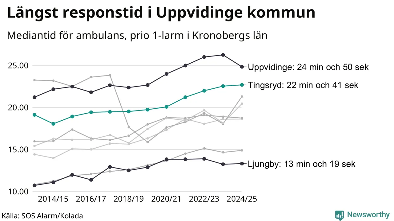 Det tar 22 minuter och 41 sekunder från att 112-samtalet når larmcentralen till att ambulansen är på plats i Tingsryds kommun. Det visar de senaste siffrorna från SOS Alarm. Tiden är en mediantid för alla prio 1-larm mellan 1 juni 2024 och 31 maj 2025 och ett nyckeltal som redovisas varje år.