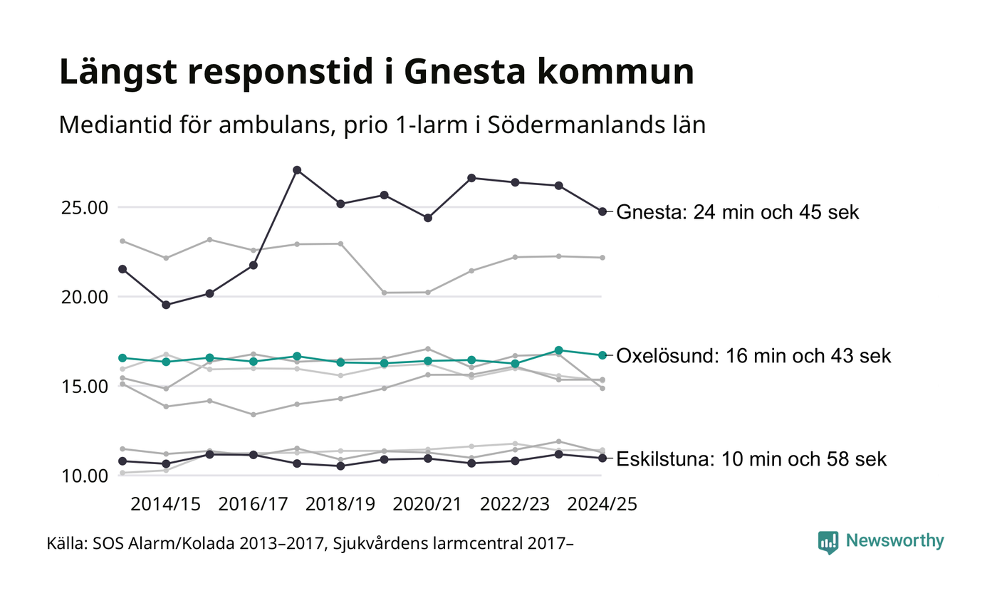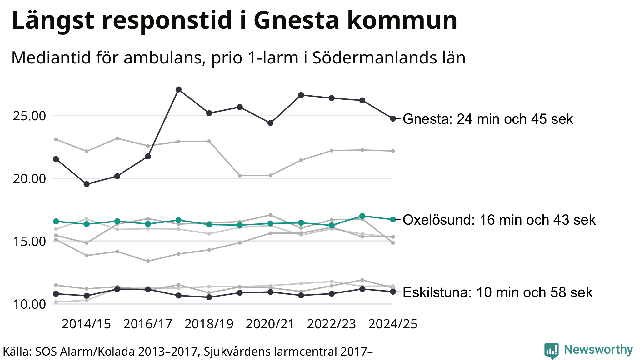 Det tar 16 minuter och 43 sekunder från att 112-samtalet når larmcentralen till att ambulansen är på plats i Oxelösunds kommun. Det visar de senaste siffrorna från Sjukvårdens larmcentral. Tiden är en mediantid för alla prio 1-larm mellan 1 juni 2024 och 31 maj 2025 och ett nyckeltal som redovisas varje år.