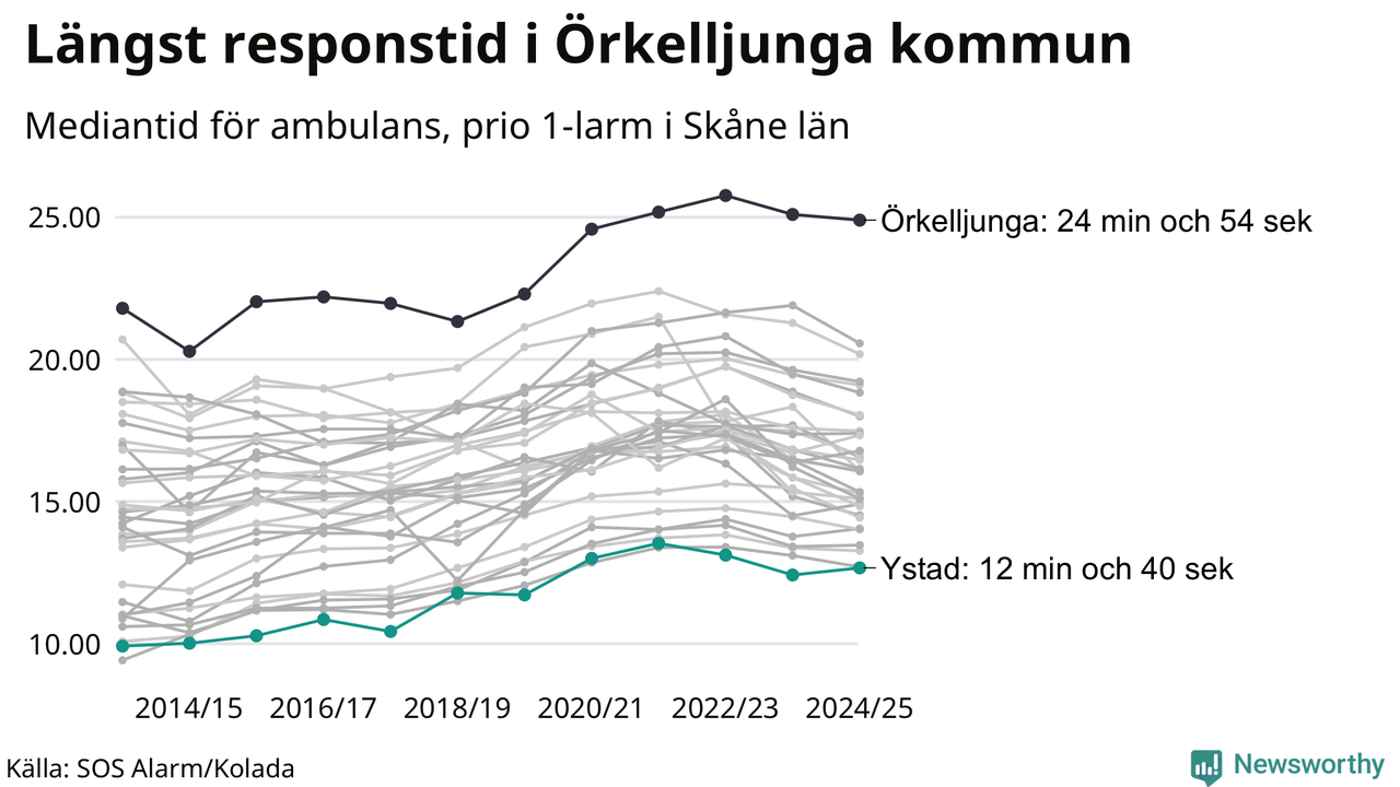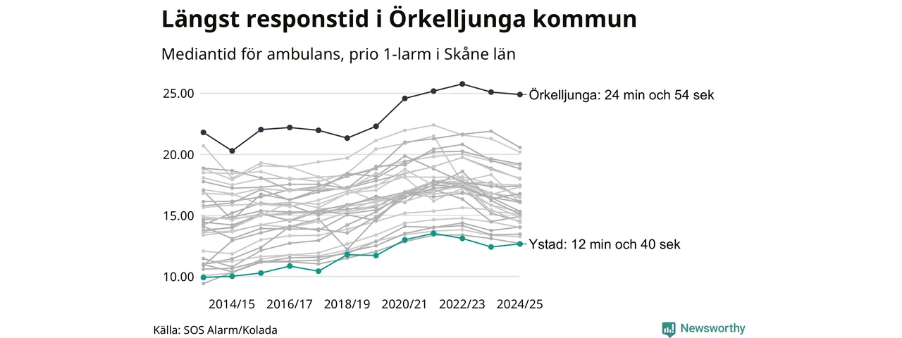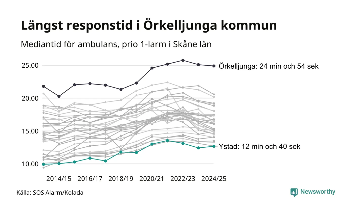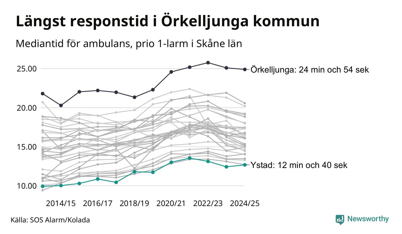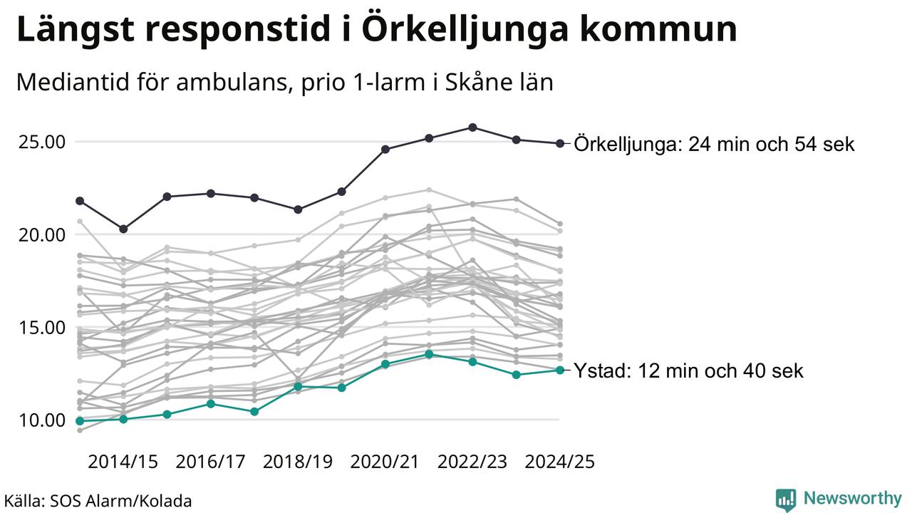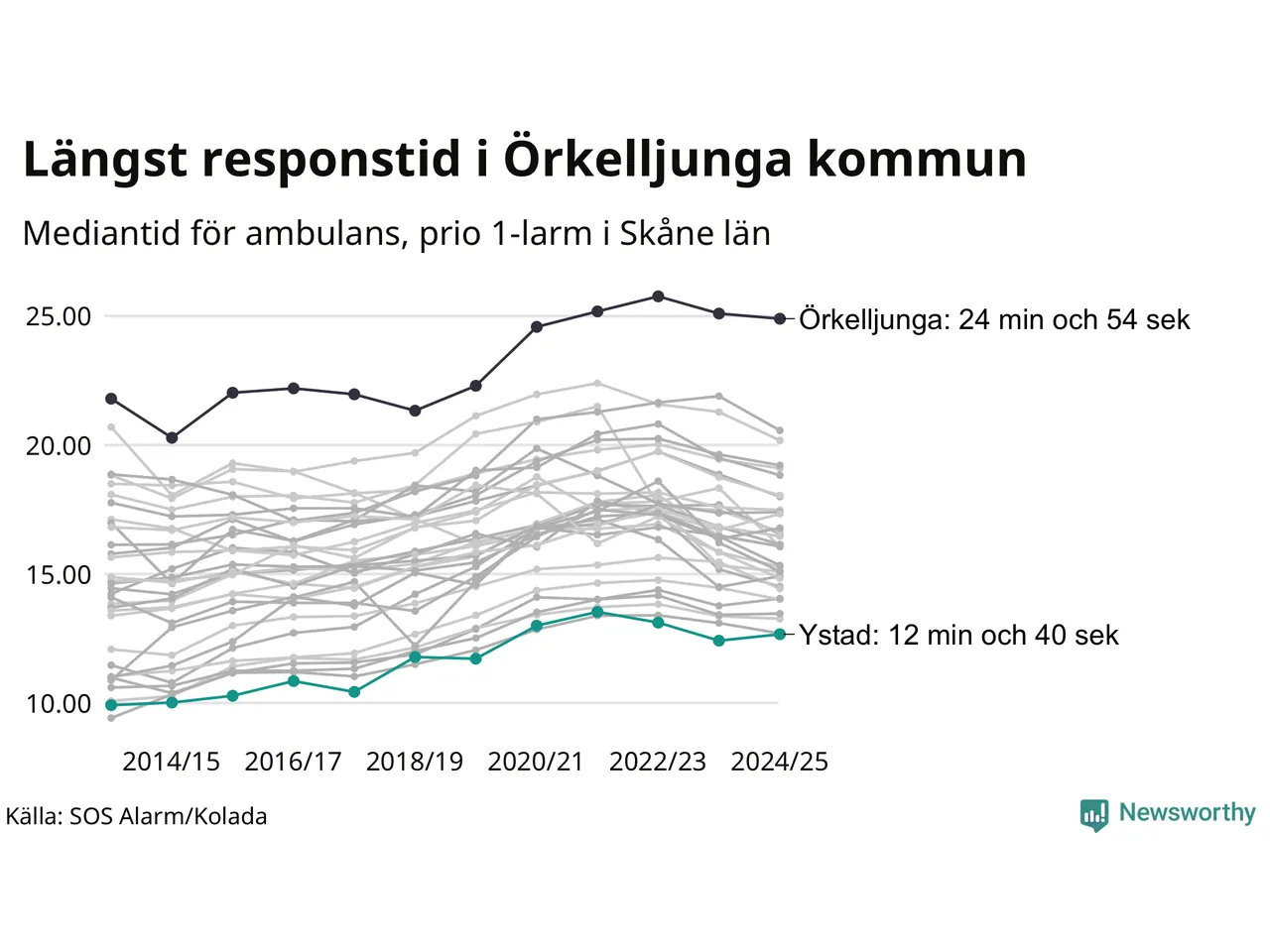 Det tar 12 minuter och 40 sekunder från att 112-samtalet når larmcentralen till att ambulansen är på plats i Ystads kommun. Det visar de senaste siffrorna från SOS Alarm. Tiden är en mediantid för alla prio 1-larm mellan 1 juni 2024 och 31 maj 2025 och ett nyckeltal som redovisas varje år.