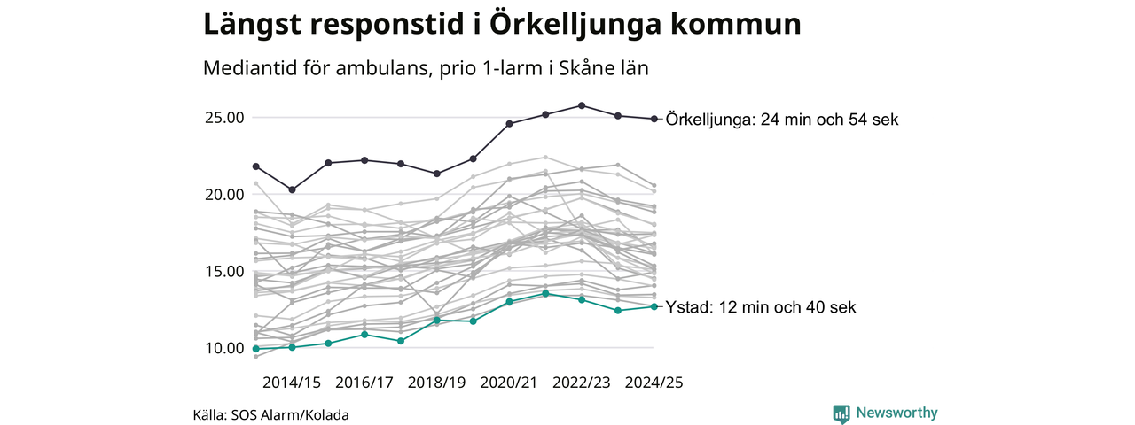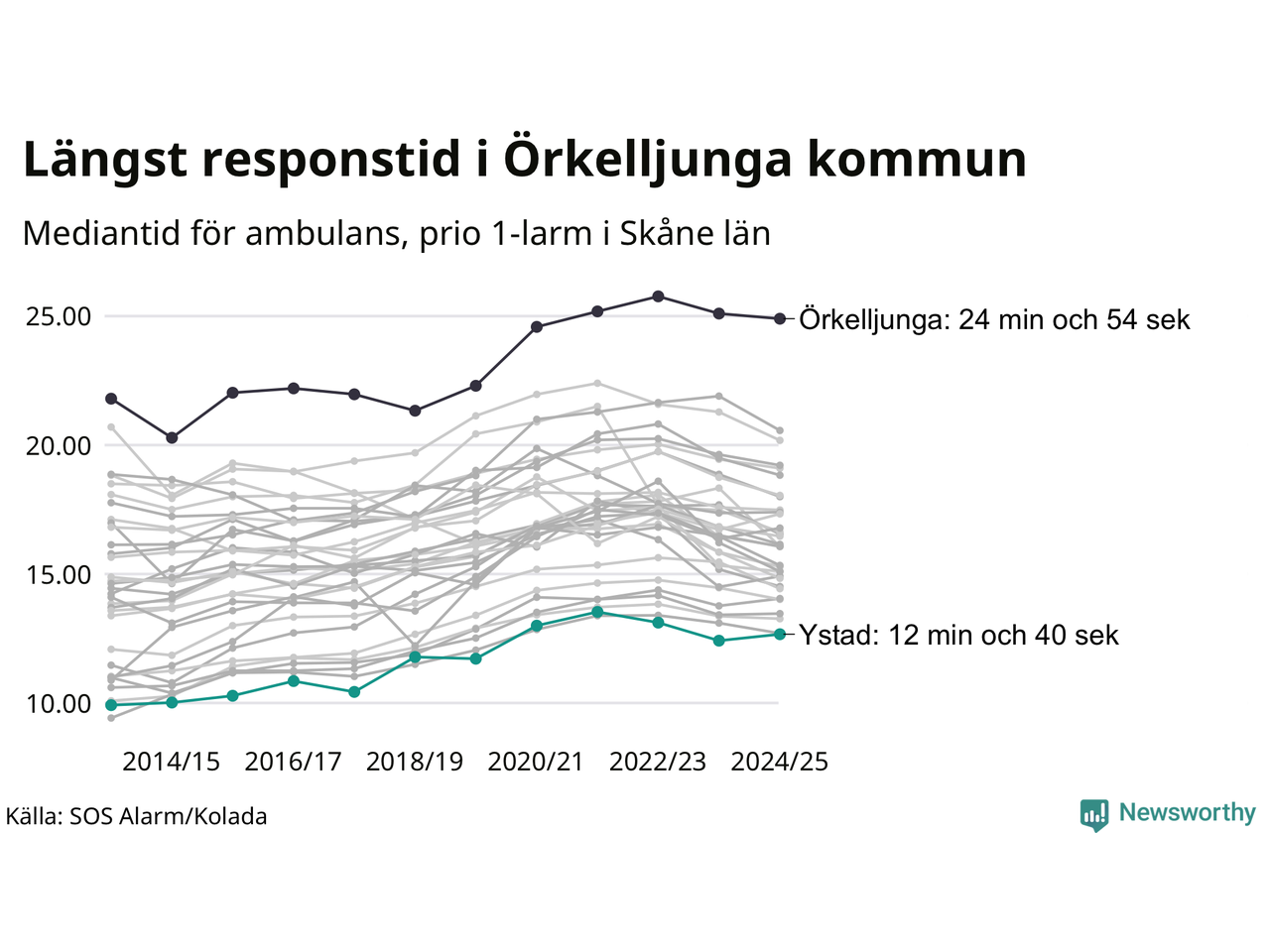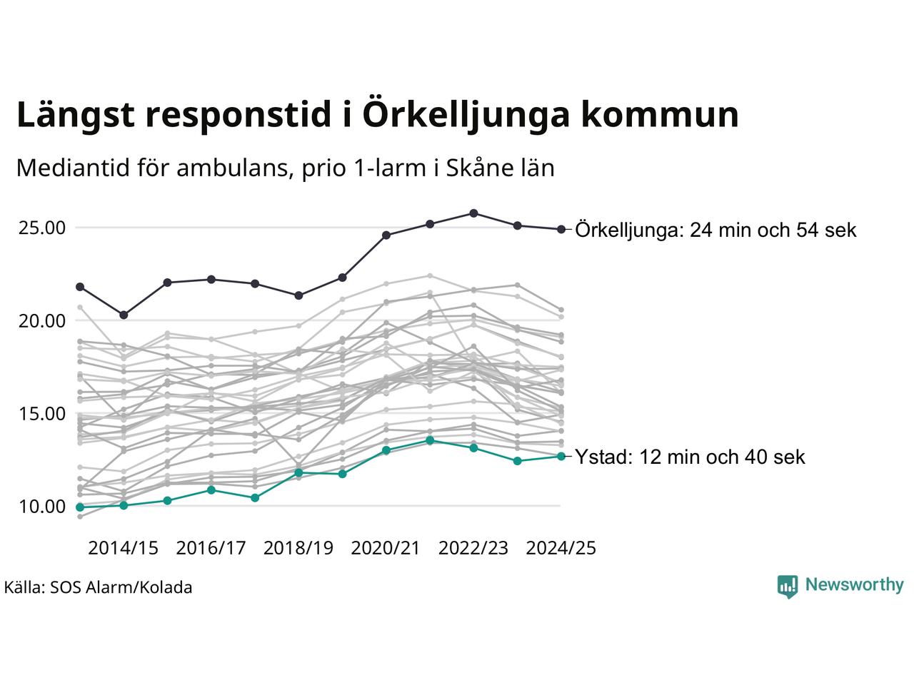 Även om väntan i Örkelljunga är lång för att vara Region Skåne krävs ytterligare 12 sekunder för att ta sig in på topp tiolistan över kommuerna i landet med längst väntetid. Längst är väntan på ambulans i Pajala kommun, 37 minuter och 55 sekunder. Kommunerna med längst responstid finns i Norrlands inland eller i glesbygd.