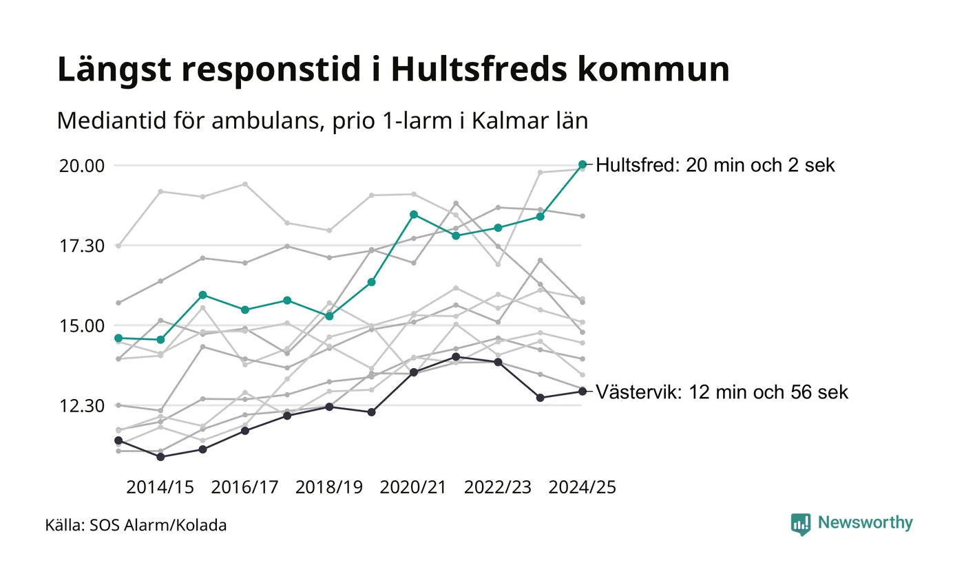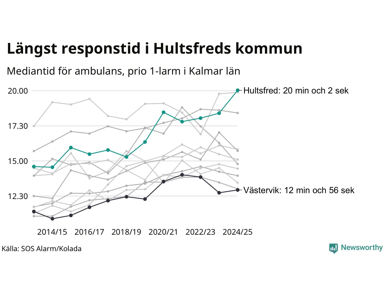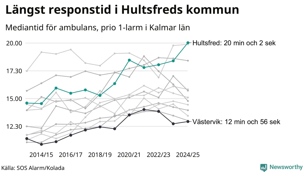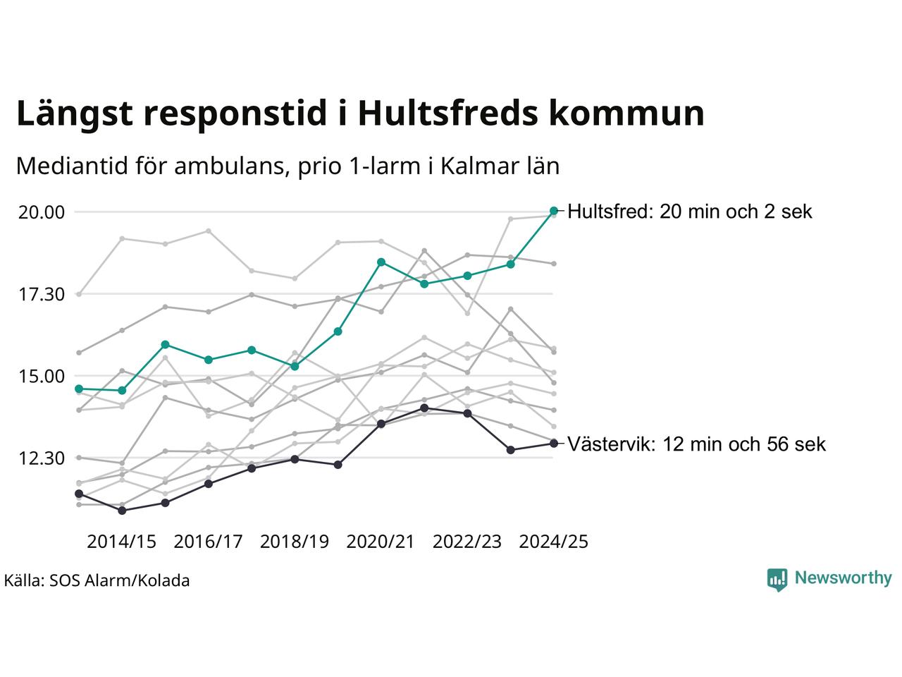 Det tar 20 minuter och 2 sekunder från att 112-samtalet når larmcentralen till att ambulansen är på plats i Hultsfreds kommun. Det visar de senaste siffrorna från SOS Alarm. Tiden är en mediantid för alla prio 1-larm mellan 1 juni 2024 och 31 maj 2025 och ett nyckeltal som redovisas varje år.