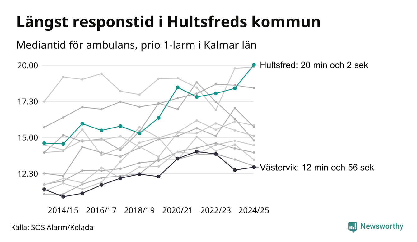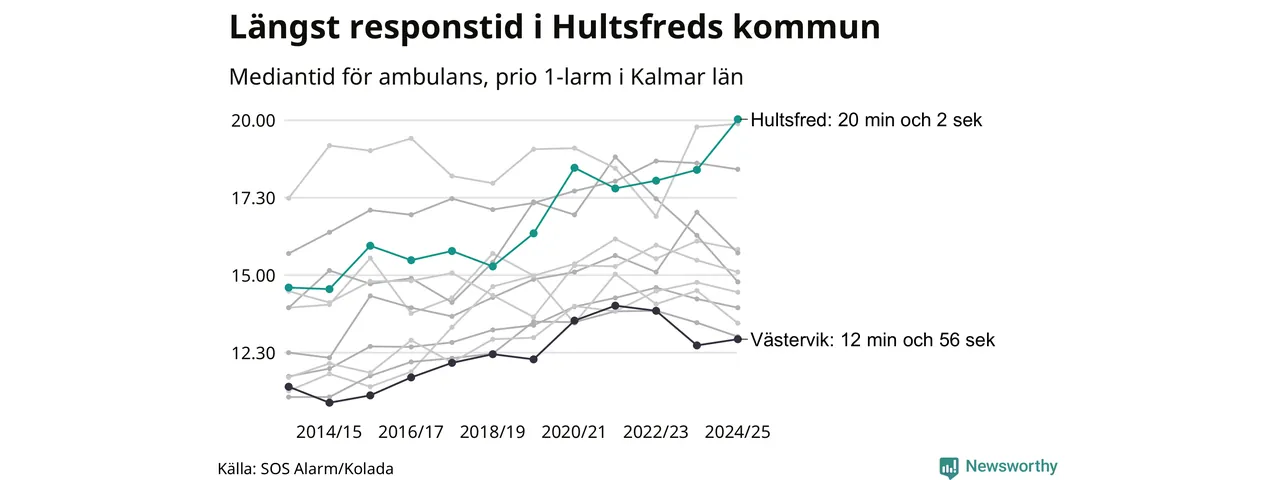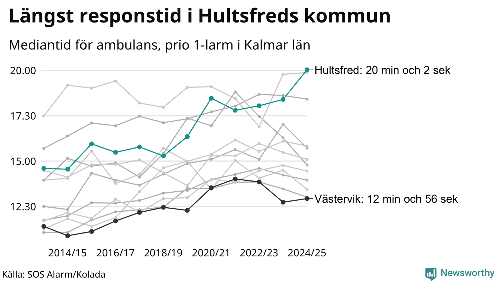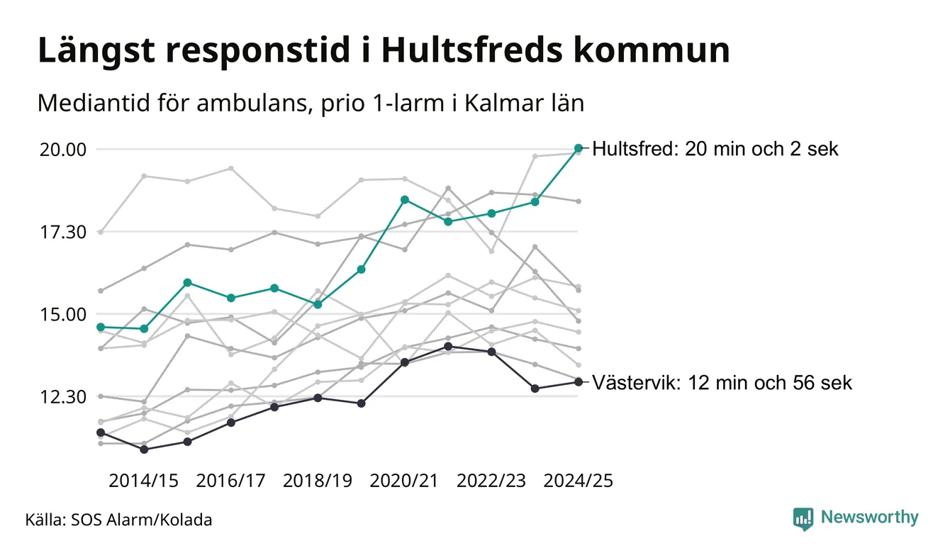 Det tar 20 minuter och 2 sekunder från att 112-samtalet når larmcentralen till att ambulansen är på plats i Hultsfreds kommun. Det visar de senaste siffrorna från SOS Alarm. Tiden är en mediantid för alla prio 1-larm mellan 1 juni 2024 och 31 maj 2025 och ett nyckeltal som redovisas varje år.