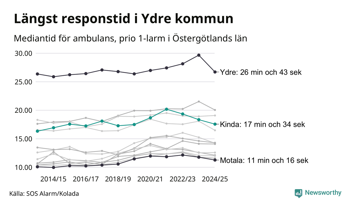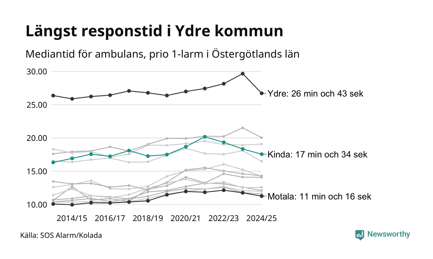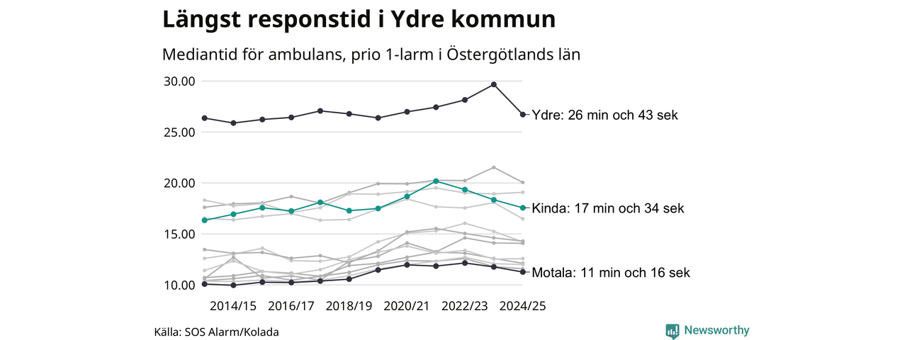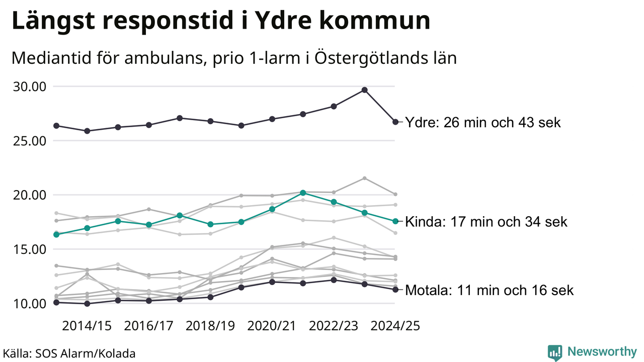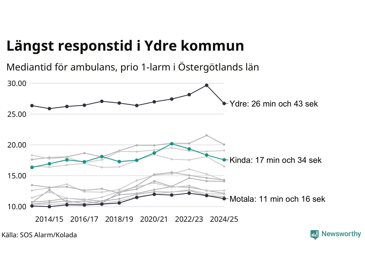 Kinda tillhör de kommuner i Region Östergötland som får vänta längst på ambulansen. Längst är väntetiden i Ydre kommun, som också tillhör de tio kommuner i landet som får vänta längst på ambulans: 26 minuter och 43 sekunder. Snabbast var ambulansen framme i Motala, där det tog 11 minuter och 16 sekunder från larmsamtalet 2024/2025.