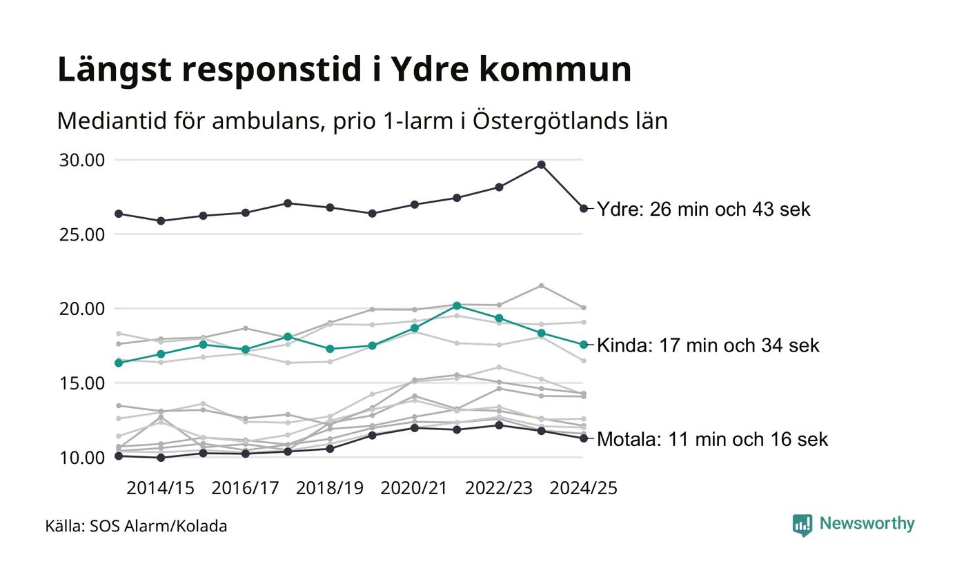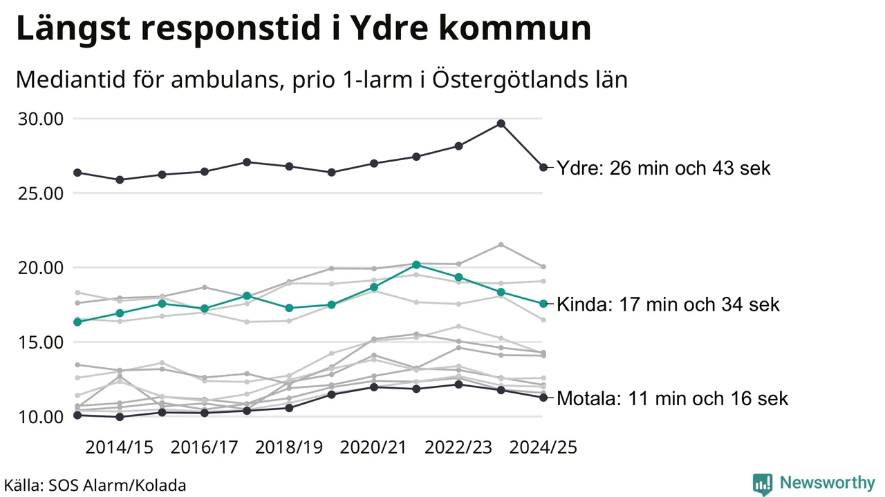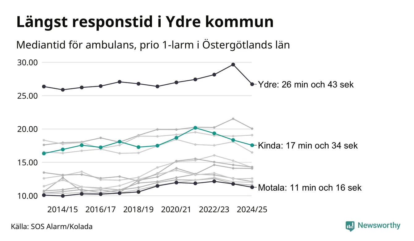 Det tar 17 minuter och 34 sekunder från att 112-samtalet når larmcentralen till att ambulansen är på plats i Kinda kommun. Det visar de senaste siffrorna från SOS Alarm. Tiden är en mediantid för alla prio 1-larm mellan 1 juni 2024 och 31 maj 2025 och ett nyckeltal som redovisas varje år.