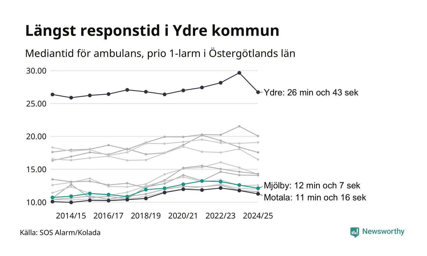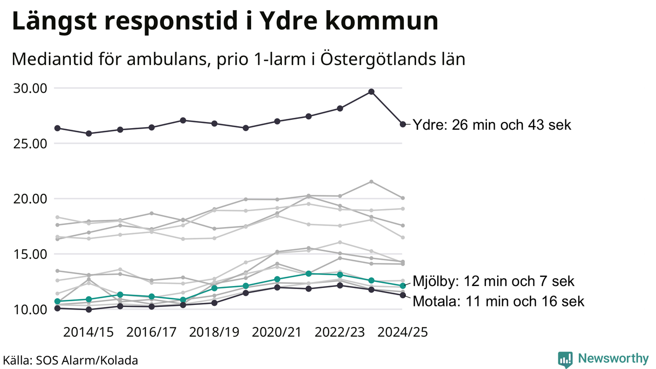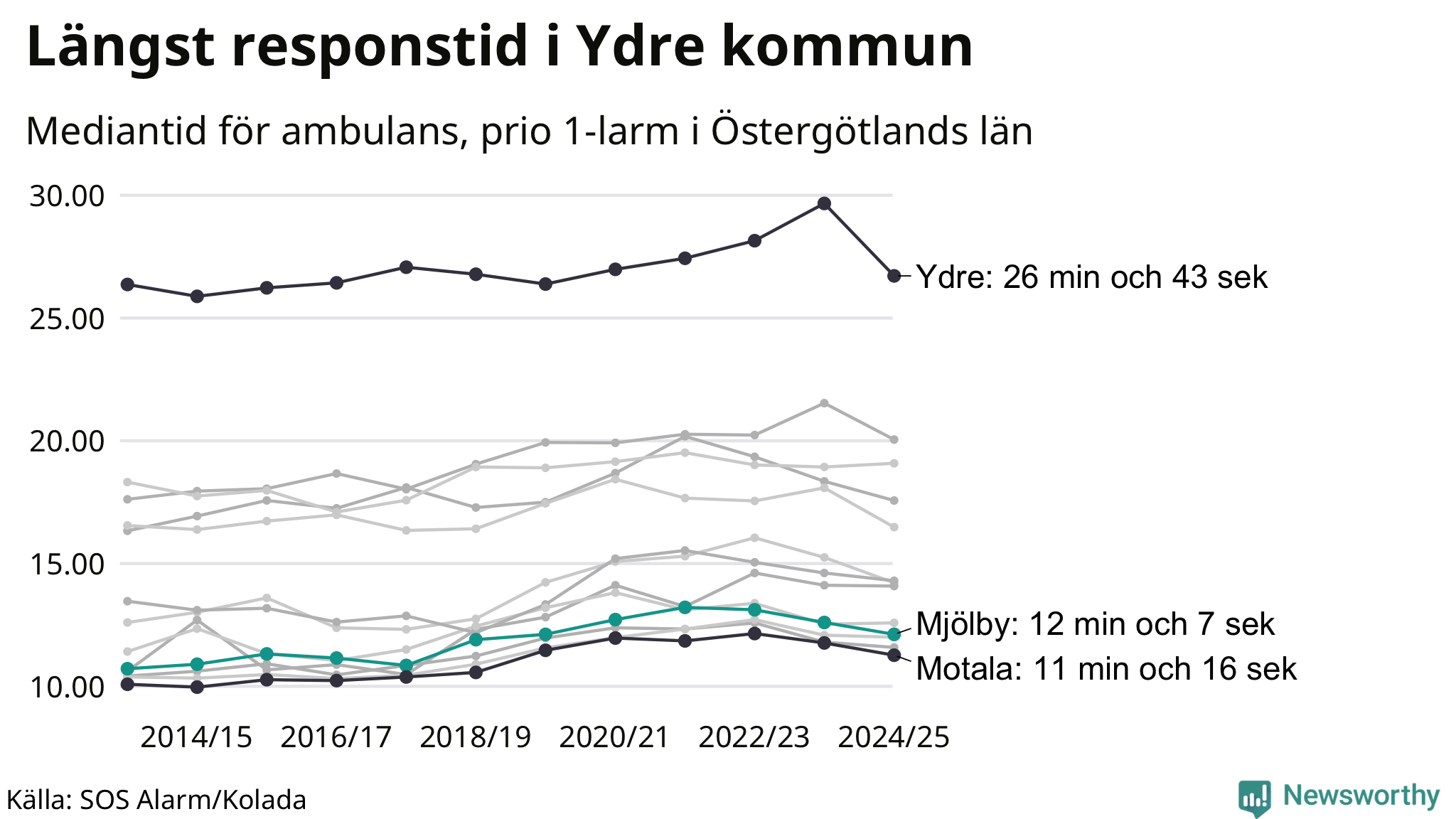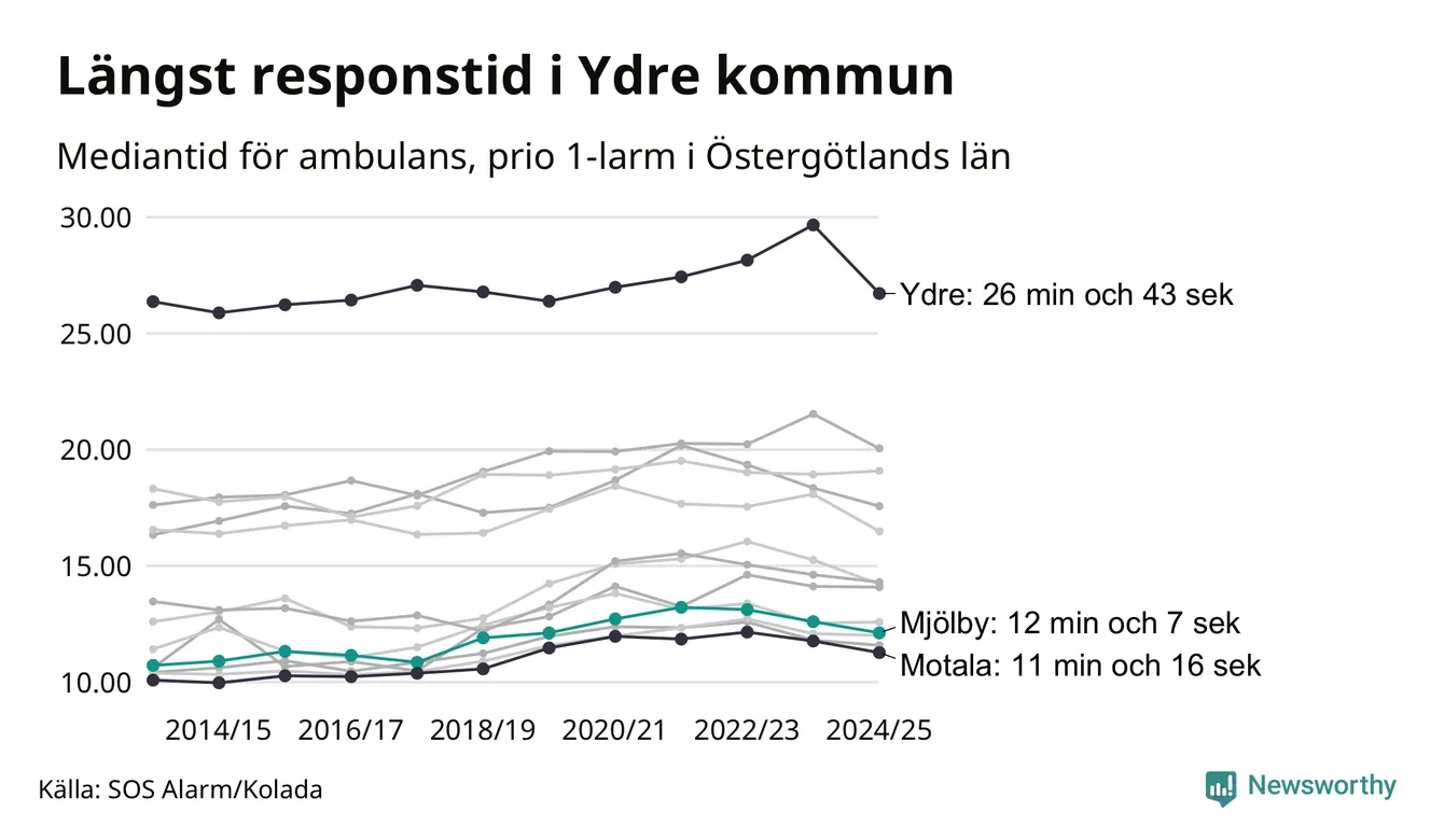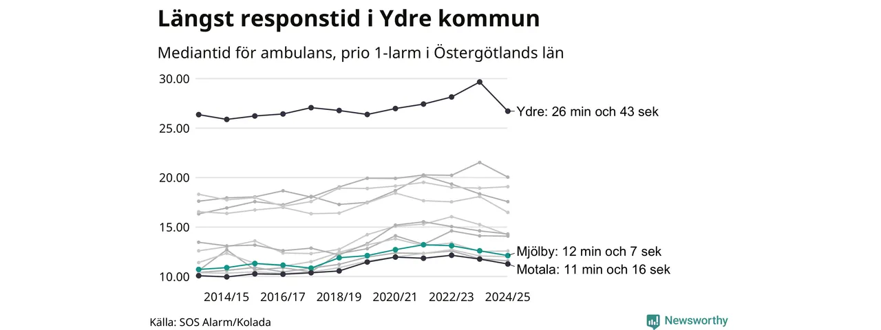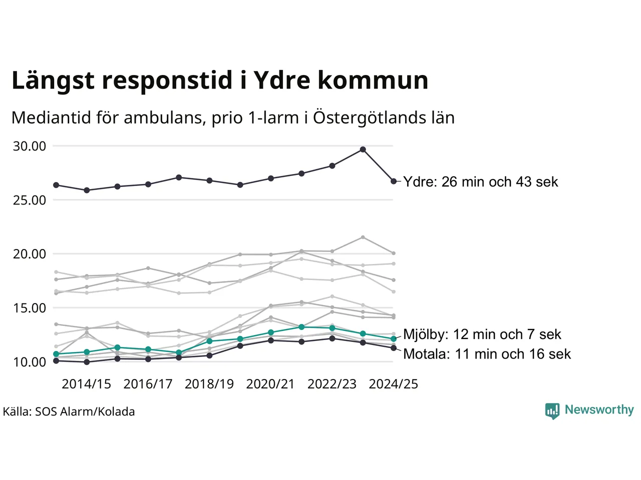 Mjölby tillhör inte de kommuner i Region Östergötland som får vänta längst på ambulans – men inte heller de som får snabbast hjälp. Längst är väntetiden i Ydre kommun, som också tillhör de tio kommuner i landet som får vänta längst på ambulans: 26 minuter och 43 sekunder. Snabbast var ambulansen framme i Motala, där det tog 11 minuter och 16 sekunder från larmsamtalet 2024/2025.