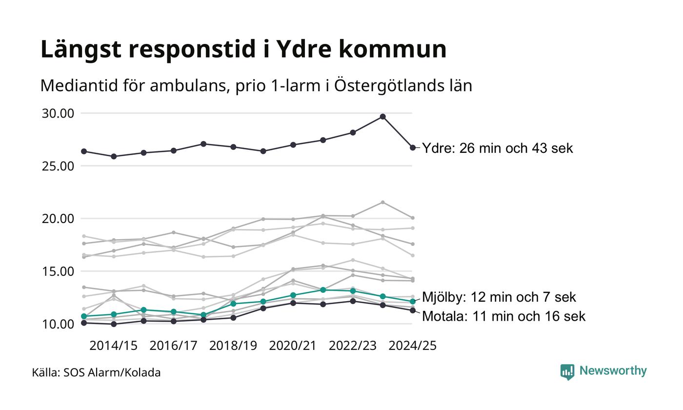 Det tar 12 minuter och 7 sekunder från att 112-samtalet når larmcentralen till att ambulansen är på plats i Mjölby kommun. Det visar de senaste siffrorna från SOS Alarm. Tiden är en mediantid för alla prio 1-larm mellan 1 juni 2024 och 31 maj 2025 och ett nyckeltal som redovisas varje år.