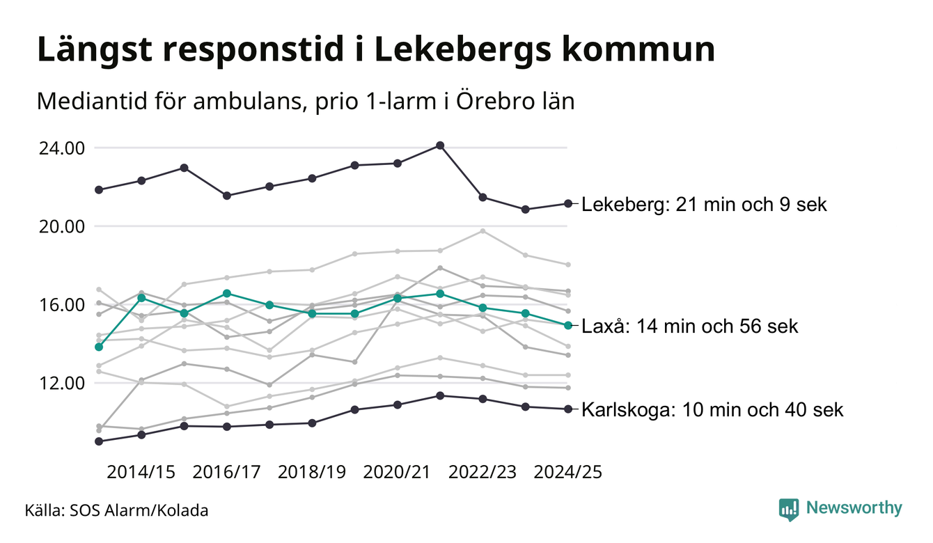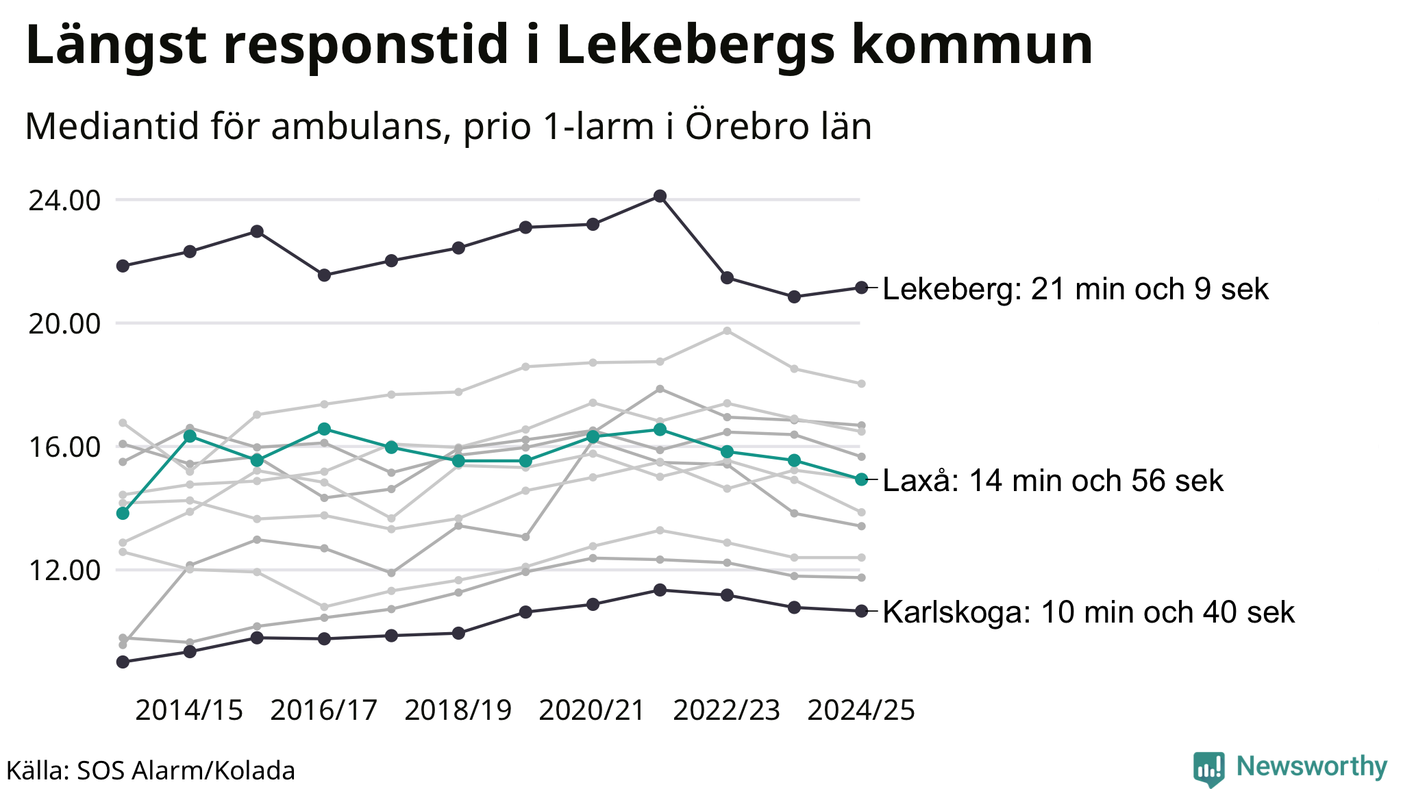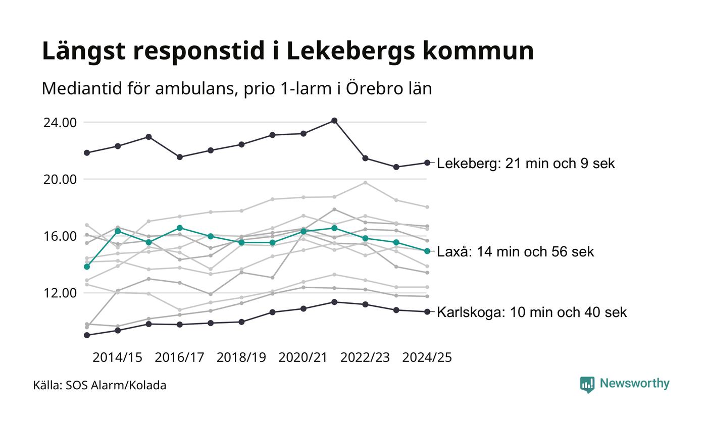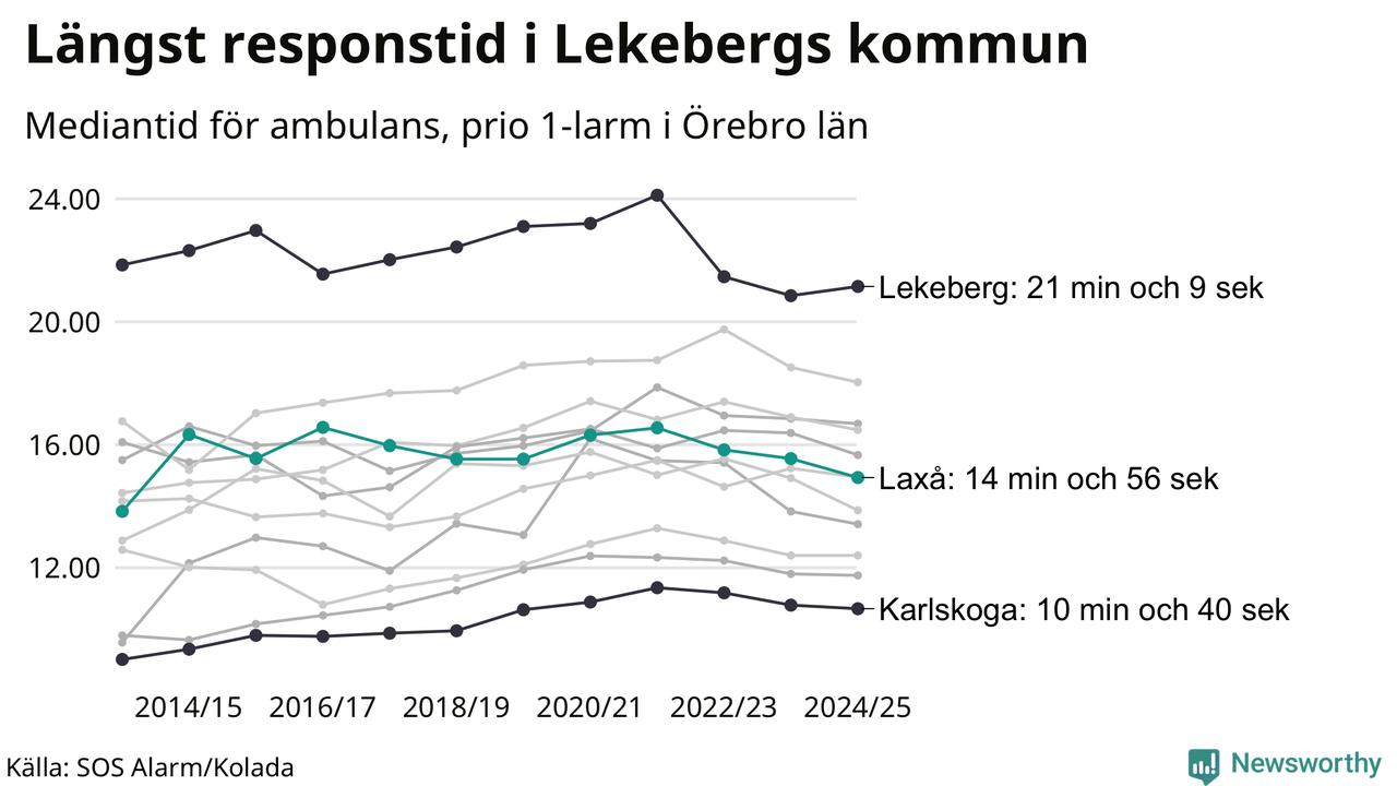 Det tar 14 minuter och 56 sekunder från att 112-samtalet når larmcentralen till att ambulansen är på plats i Laxå kommun. Det visar de senaste siffrorna från SOS Alarm. Tiden är en mediantid för alla prio 1-larm mellan 1 juni 2024 och 31 maj 2025 och ett nyckeltal som redovisas varje år.