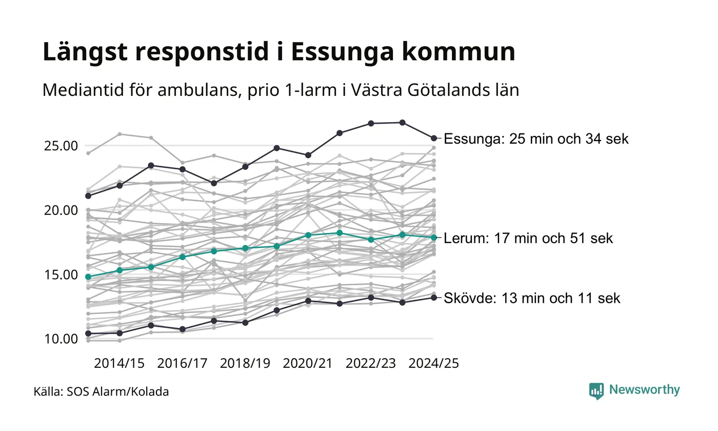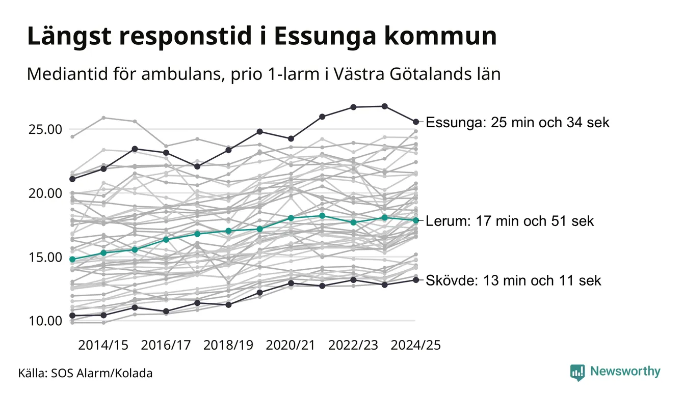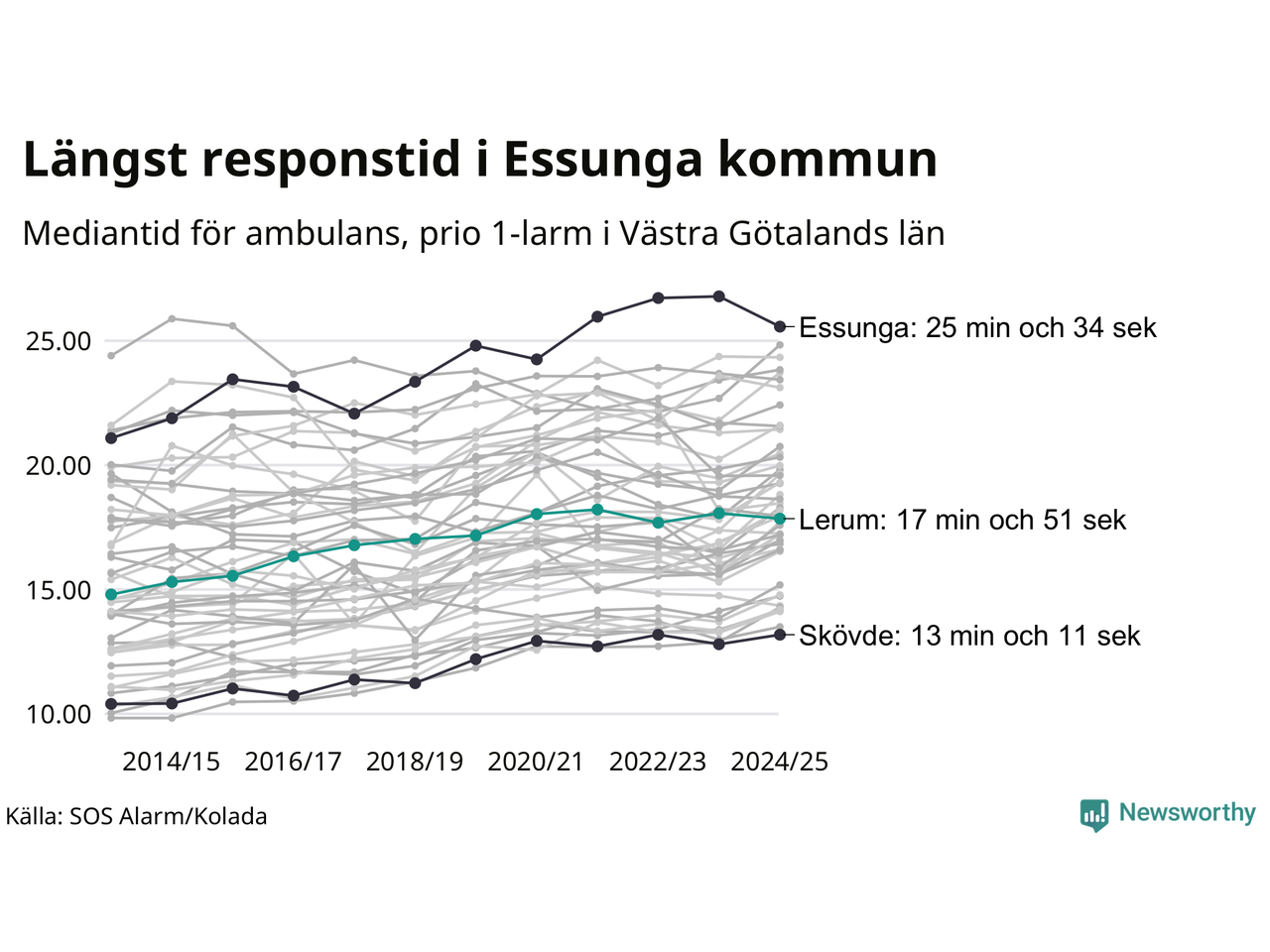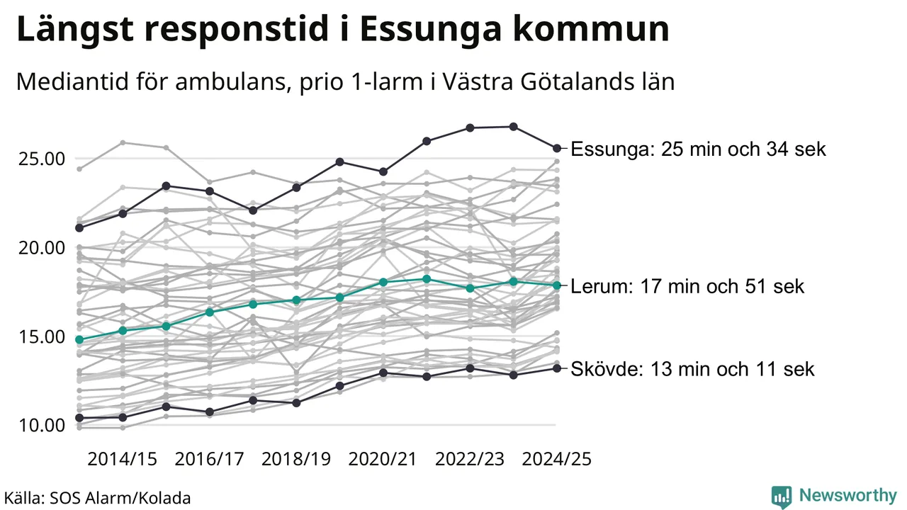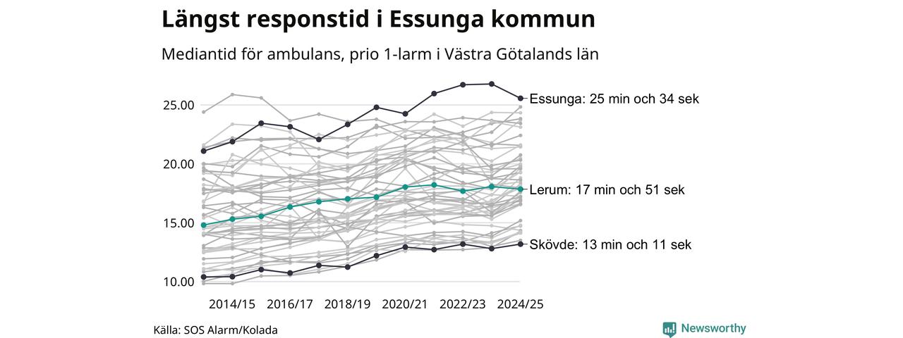 Lerum tillhör inte de kommuner i Västra Götalandsregionen som får vänta längst på ambulans – men inte heller de som får snabbast hjälp. Längst är väntetiden i Essunga kommun, som också tillhör de tio kommuner i landet som får vänta längst på ambulans: 25 minuter och 34 sekunder. Snabbast var ambulansen framme i Skövde, där det tog 13 minuter och 11 sekunder från larmsamtalet 2024/2025.