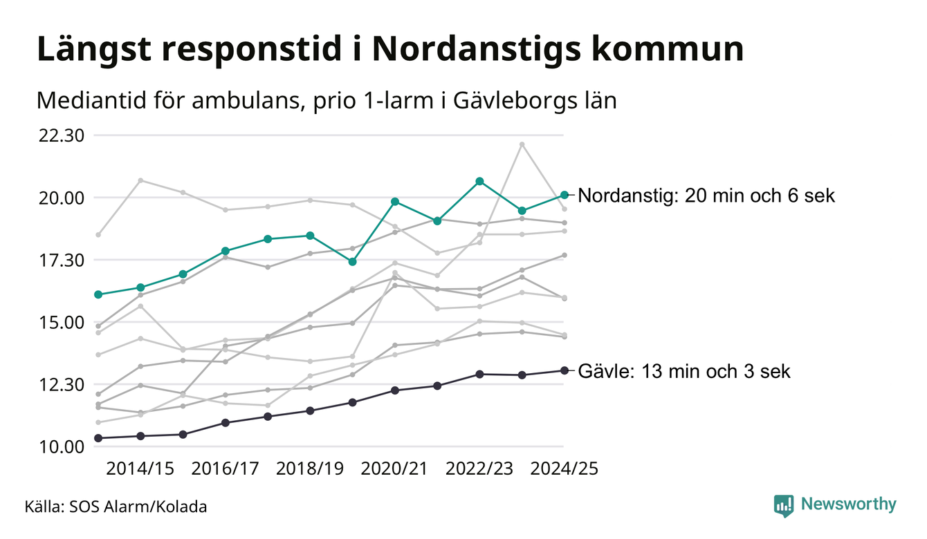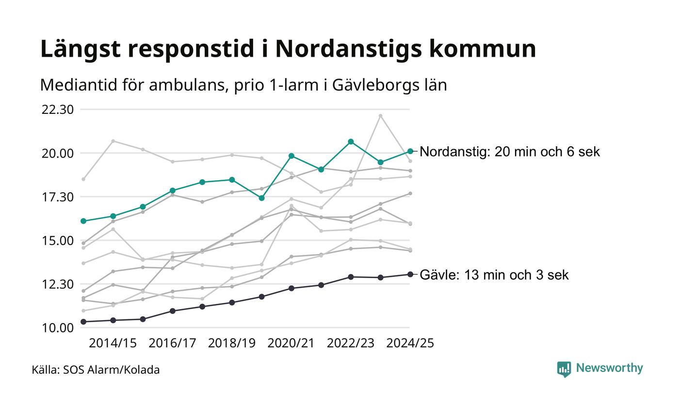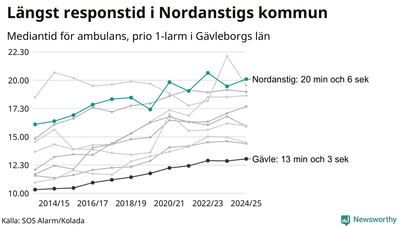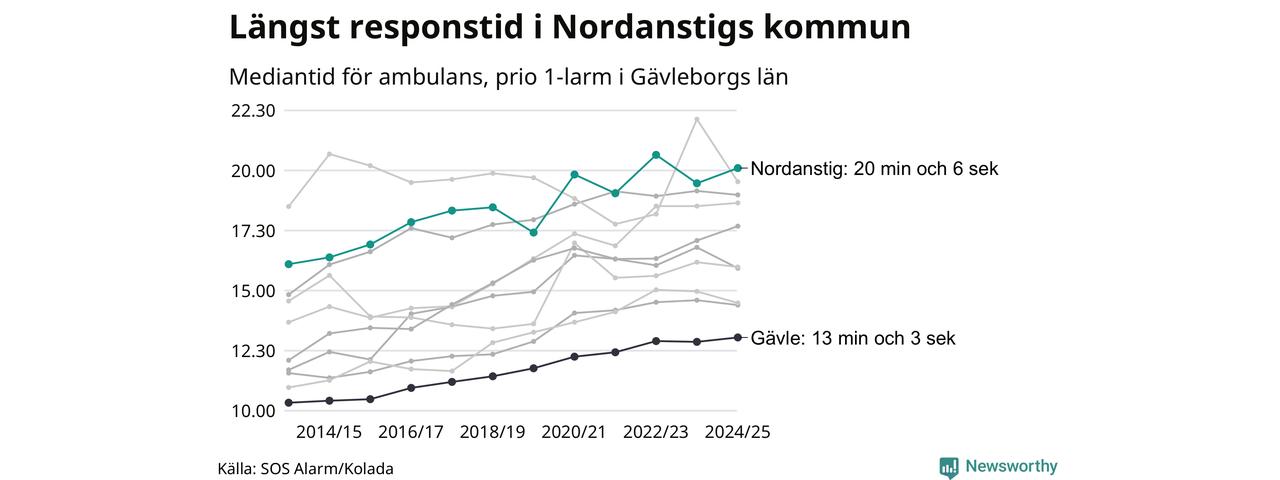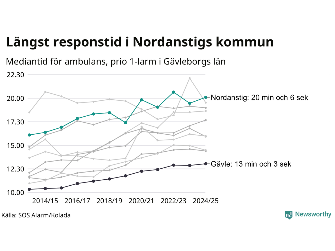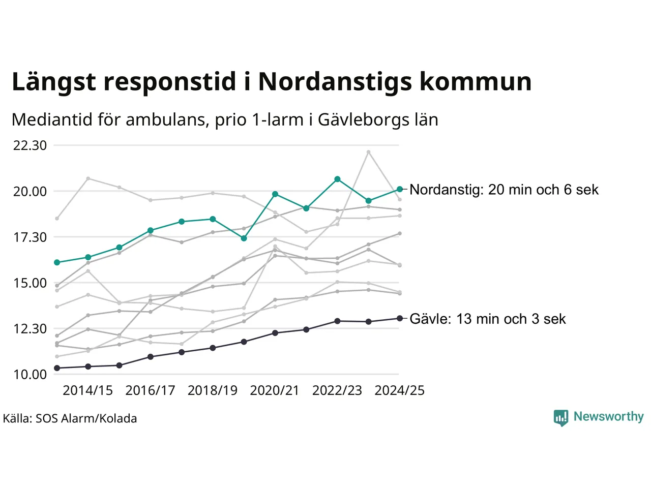Det tar 20 minuter och 6 sekunder från att 112-samtalet når larmcentralen till att ambulansen är på plats i Nordanstigs kommun. Det visar de senaste siffrorna från SOS Alarm. Tiden är en mediantid för alla prio 1-larm mellan 1 juni 2024 och 31 maj 2025 och ett nyckeltal som redovisas varje år.