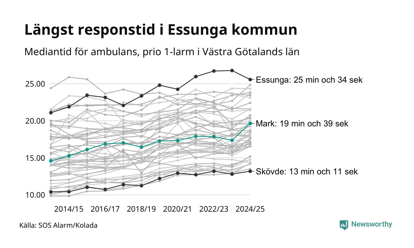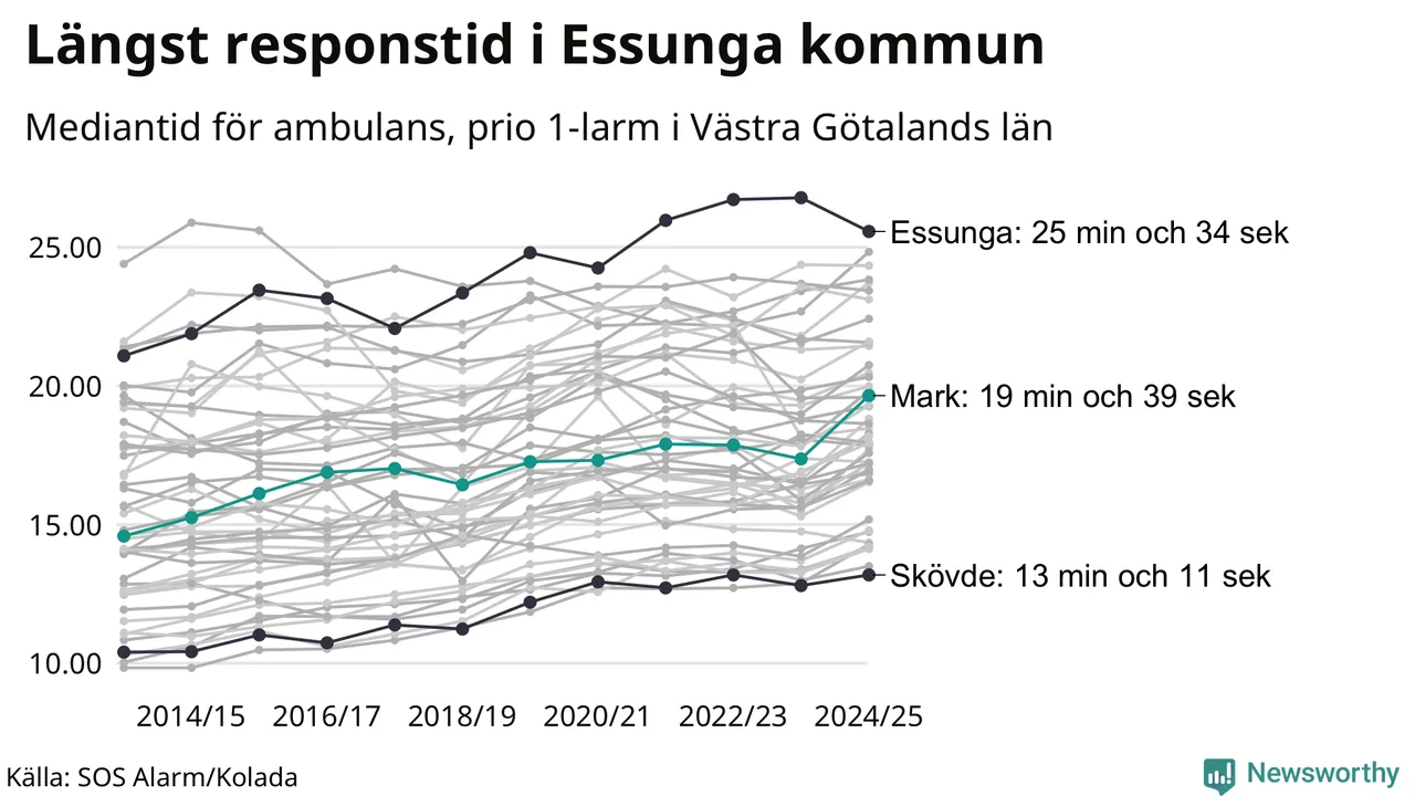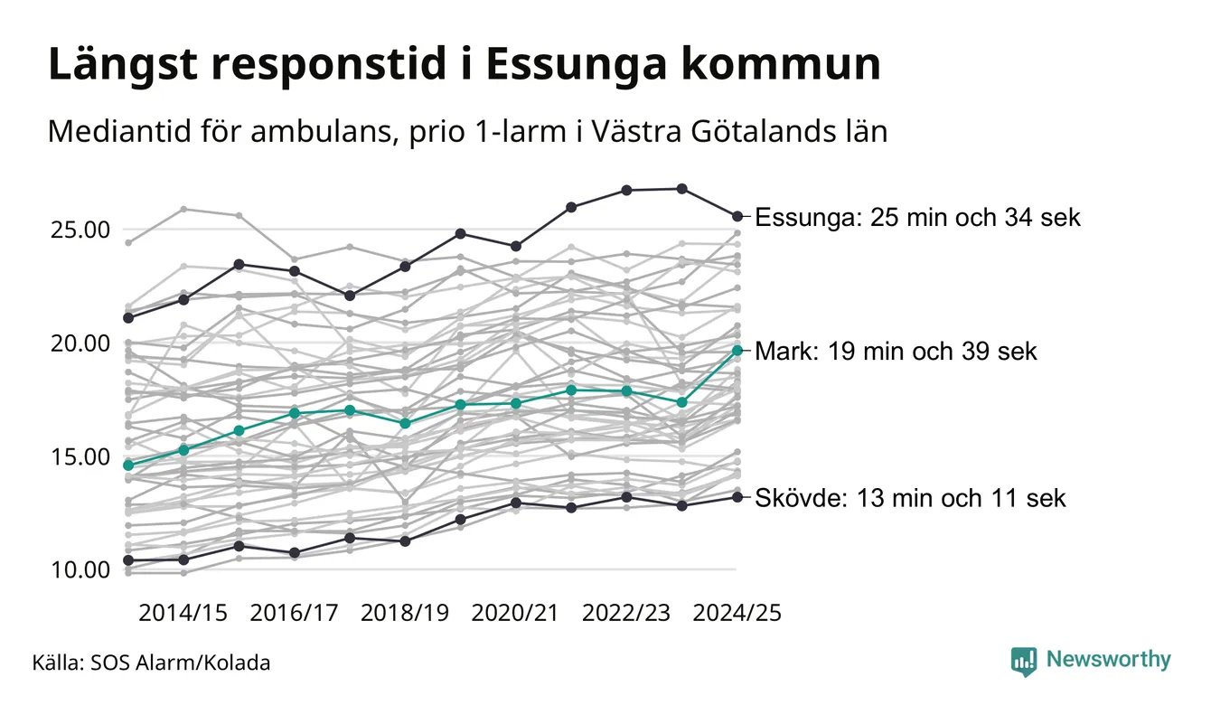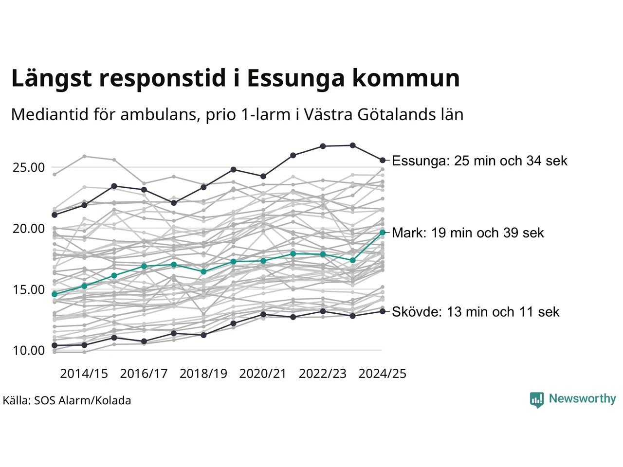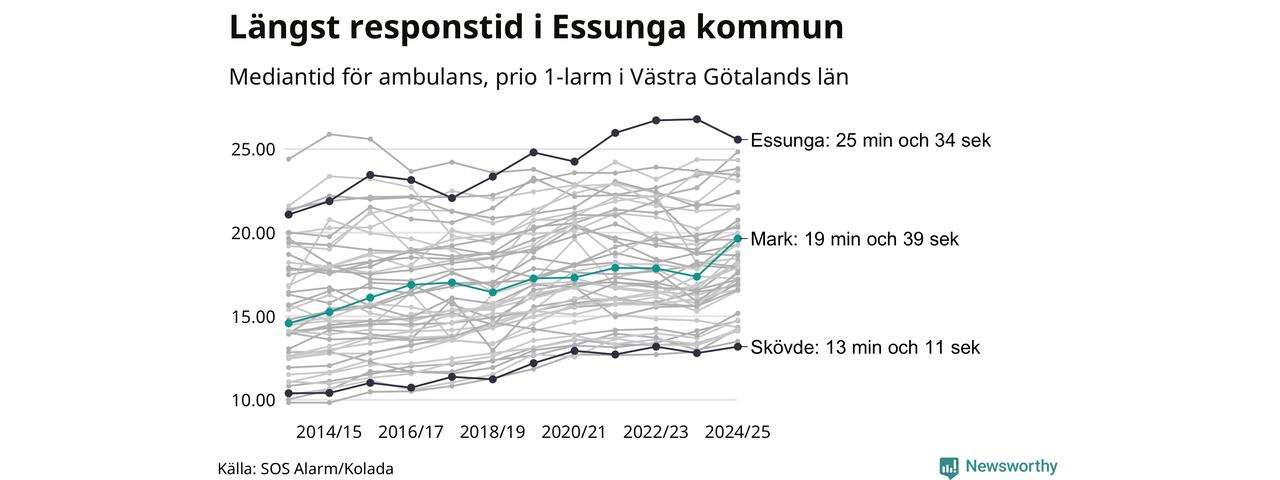 Mark tillhör inte de kommuner i Västra Götalandsregionen som får vänta längst på ambulans – men inte heller de som får snabbast hjälp. Längst är väntetiden i Essunga kommun, som också tillhör de tio kommuner i landet som får vänta längst på ambulans: 25 minuter och 34 sekunder. Snabbast var ambulansen framme i Skövde, där det tog 13 minuter och 11 sekunder från larmsamtalet 2024/2025.