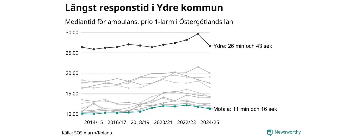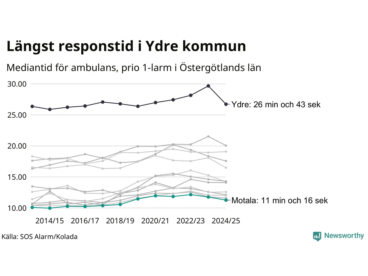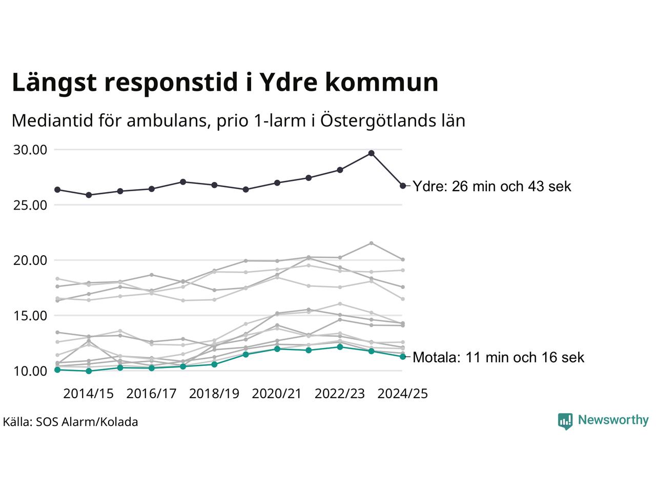 Bland kommunerna i Region Östergötland nåddes Motala snabbast av ambulans under 2024/2025. Längst är väntetiden i Ydre kommun, som också tillhör de tio kommuner i landet som får vänta längst på ambulans: 26 minuter och 43 sekunder. Där har väntetiden ändå kapats med 2 minuter och 57 sekunder jämfört med året innan.