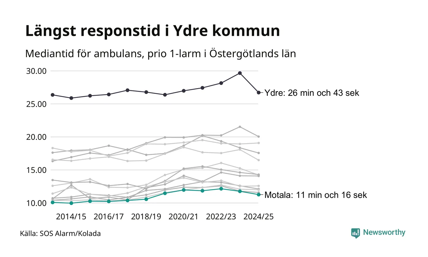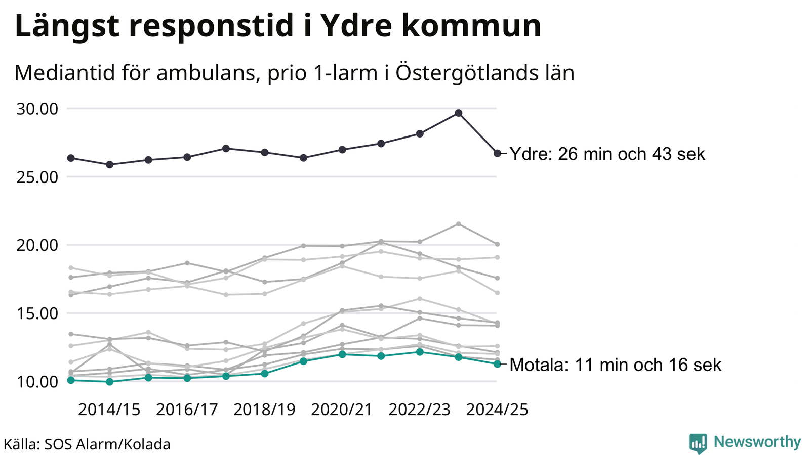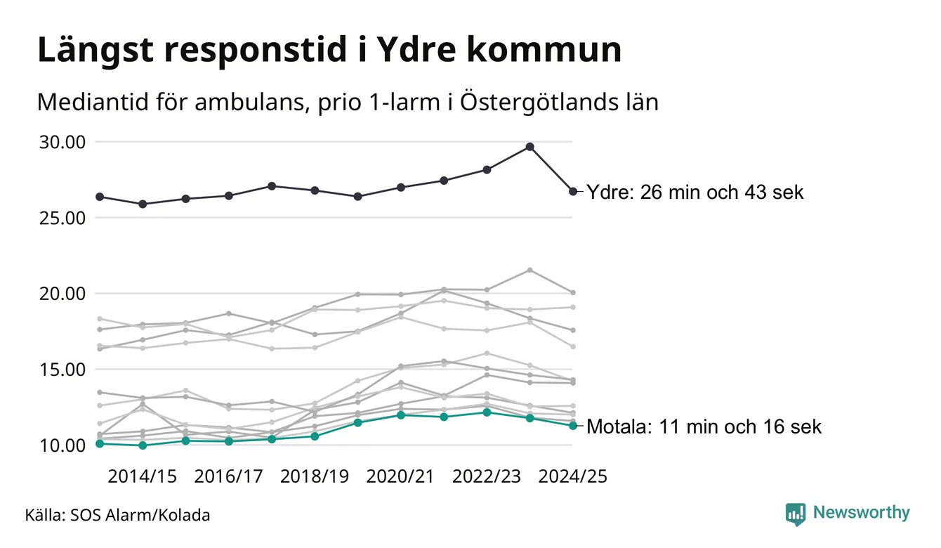 Bland kommunerna i Region Östergötland nåddes Motala snabbast av ambulans under 2024/2025. Längst är väntetiden i Ydre kommun, som också tillhör de tio kommuner i landet som får vänta längst på ambulans: 26 minuter och 43 sekunder. Där har väntetiden ändå kapats med 2 minuter och 57 sekunder jämfört med året innan.