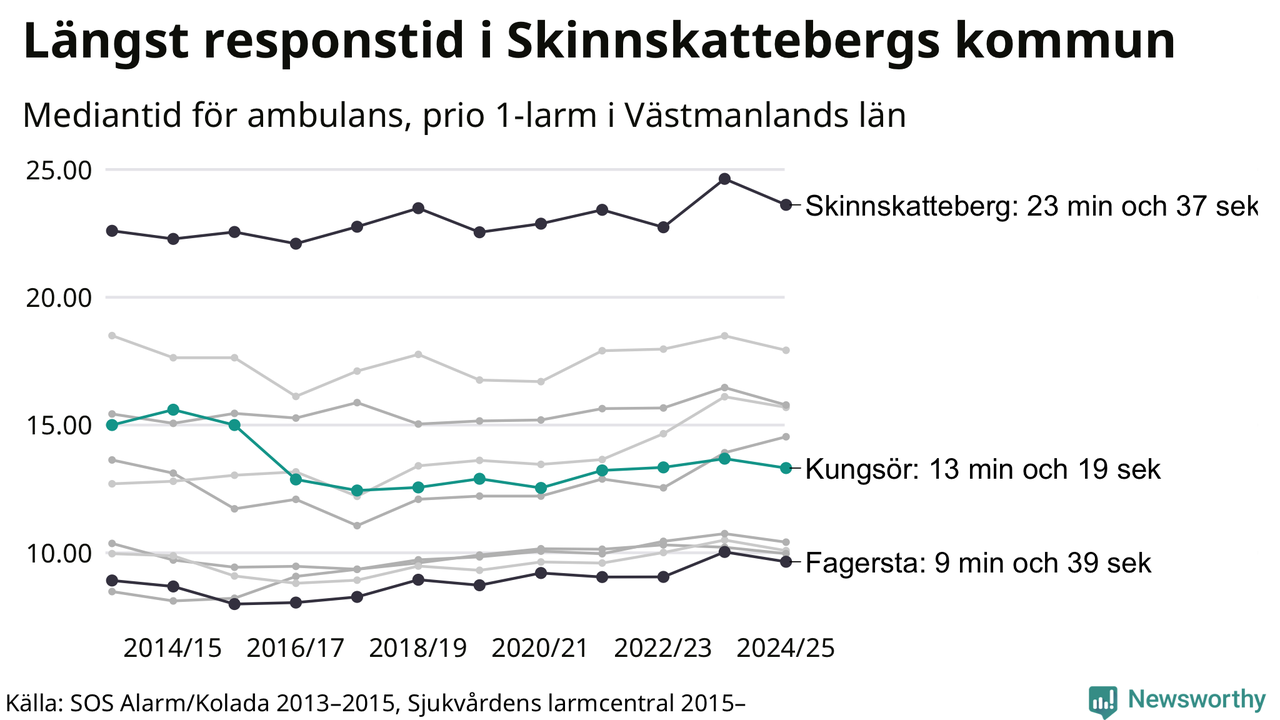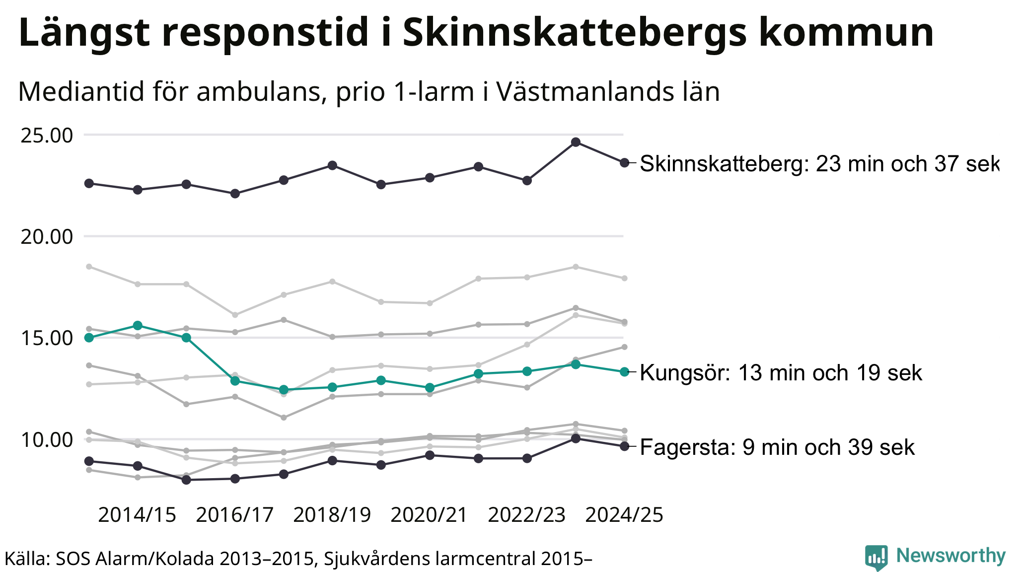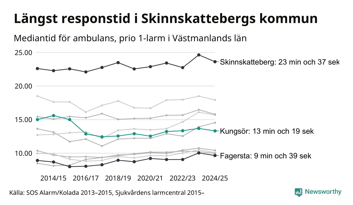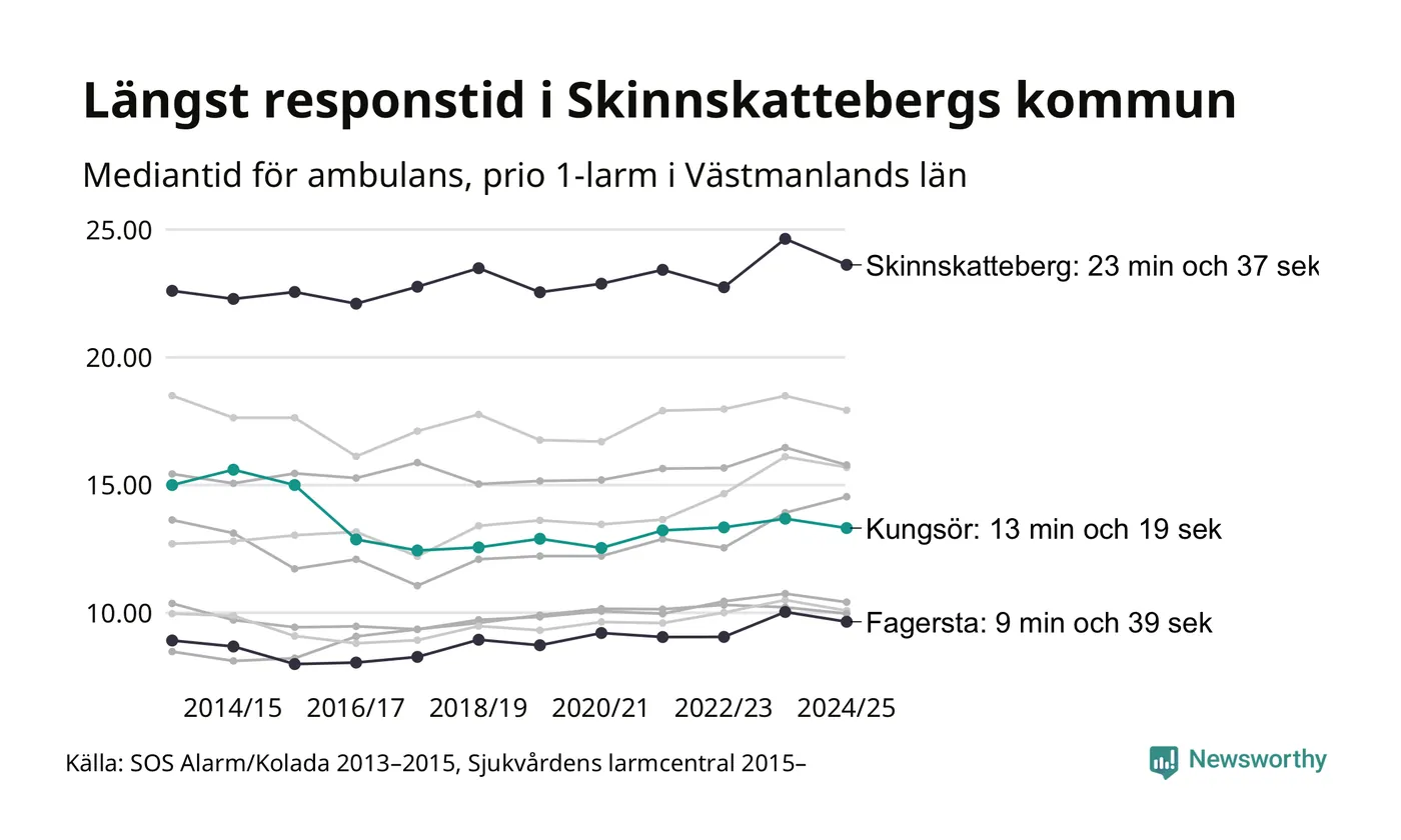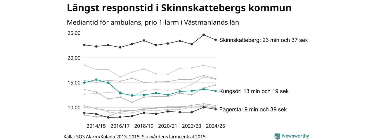 Kungsör tillhör inte de kommuner i Region Västmanland som får vänta längst på ambulans – men inte heller de som får snabbast hjälp. Längst är väntetiden i Skinnskattebergs kommun: 23 minuter och 37 sekunder. Snabbast var ambulansen framme i Fagersta, där det tog 9 minuter och 39 sekunder från larmsamtalet 2024/2025.