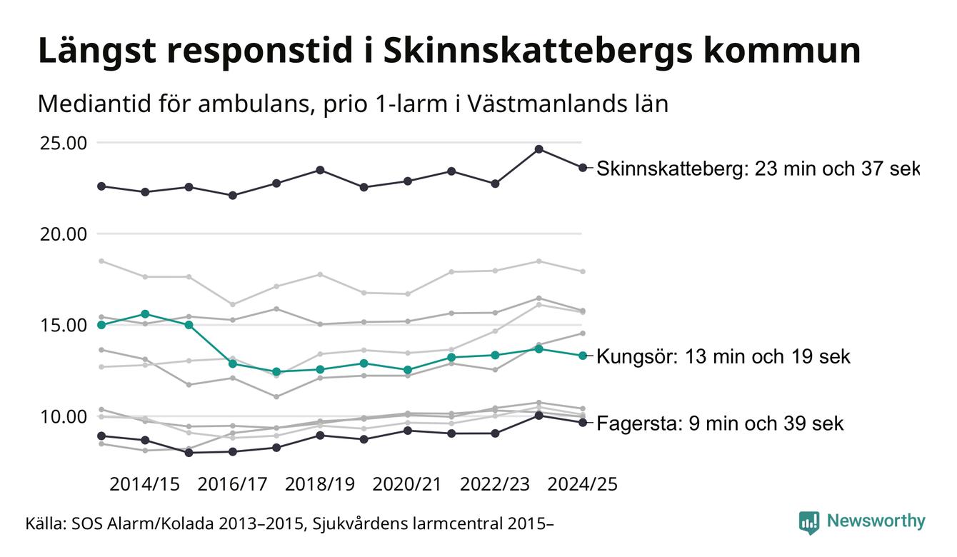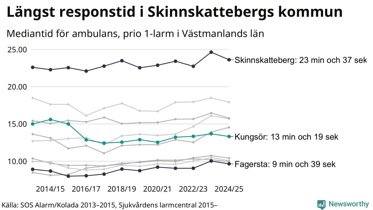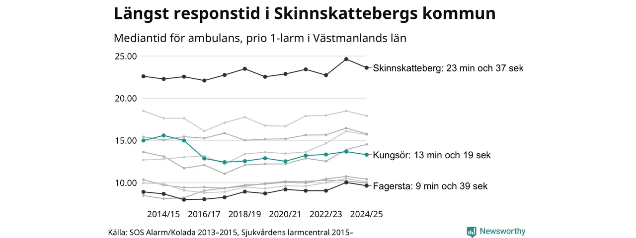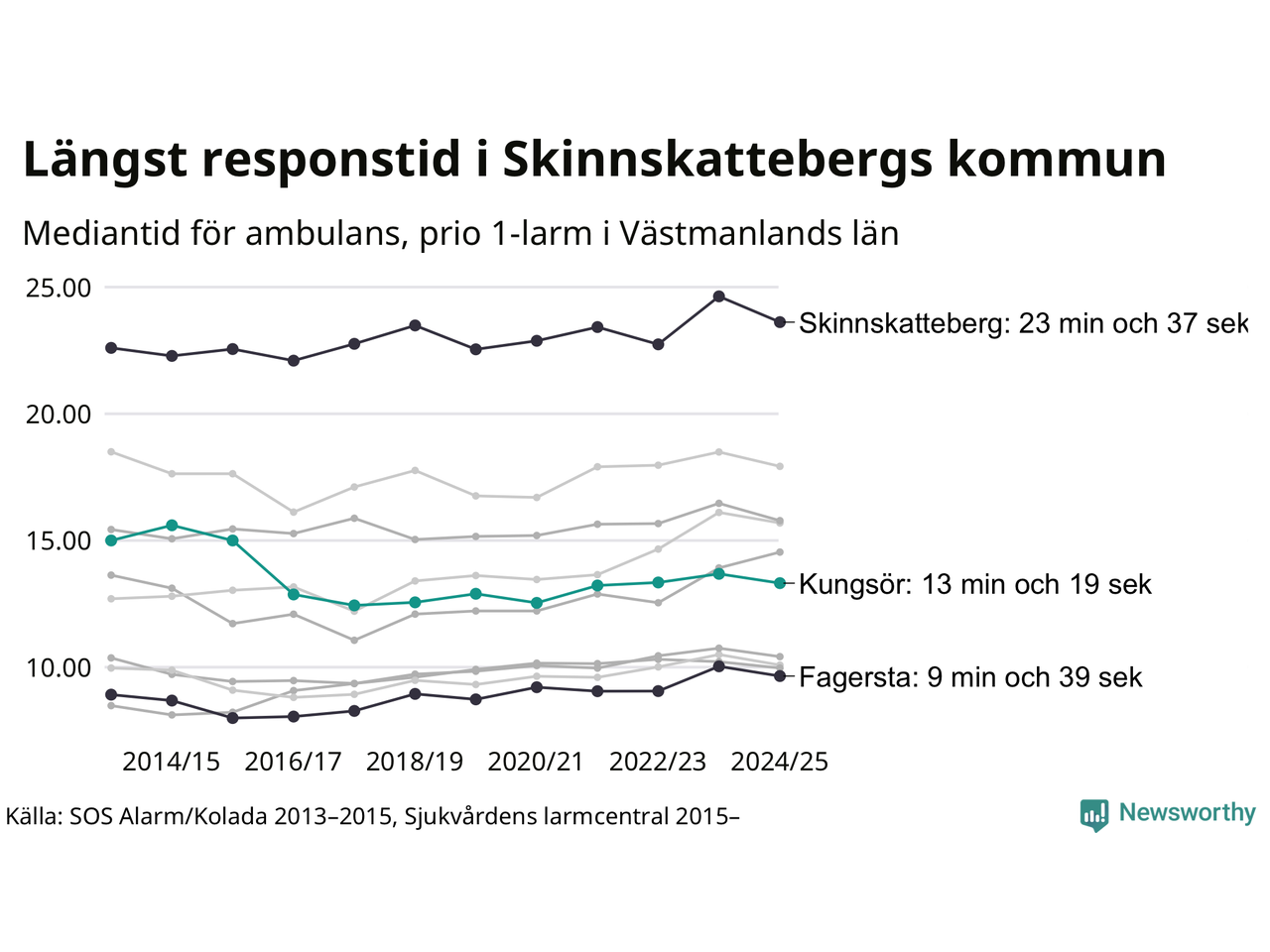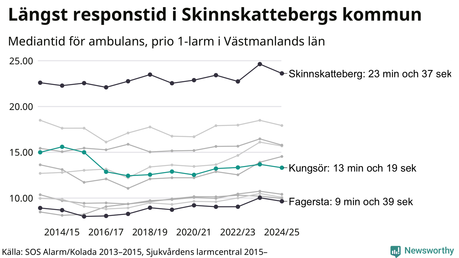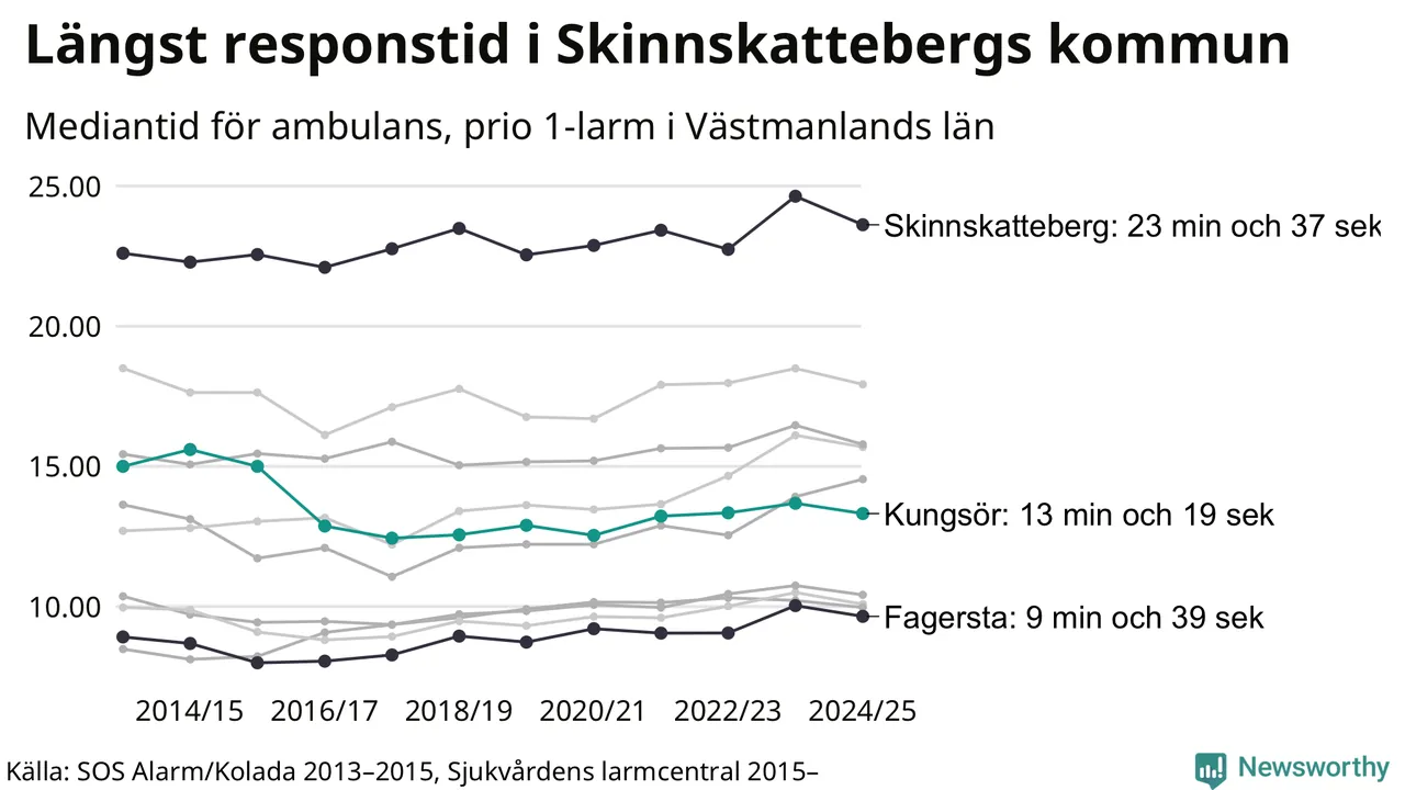 Det tar 13 minuter och 19 sekunder från att 112-samtalet når larmcentralen till att ambulansen är på plats i Kungsörs kommun. Det visar de senaste siffrorna från Sjukvårdens larmcentral. Tiden är en mediantid för alla prio 1-larm mellan 1 juni 2024 och 31 maj 2025 och ett nyckeltal som redovisas varje år.