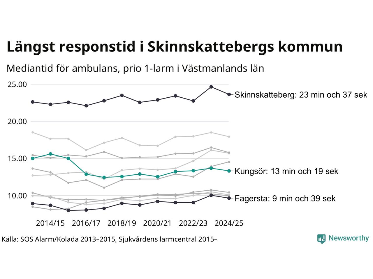 Även om väntan i Skinnskatteberg är lång för att vara Region Västmanland krävs ytterligare 1 minut och 29 sekunder för att ta sig in på topp tiolistan över kommuerna i landet med längst väntetid. Längst är väntan på ambulans i Pajala kommun, 37 minuter och 55 sekunder. Kommunerna med längst responstid finns i Norrlands inland eller i glesbygd.