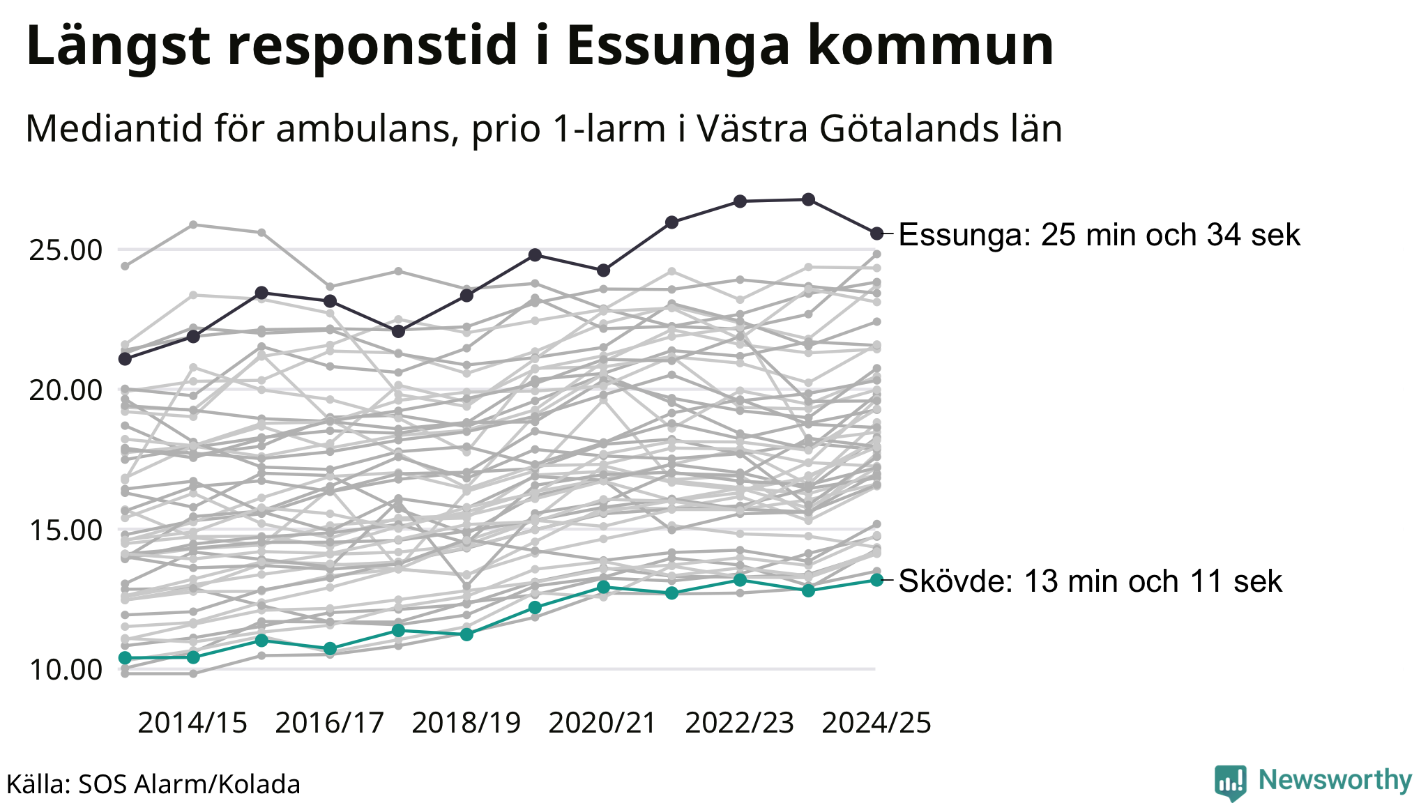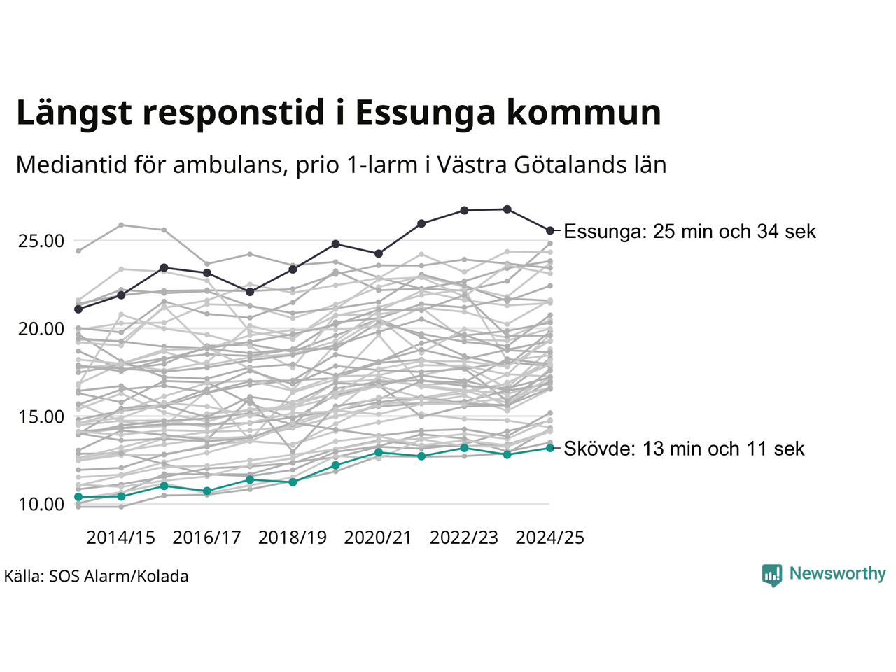 Det tar 13 minuter och 11 sekunder från att 112-samtalet når larmcentralen till att ambulansen är på plats i Skövde kommun. Det visar de senaste siffrorna från SOS Alarm. Tiden är en mediantid för alla prio 1-larm mellan 1 juni 2024 och 31 maj 2025 och ett nyckeltal som redovisas varje år.