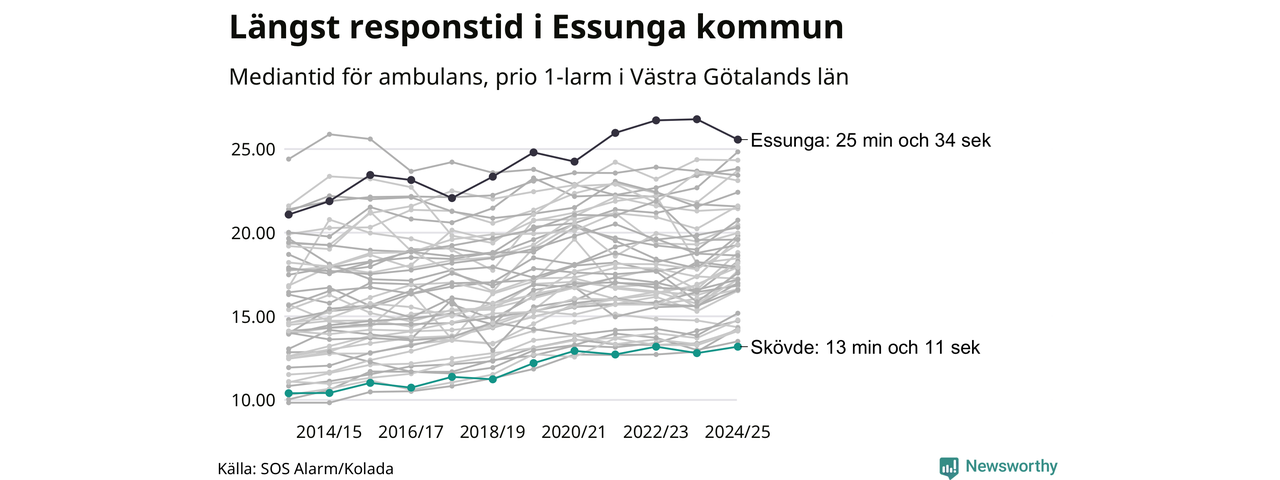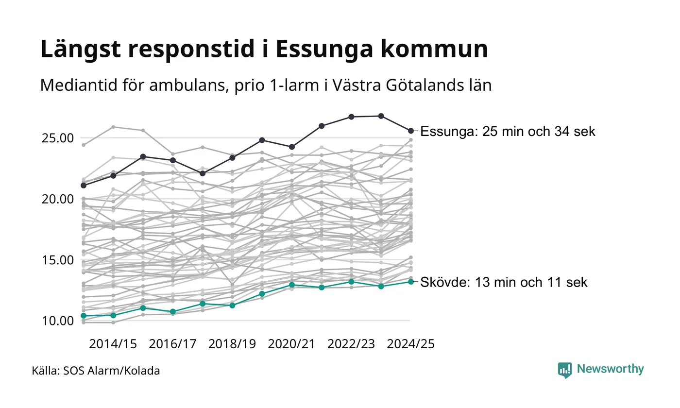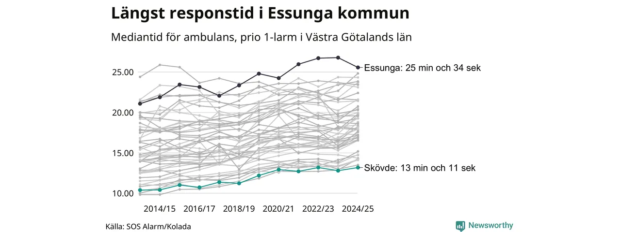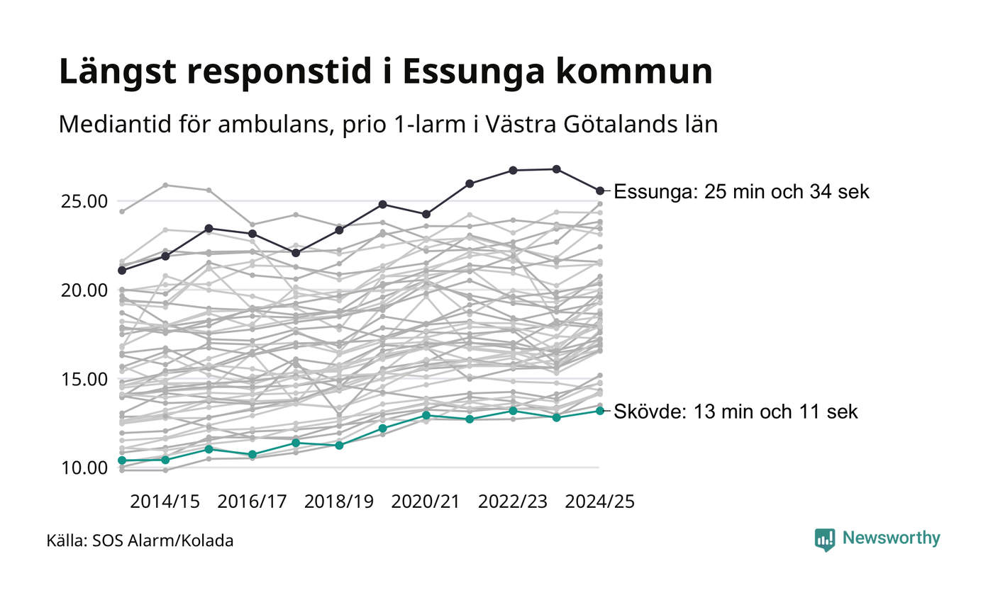 Bland kommunerna i Västra Götalandsregionen nåddes Skövde snabbast av ambulans under 2024/2025. Längst är väntetiden i Essunga kommun, som också tillhör de tio kommuner i landet som får vänta längst på ambulans: 25 minuter och 34 sekunder. Där har väntetiden ändå kapats med 1 minut och 13 sekunder jämfört med året innan.