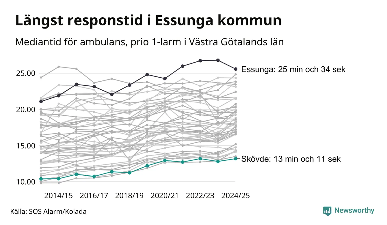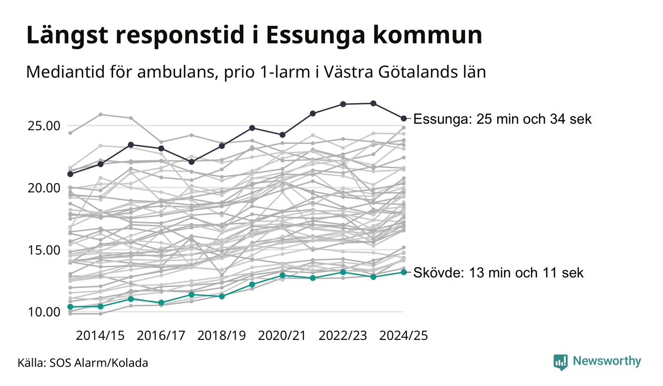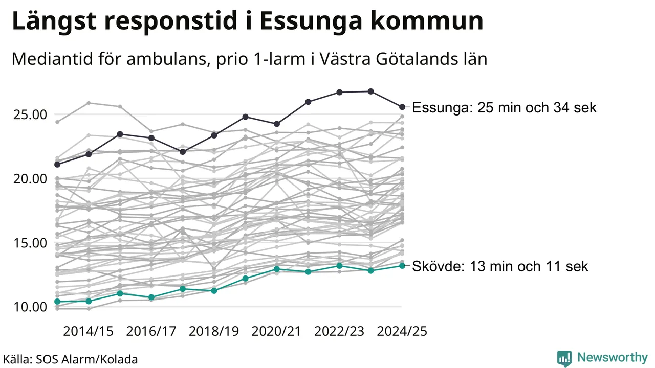 Bland kommunerna i Västra Götalandsregionen nåddes Skövde snabbast av ambulans under 2024/2025. Längst är väntetiden i Essunga kommun, som också tillhör de tio kommuner i landet som får vänta längst på ambulans: 25 minuter och 34 sekunder. Där har väntetiden ändå kapats med 1 minut och 13 sekunder jämfört med året innan.