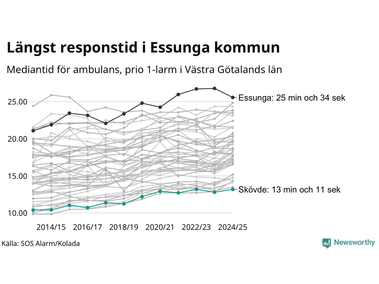 Essunga är alltså en av de kommuner som får vänta längst på ambulans i landet. Längst är väntan på ambulans i Pajala kommun, 37 minuter och 55 sekunder. Kommunerna med längst responstid finns i Norrlands inland eller i glesbygd.