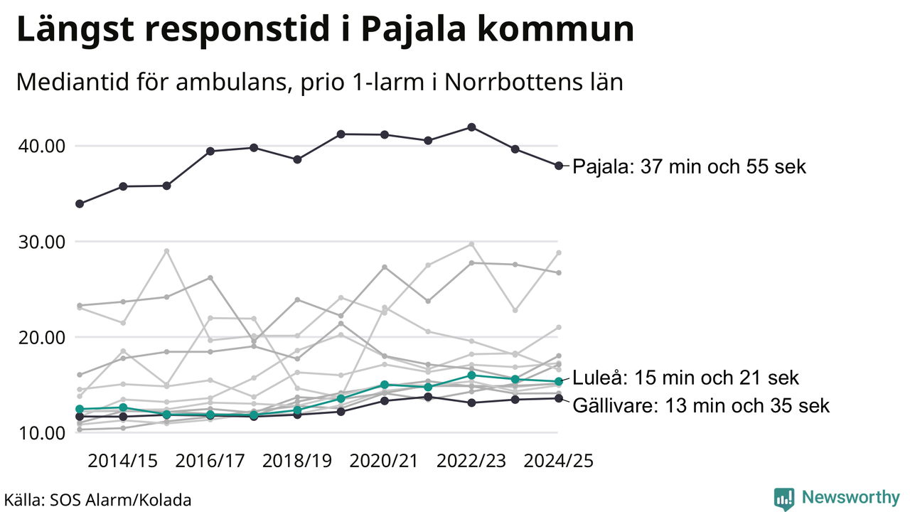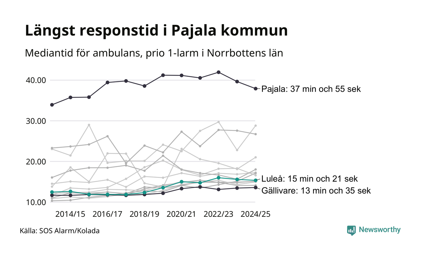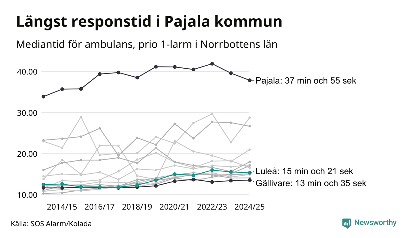 Luleå tillhör inte de kommuner i Region Norrbotten som får vänta längst på ambulans – men inte heller de som får snabbast hjälp. Längst är väntetiden i Pajala kommun, som också är den kommun i hela landet som får vänta längst på ambulans: 37 minuter och 55 sekunder. Snabbast var ambulansen framme i Gällivare, där det tog 13 minuter och 35 sekunder från larmsamtalet 2024/2025.