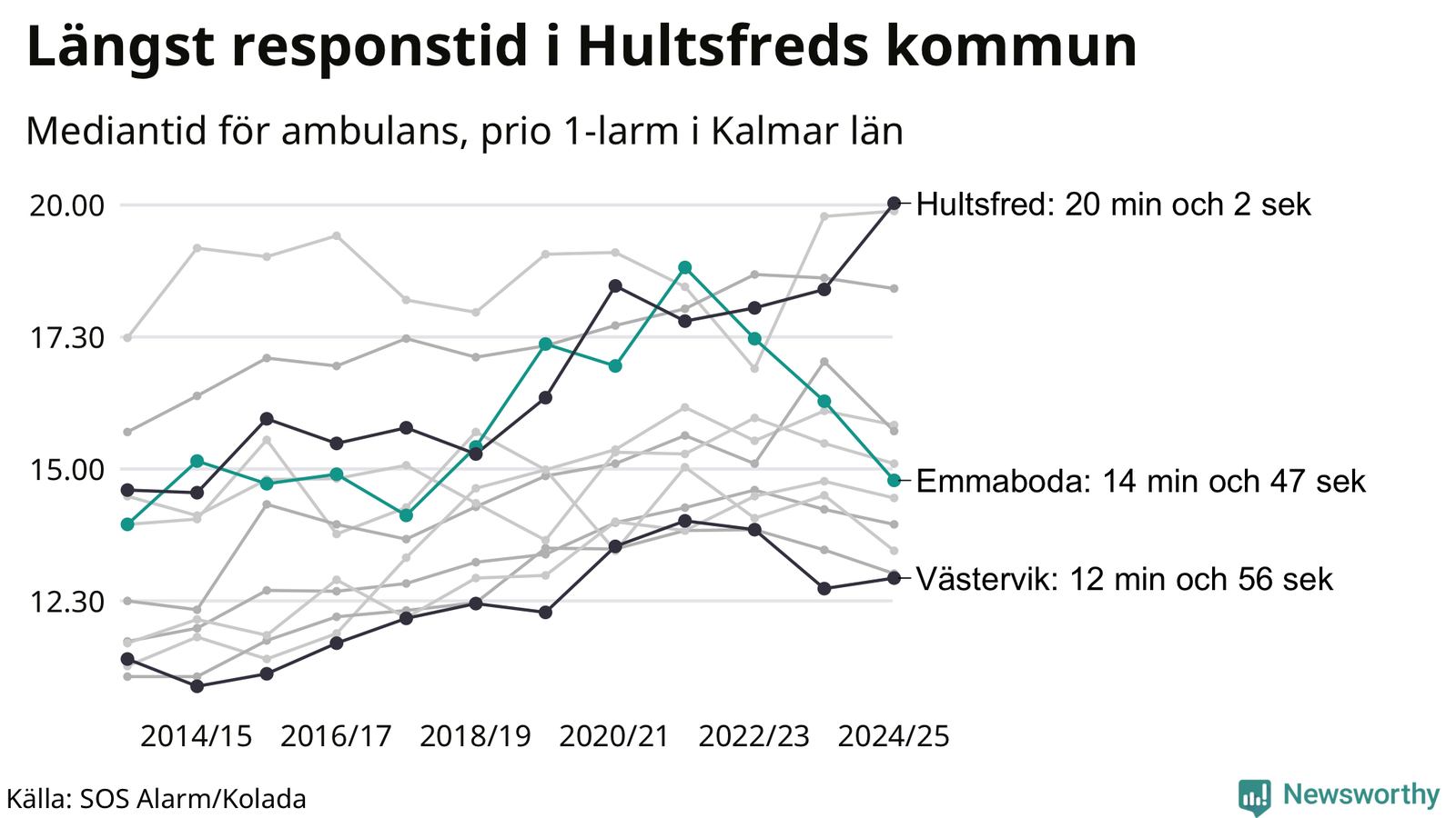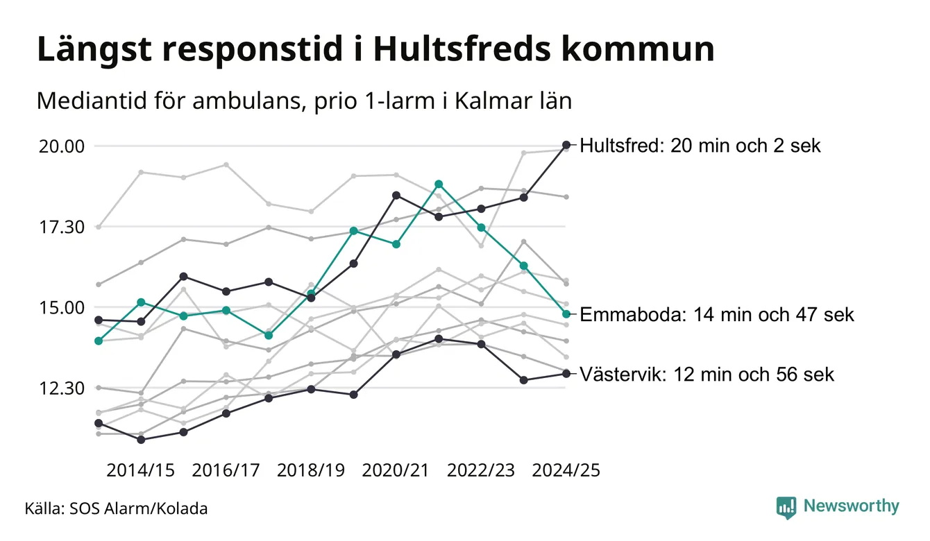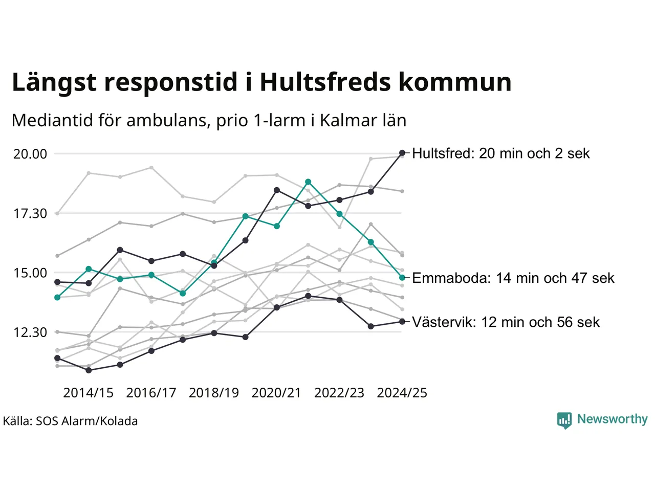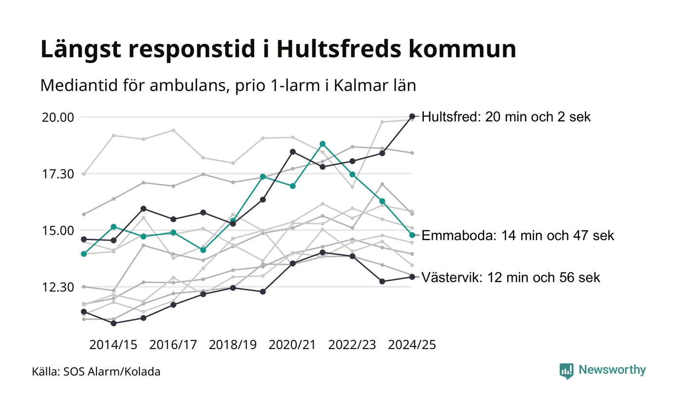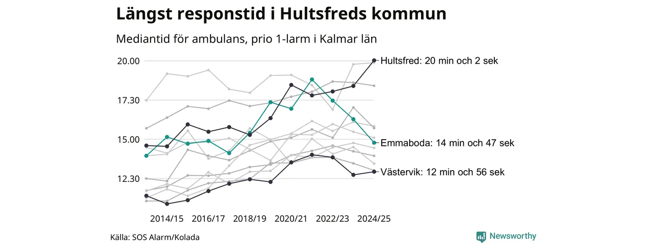 Det tar 14 minuter och 47 sekunder från att 112-samtalet når larmcentralen till att ambulansen är på plats i Emmaboda kommun. Det visar de senaste siffrorna från SOS Alarm. Tiden är en mediantid för alla prio 1-larm mellan 1 juni 2024 och 31 maj 2025 och ett nyckeltal som redovisas varje år.