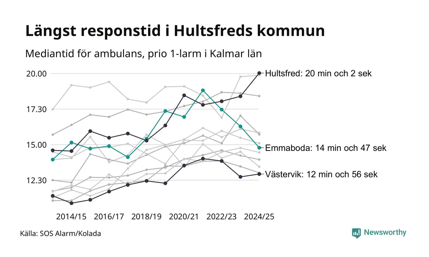 Även om väntan i Hultsfred är lång för att vara Region Kalmar krävs ytterligare 5 minuter och 4 sekunder för att ta sig in på topp tiolistan över kommuerna i landet med längst väntetid. Längst är väntan på ambulans i Pajala kommun, 37 minuter och 55 sekunder. Kommunerna med längst responstid finns i Norrlands inland eller i glesbygd.