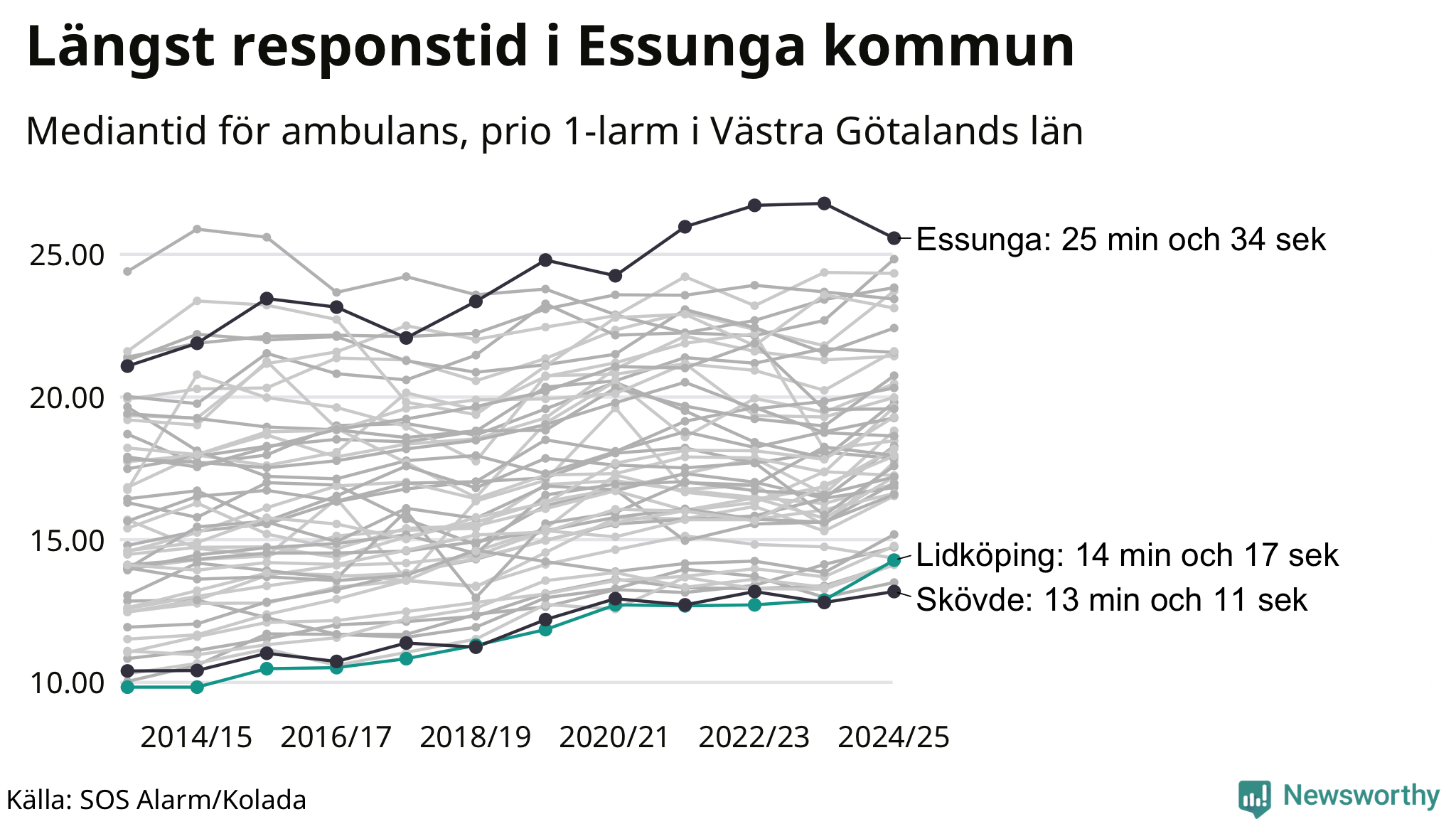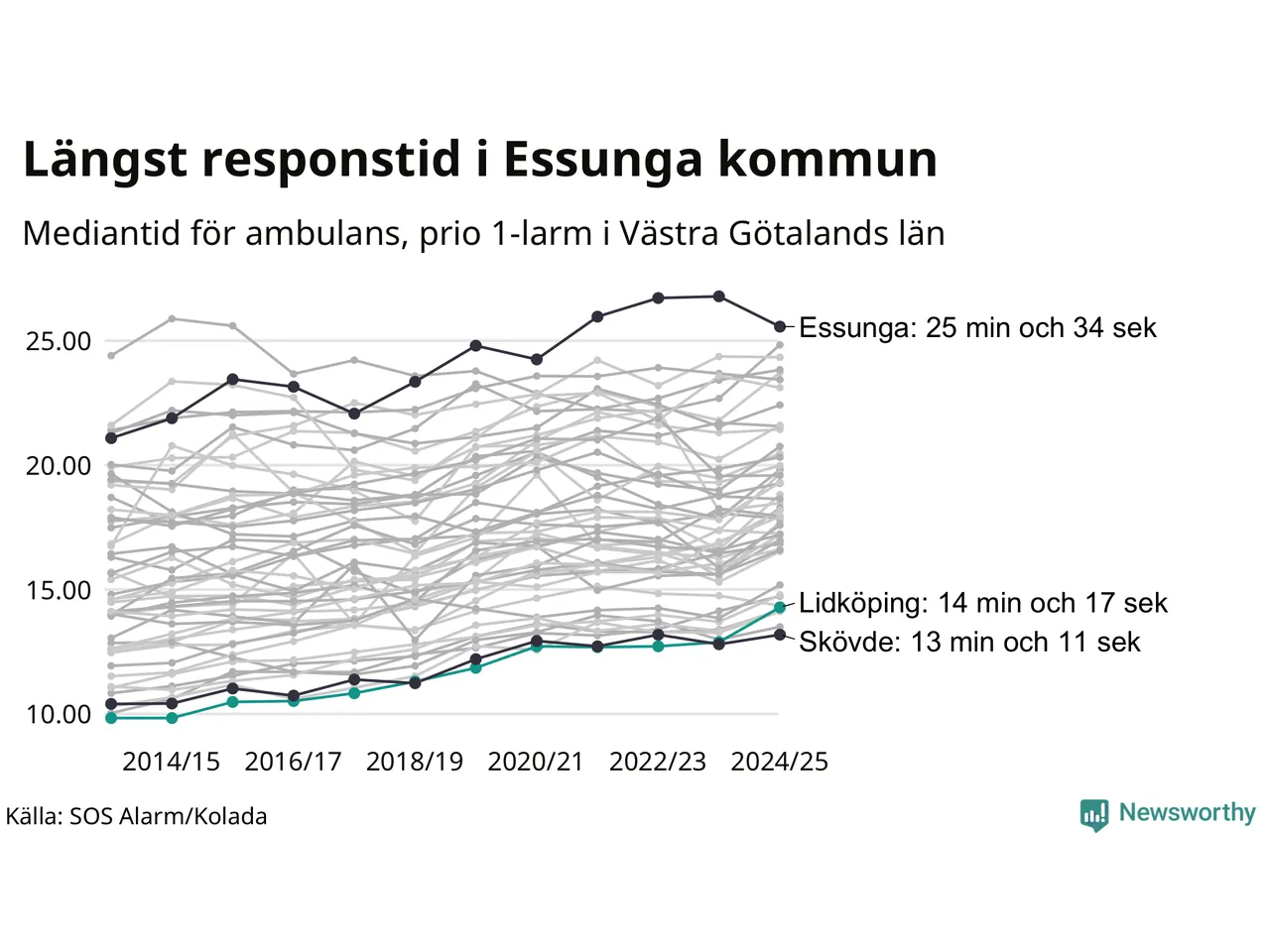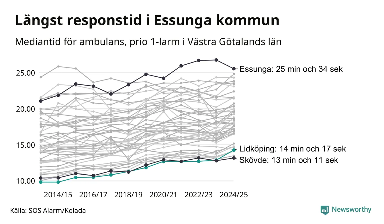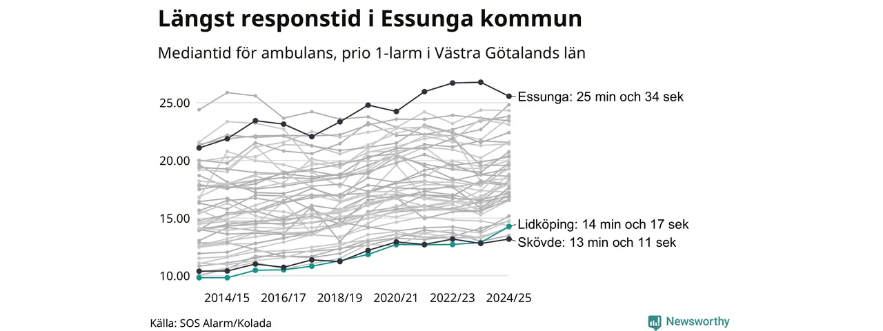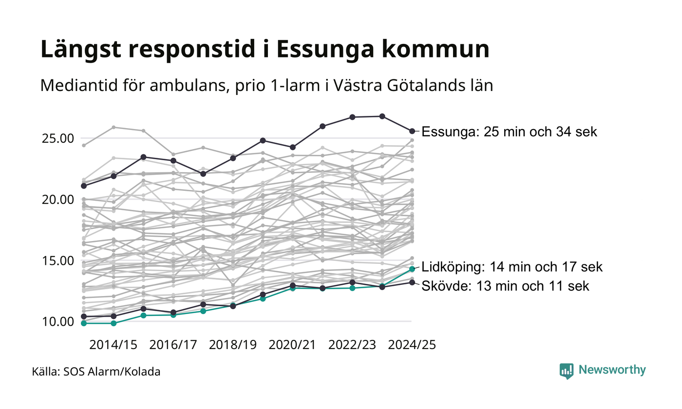 Men Lidköping tillhör inte de kommuner i Västra Götalandsregionen som får vänta längst på ambulans – tvärt om. Längst är väntetiden i Essunga kommun, som också tillhör de tio kommuner i landet som får vänta längst på ambulans: 25 minuter och 34 sekunder. Snabbast var ambulansen framme i Skövde, där det tog 13 minuter och 11 sekunder från larmsamtalet 2024/2025.