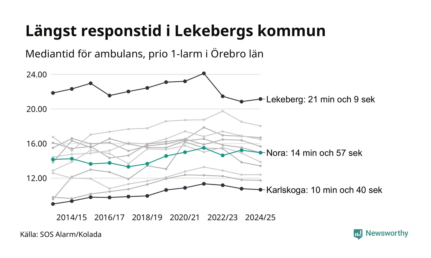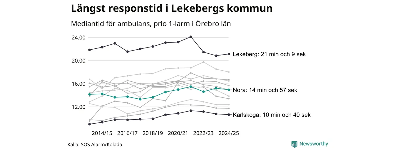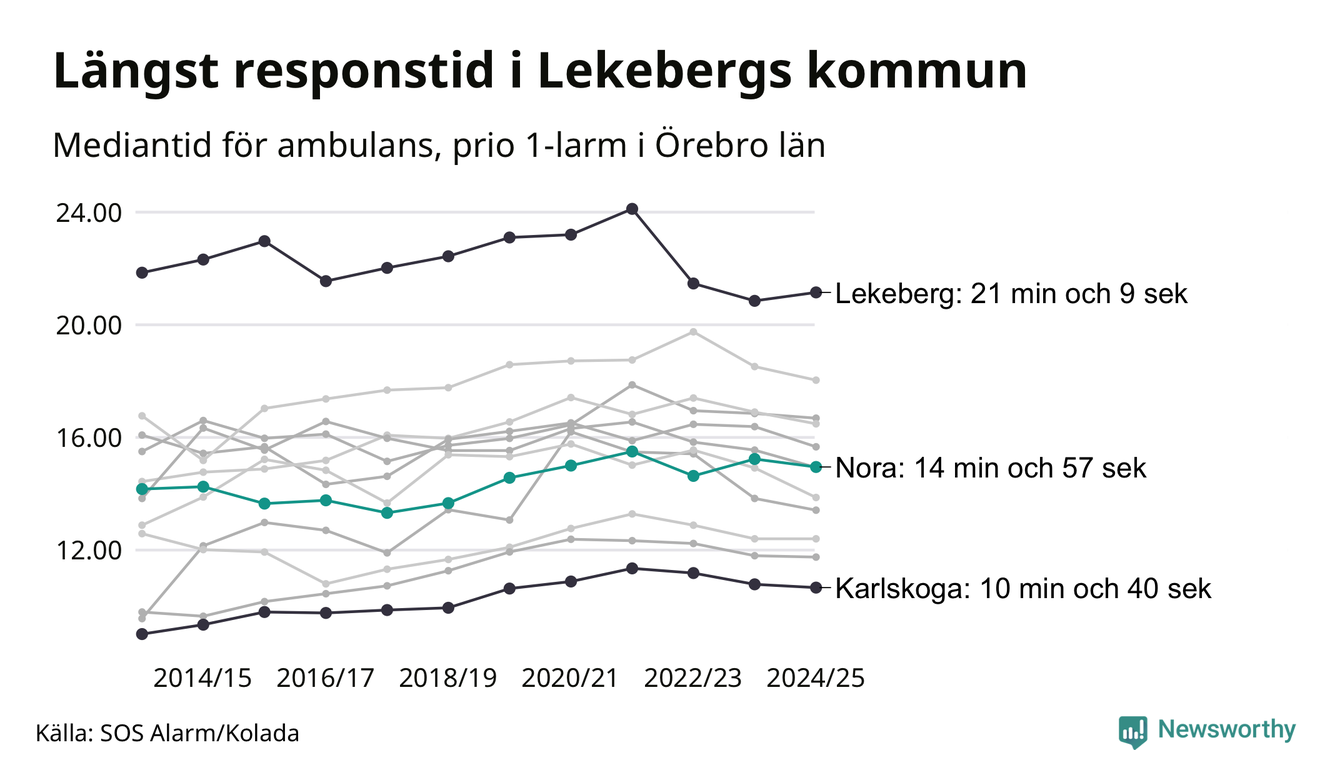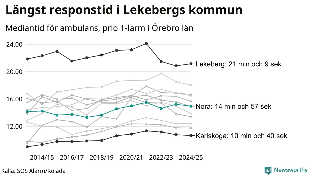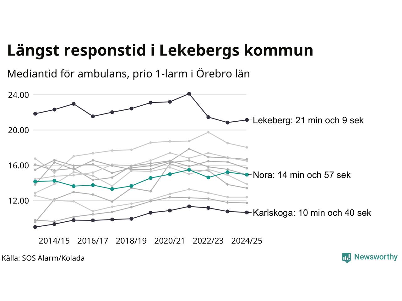 Det tar 14 minuter och 57 sekunder från att 112-samtalet når larmcentralen till att ambulansen är på plats i Nora kommun. Det visar de senaste siffrorna från SOS Alarm. Tiden är en mediantid för alla prio 1-larm mellan 1 juni 2024 och 31 maj 2025 och ett nyckeltal som redovisas varje år.
