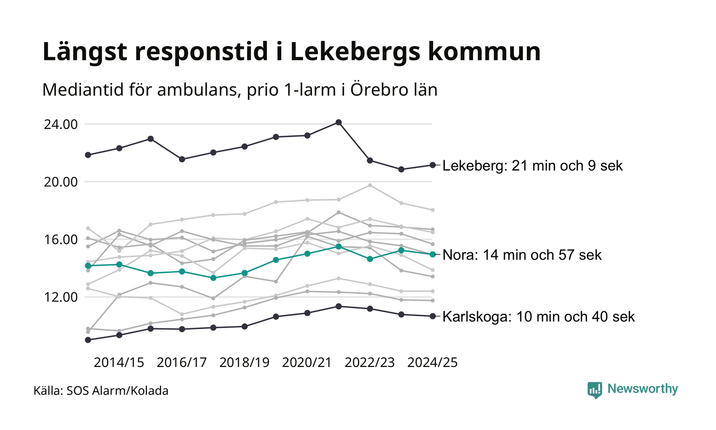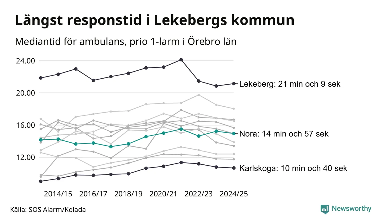 Nora tillhör inte de kommuner i Region Örebro som får vänta längst på ambulans – men inte heller de som får snabbast hjälp. Längst är väntetiden i Lekebergs kommun: 21 minuter och 9 sekunder. Snabbast var ambulansen framme i Karlskoga, där det tog 10 minuter och 40 sekunder från larmsamtalet 2024/2025.