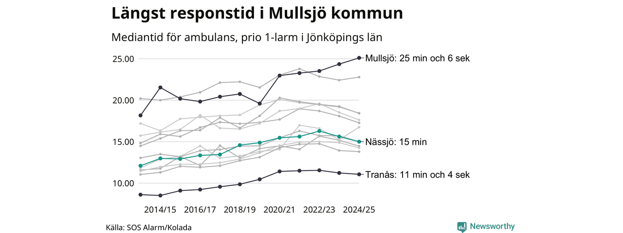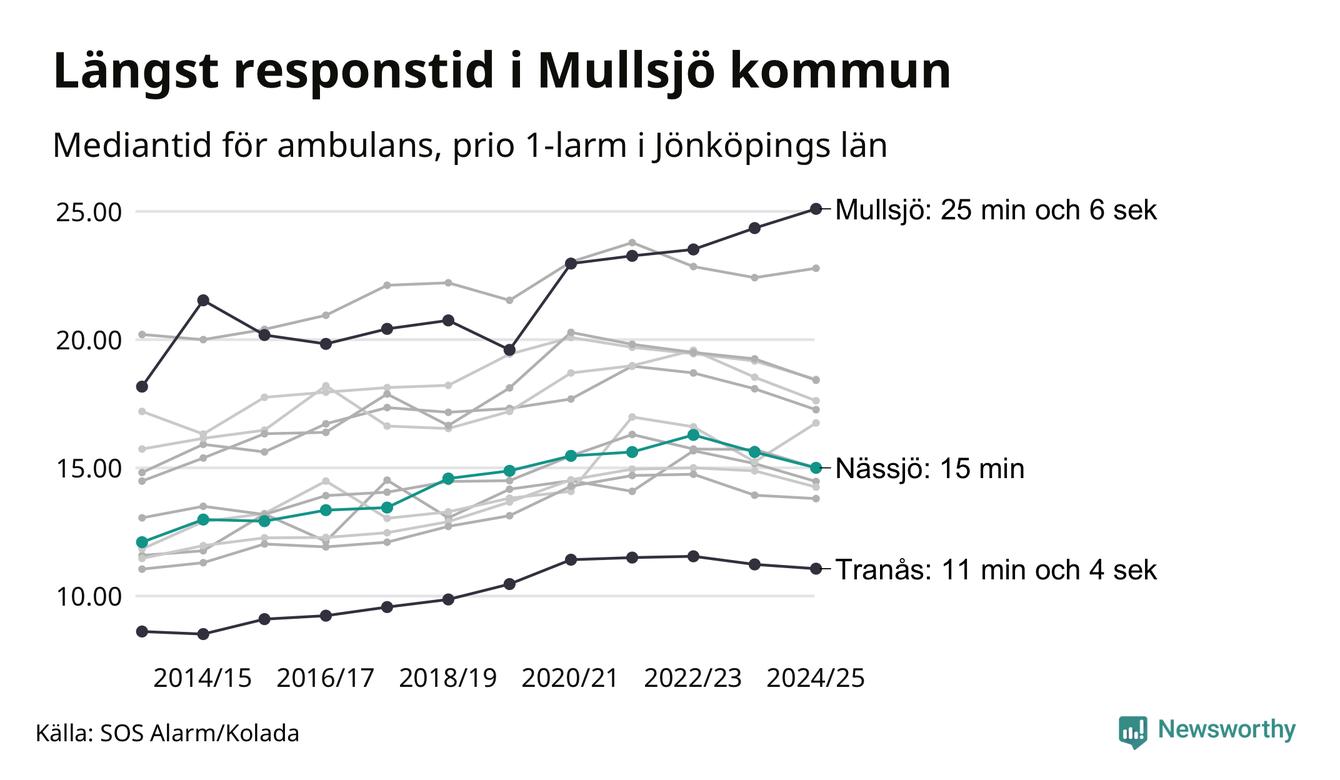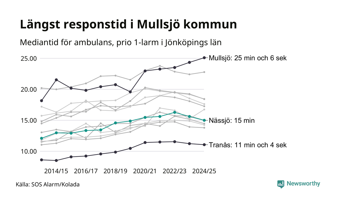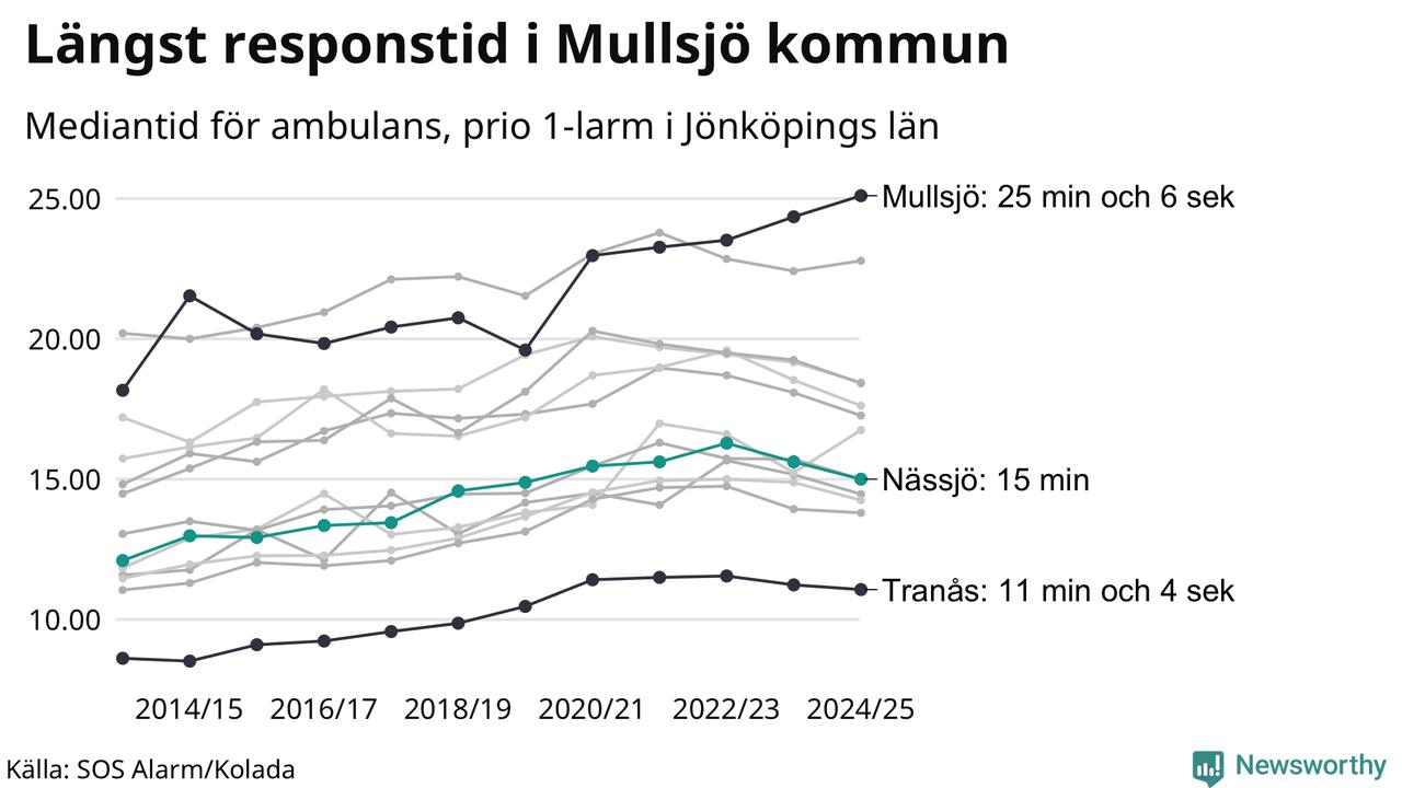 Nässjö tillhör inte de kommuner i Region Jönköping som får vänta längst på ambulans – men inte heller de som får snabbast hjälp. Längst är väntetiden i Mullsjö kommun, som också tillhör de tio kommuner i landet som får vänta längst på ambulans: 25 minuter och 6 sekunder. Snabbast var ambulansen framme i Tranås, där det tog 11 minuter och 4 sekunder från larmsamtalet 2024/2025.