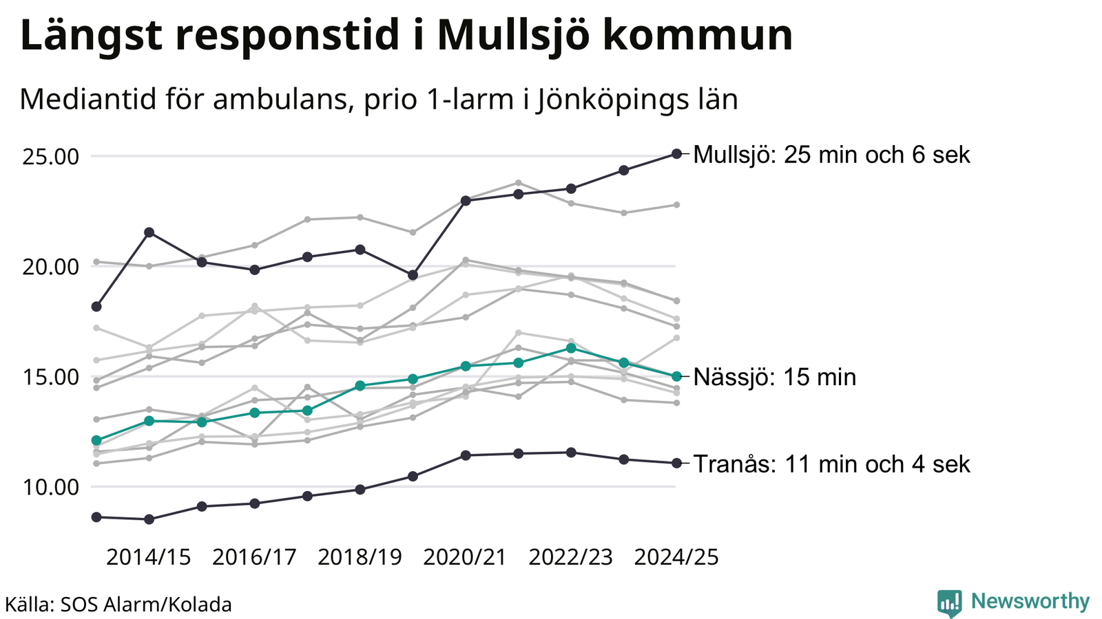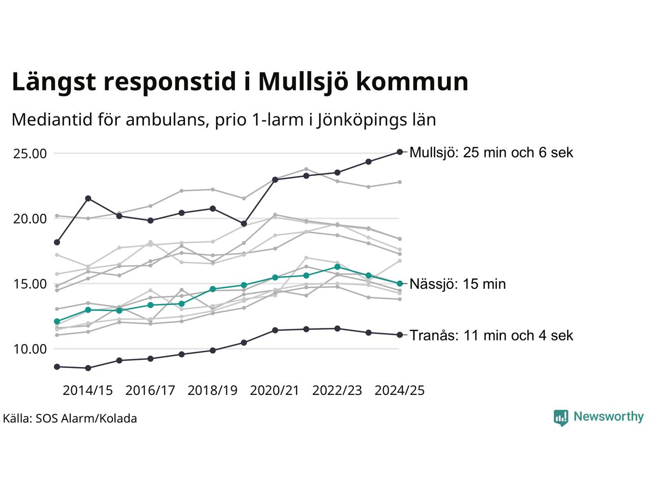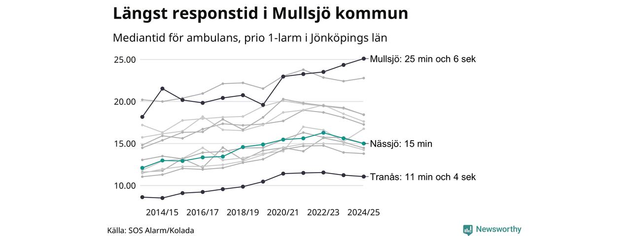 Det tar 15 minuter från att 112-samtalet når larmcentralen till att ambulansen är på plats i Nässjö kommun. Det visar de senaste siffrorna från SOS Alarm. Tiden är en mediantid för alla prio 1-larm mellan 1 juni 2024 och 31 maj 2025 och ett nyckeltal som redovisas varje år.