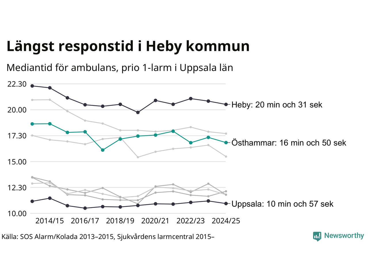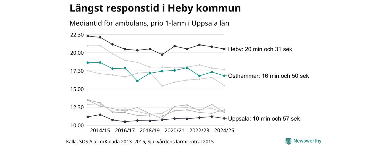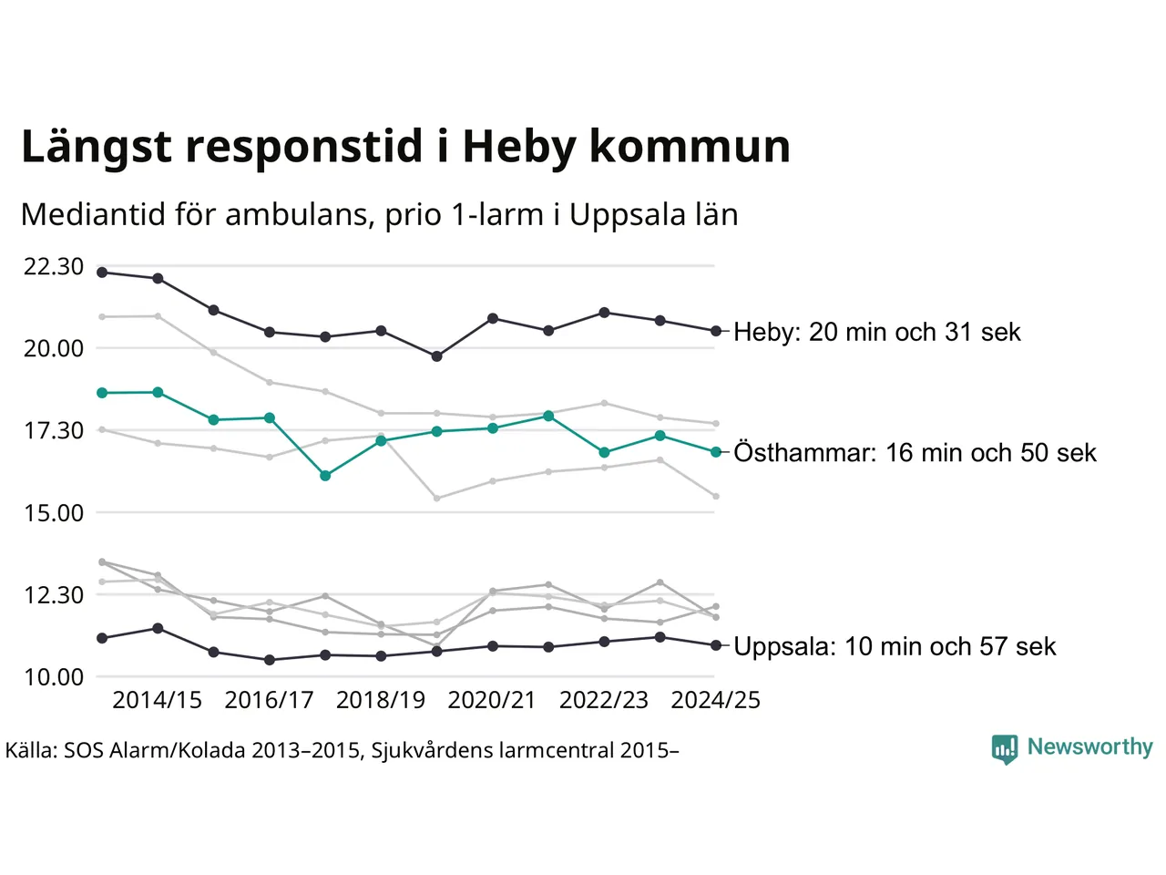 Även om väntan i Heby är lång för att vara Region Uppsala krävs ytterligare 4 minuter och 35 sekunder för att ta sig in på topp tiolistan över kommuerna i landet med längst väntetid. Längst är väntan på ambulans i Pajala kommun, 37 minuter och 55 sekunder. Kommunerna med längst responstid finns i Norrlands inland eller i glesbygd.