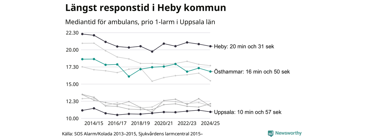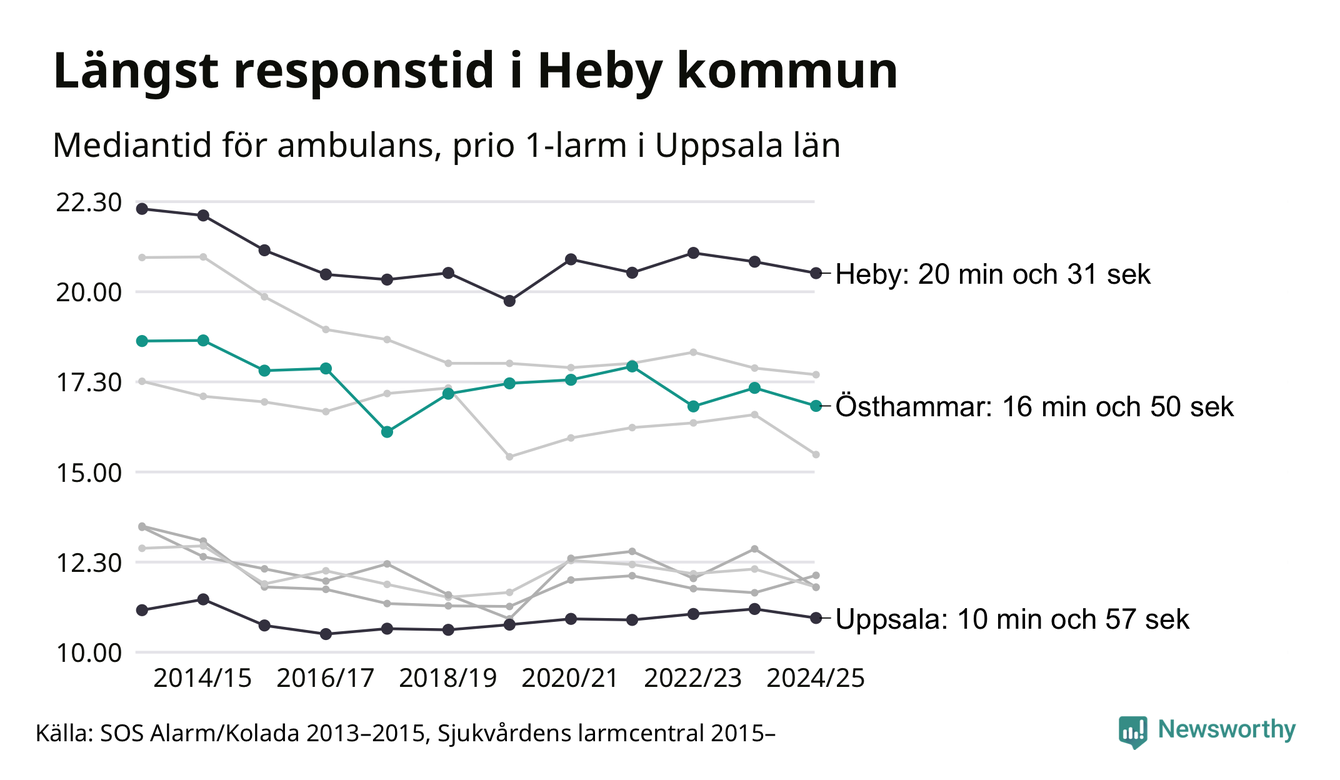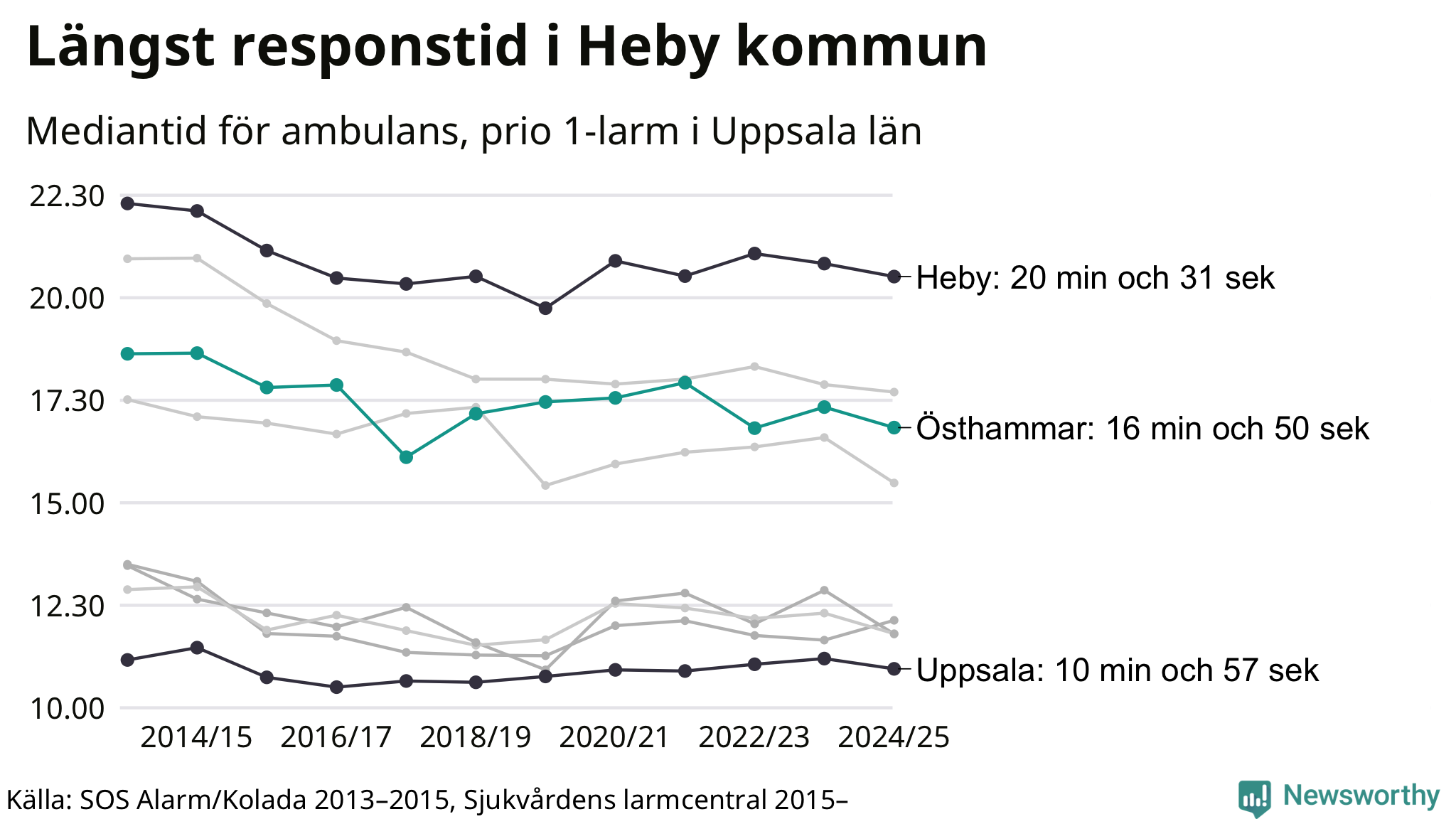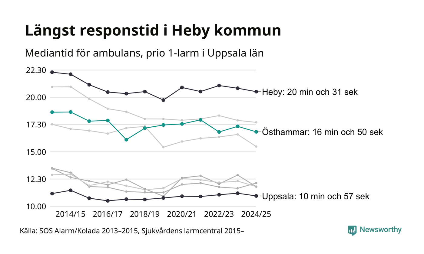 Även om väntan i Heby är lång för att vara Region Uppsala krävs ytterligare 4 minuter och 35 sekunder för att ta sig in på topp tiolistan över kommuerna i landet med längst väntetid. Längst är väntan på ambulans i Pajala kommun, 37 minuter och 55 sekunder. Kommunerna med längst responstid finns i Norrlands inland eller i glesbygd.