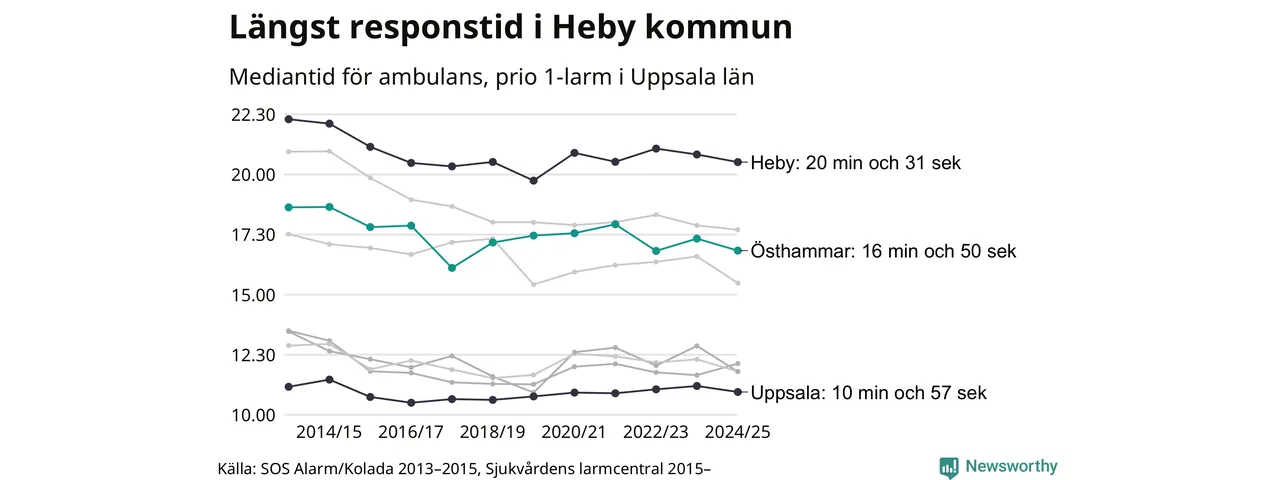 Östhammar tillhör de kommuner i Region Uppsala som får vänta längst på ambulansen. Längst är väntetiden i Heby kommun: 20 minuter och 31 sekunder. Snabbast var ambulansen framme i Uppsala, där det tog 10 minuter och 57 sekunder från larmsamtalet 2024/2025.