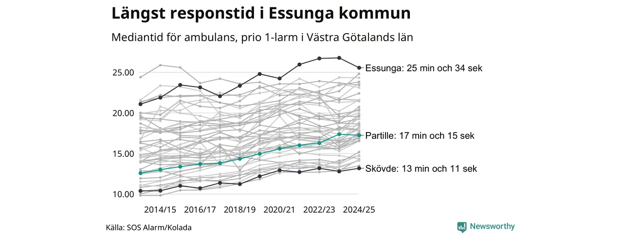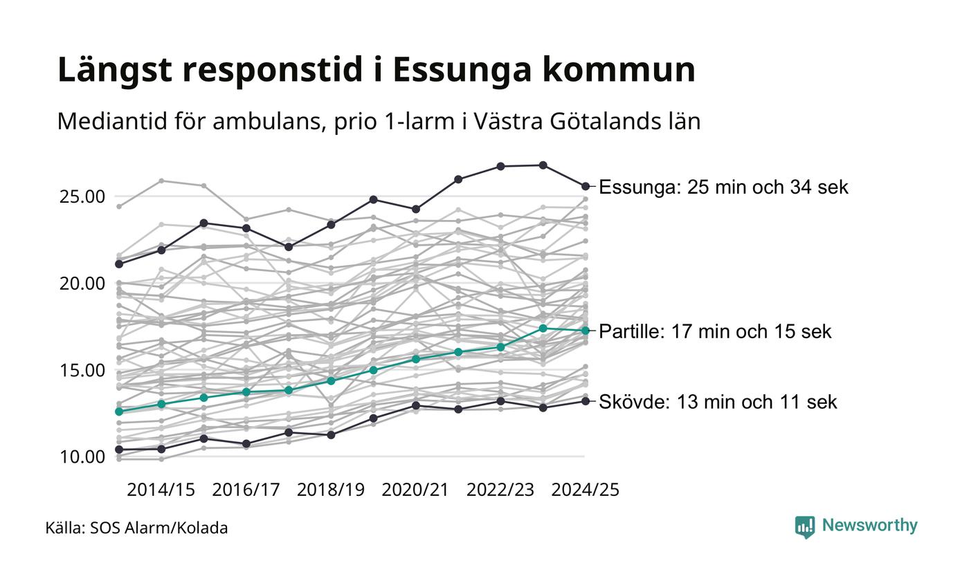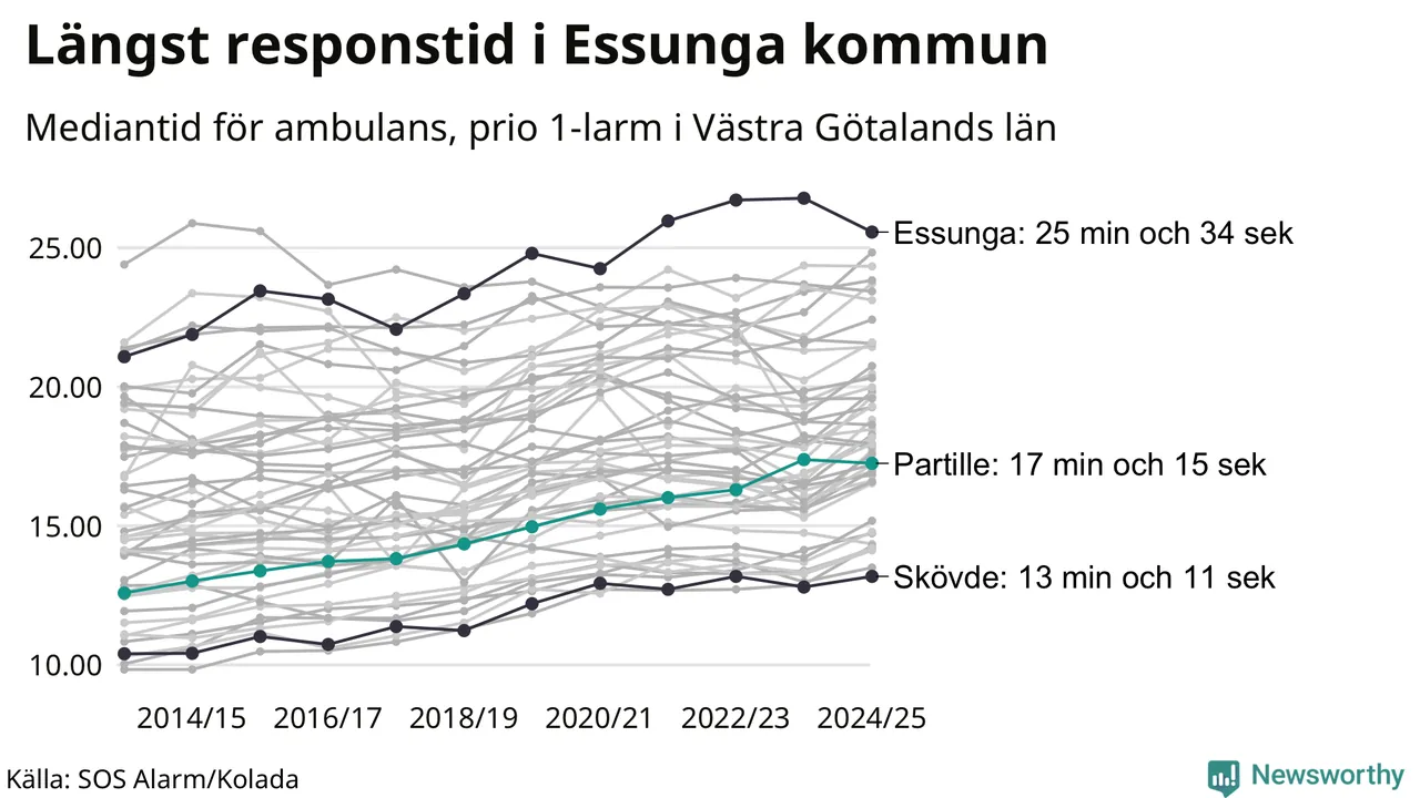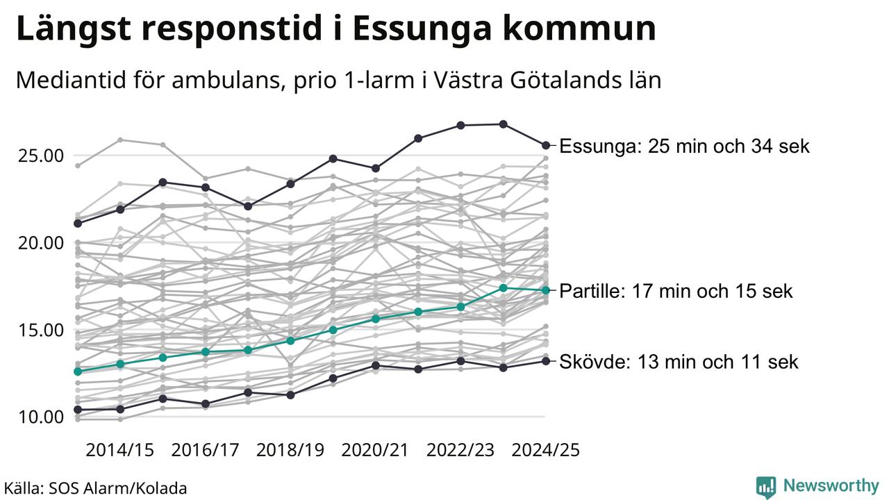 Partille tillhör inte de kommuner i Västra Götalandsregionen som får vänta längst på ambulans – men inte heller de som får snabbast hjälp. Längst är väntetiden i Essunga kommun, som också tillhör de tio kommuner i landet som får vänta längst på ambulans: 25 minuter och 34 sekunder. Snabbast var ambulansen framme i Skövde, där det tog 13 minuter och 11 sekunder från larmsamtalet 2024/2025.