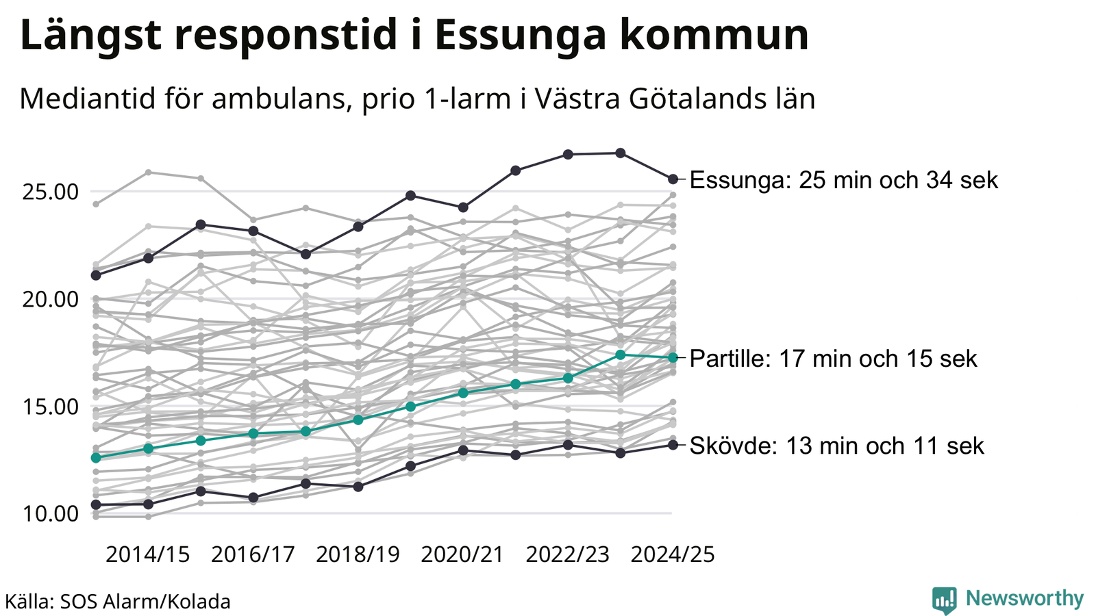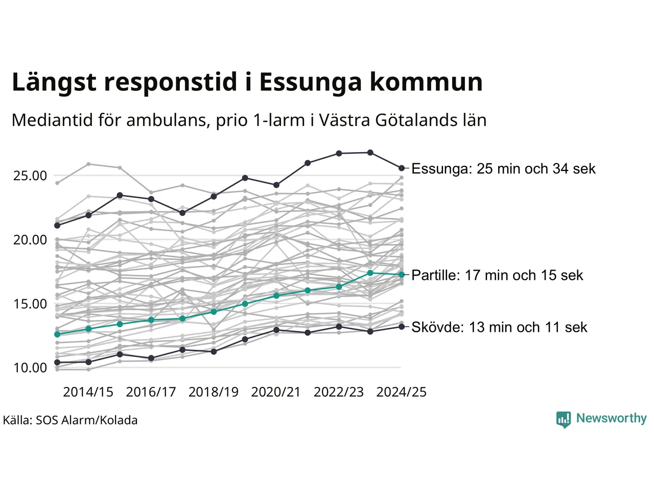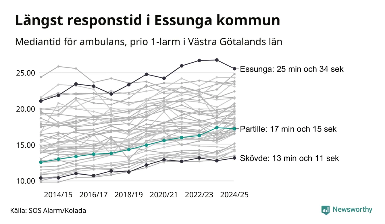 Partille tillhör inte de kommuner i Västra Götalandsregionen som får vänta längst på ambulans – men inte heller de som får snabbast hjälp. Längst är väntetiden i Essunga kommun, som också tillhör de tio kommuner i landet som får vänta längst på ambulans: 25 minuter och 34 sekunder. Snabbast var ambulansen framme i Skövde, där det tog 13 minuter och 11 sekunder från larmsamtalet 2024/2025.