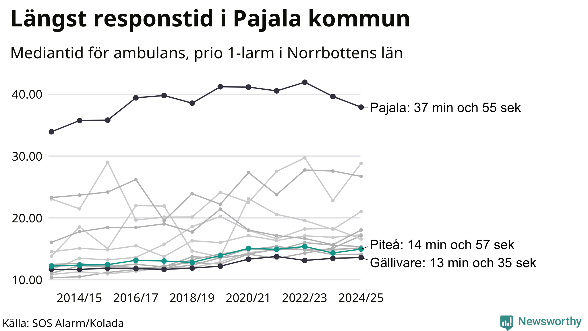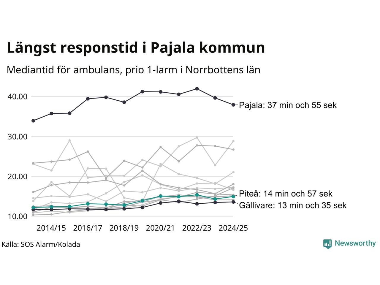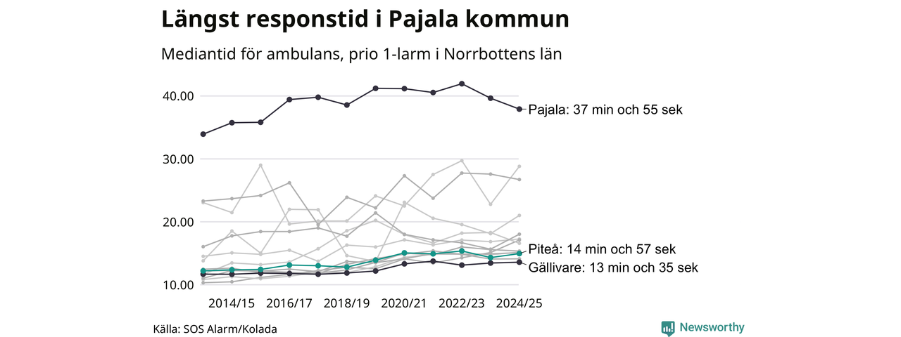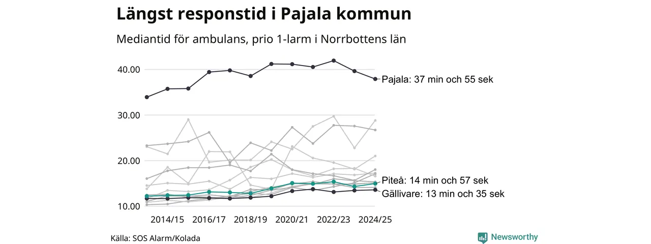 Det tar 14 minuter och 57 sekunder från att 112-samtalet når larmcentralen till att ambulansen är på plats i Piteå kommun. Det visar de senaste siffrorna från SOS Alarm. Tiden är en mediantid för alla prio 1-larm mellan 1 juni 2024 och 31 maj 2025 och ett nyckeltal som redovisas varje år.