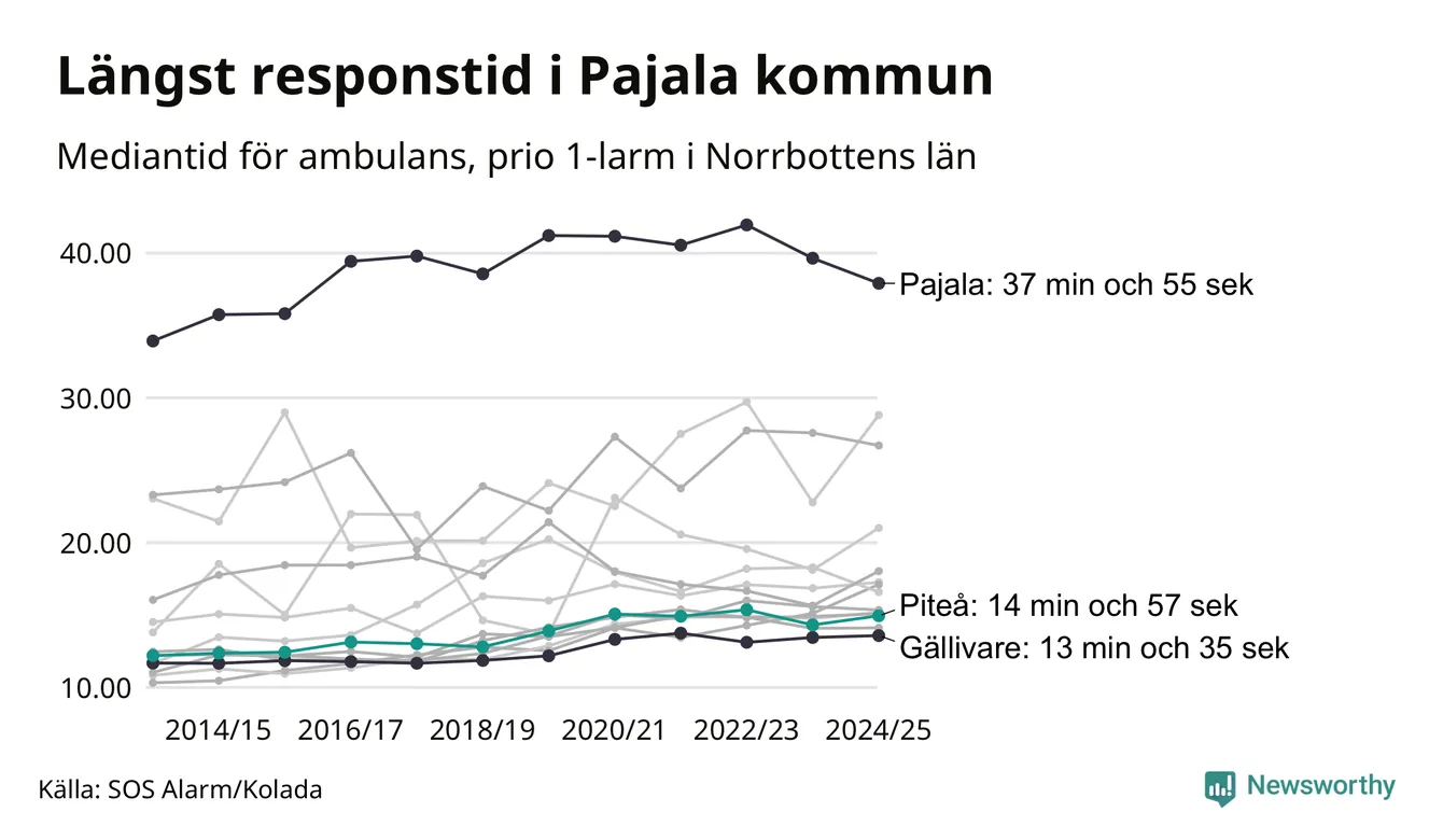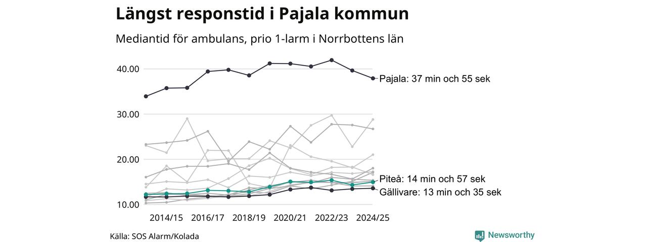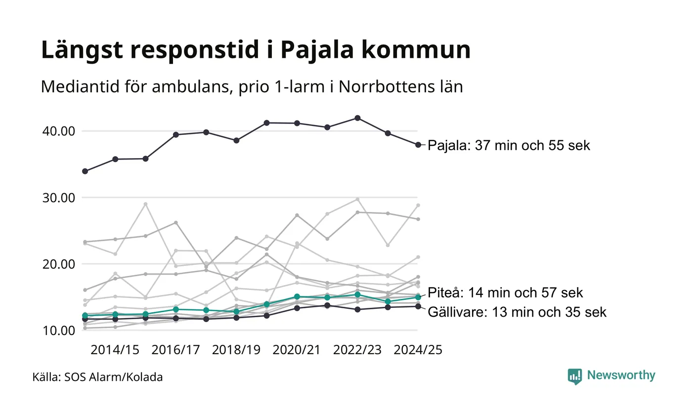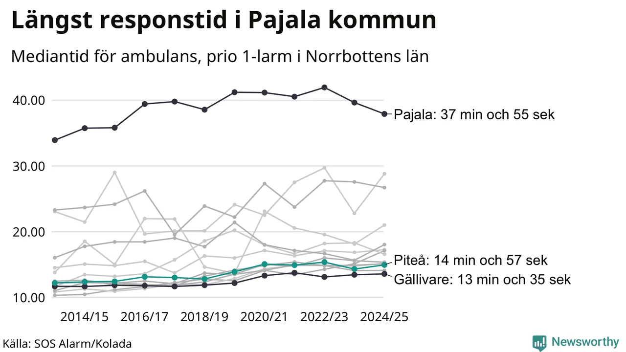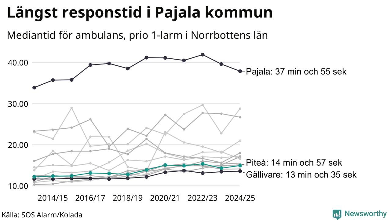 Men Piteå tillhör inte de kommuner i Region Norrbotten som får vänta längst på ambulans – tvärt om. Längst är väntetiden i Pajala kommun, som också är den kommun i hela landet som får vänta längst på ambulans: 37 minuter och 55 sekunder. Snabbast var ambulansen framme i Gällivare, där det tog 13 minuter och 35 sekunder från larmsamtalet 2024/2025.