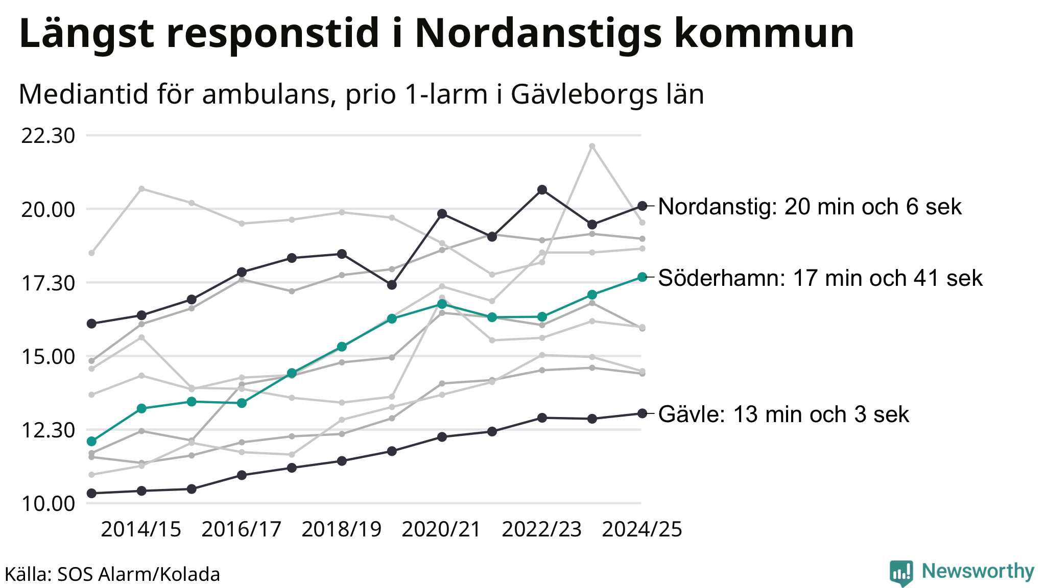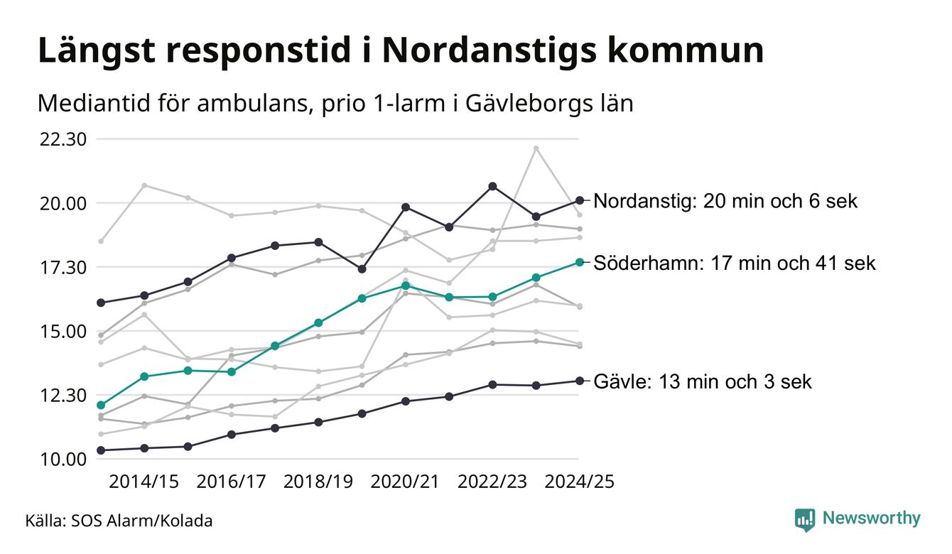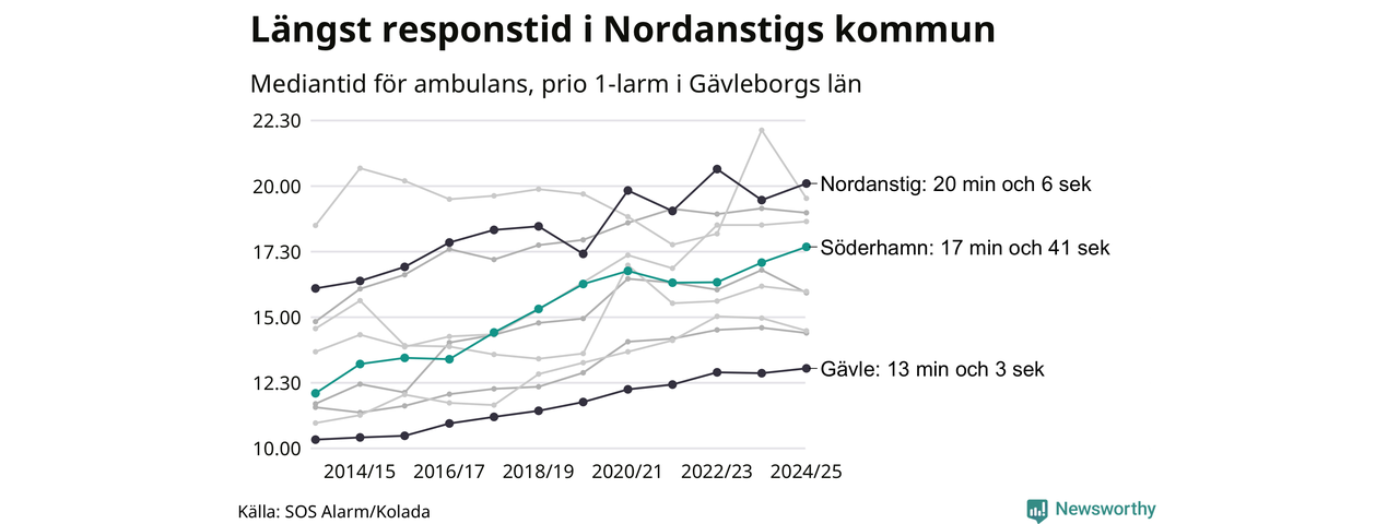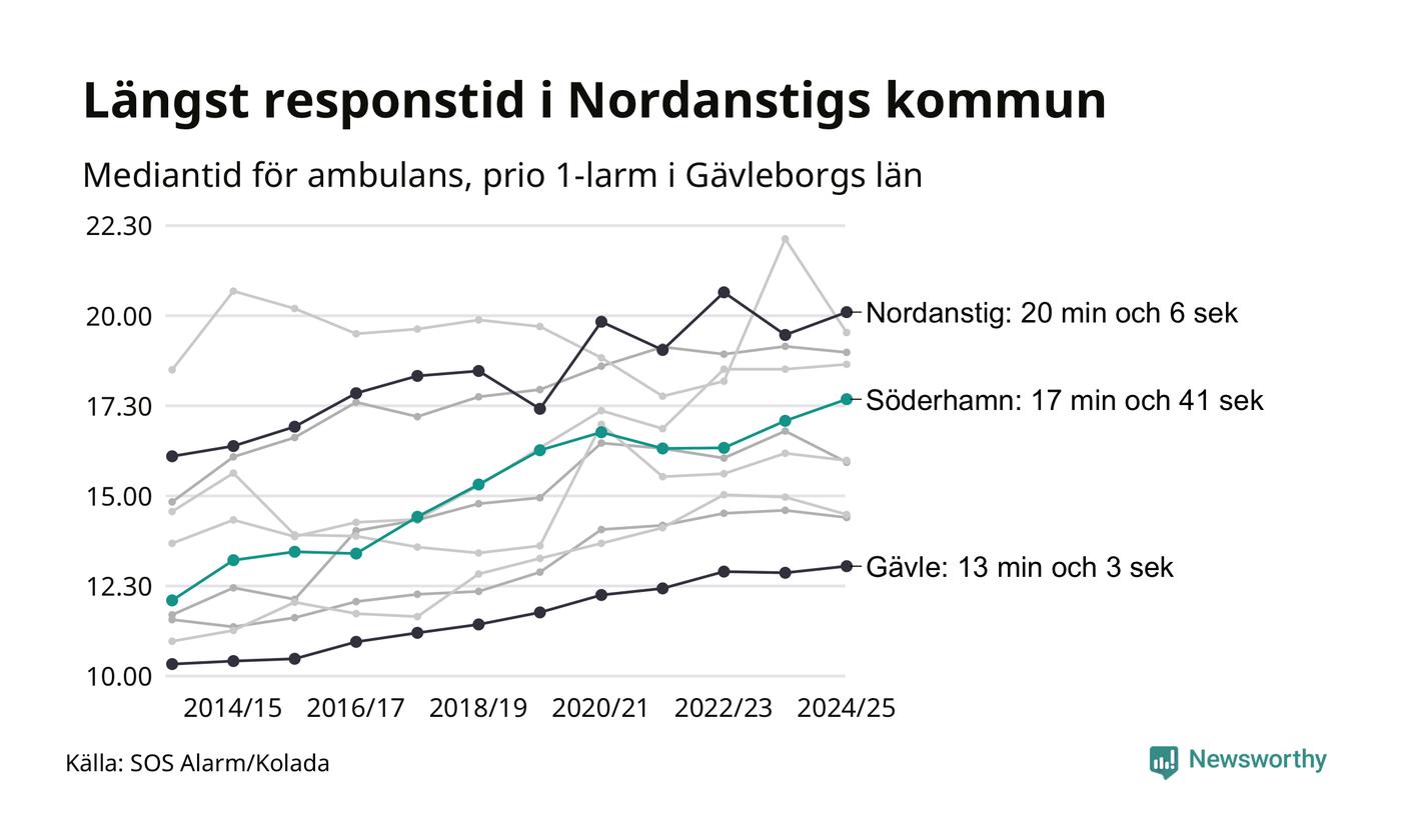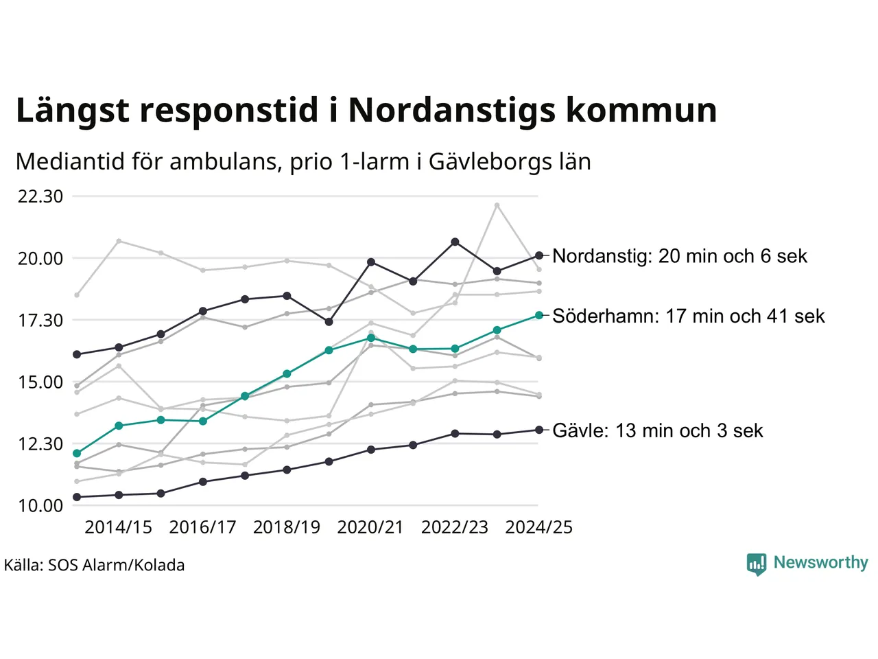Även om väntan i Nordanstig är lång för att vara Region Gävleborg krävs ytterligare 5 minuter för att ta sig in på topp tiolistan över kommuerna i landet med längst väntetid. Längst är väntan på ambulans i Pajala kommun, 37 minuter och 55 sekunder. Kommunerna med längst responstid finns i Norrlands inland eller i glesbygd.